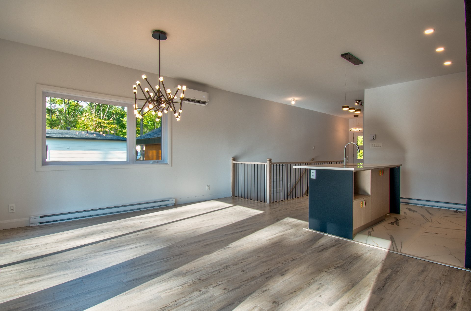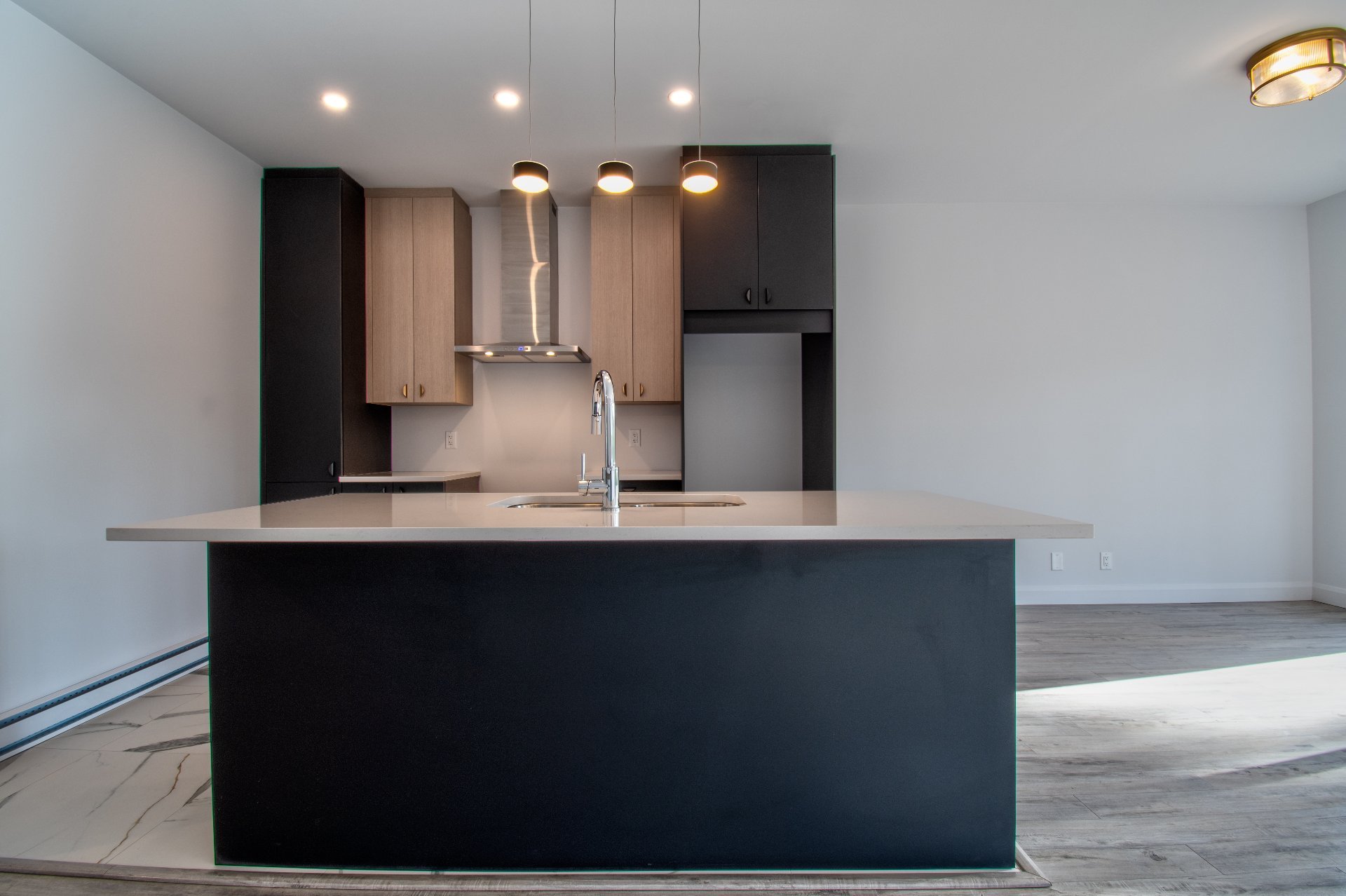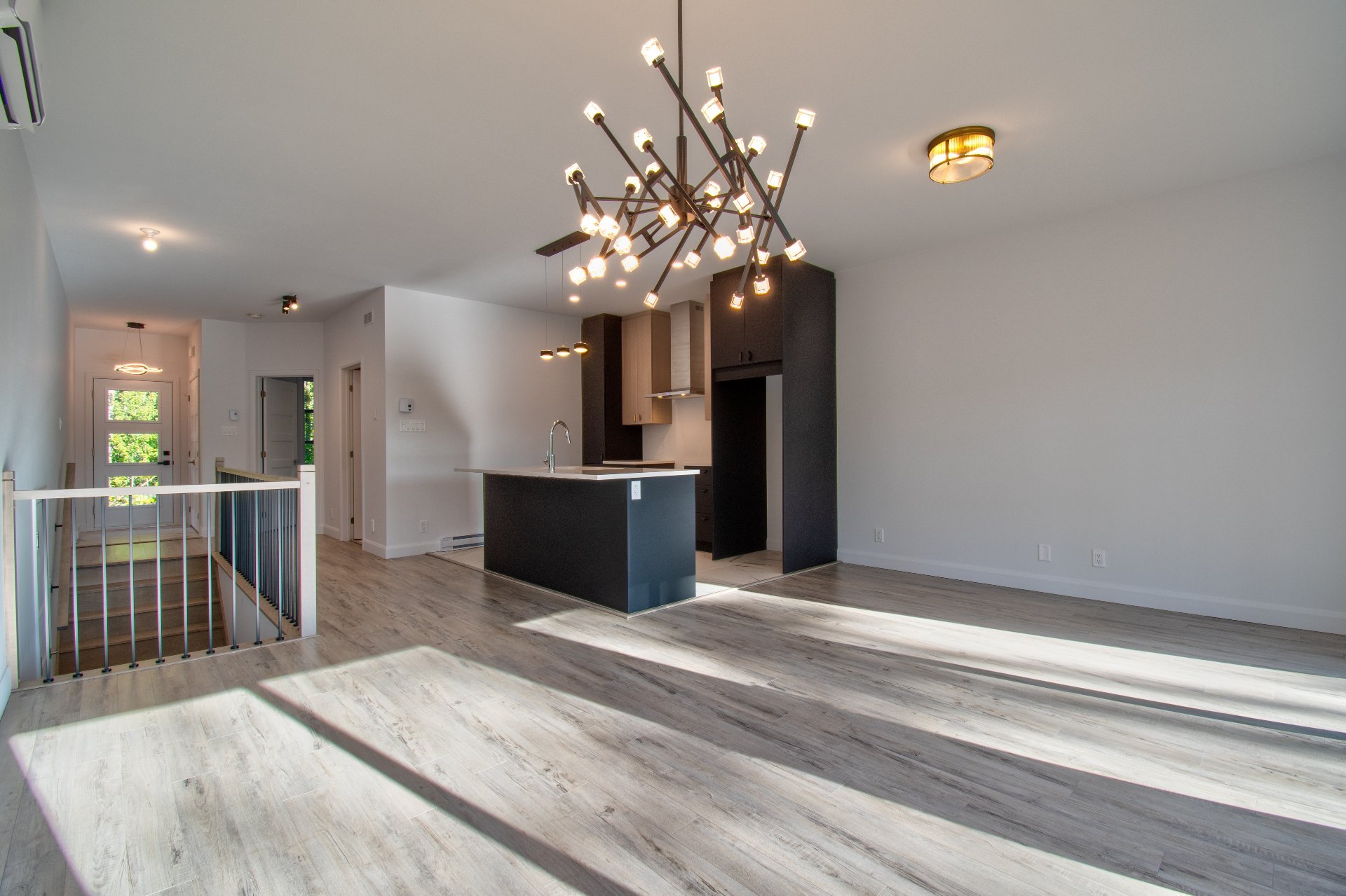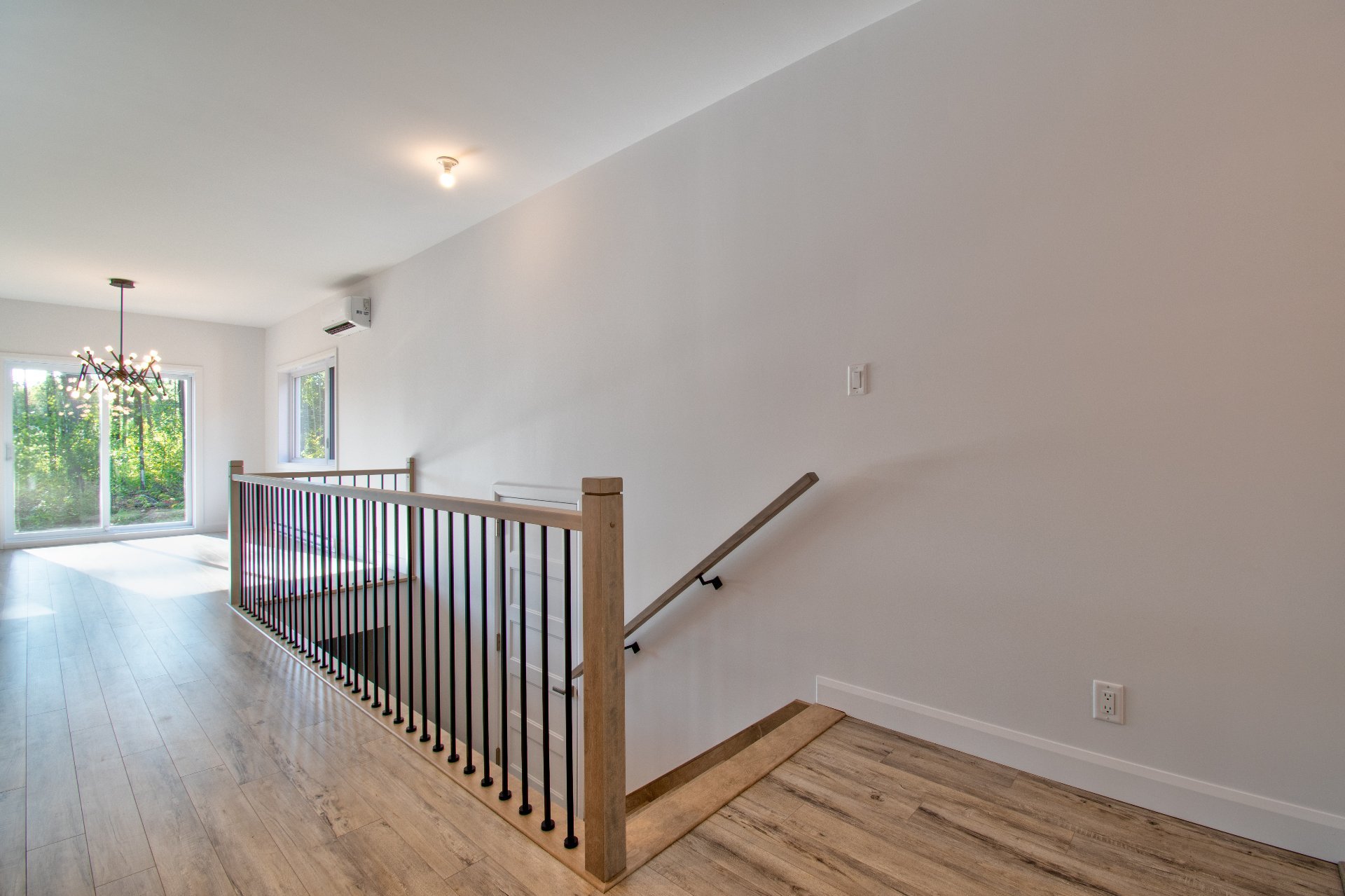 Cherry wood staircase on ground floor, black metal rungs - Island with double sink, modern faucets - Electrical outlet for future vehicle terminal connection - Lighting budget - 9-foot ceilings on ground floor, 8 elsewhere - Residential construction warranty - 2 copies of certificate of location - 2x 7-foot patio doors on ground floor - 18ftx4ft balcony - garage door motor