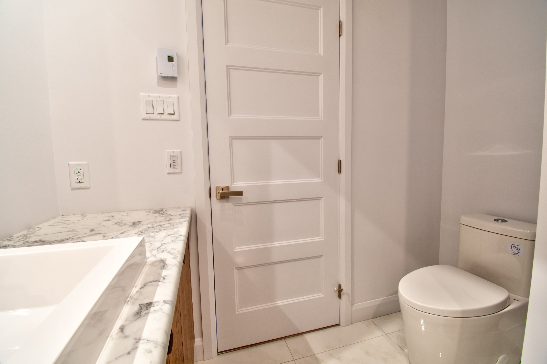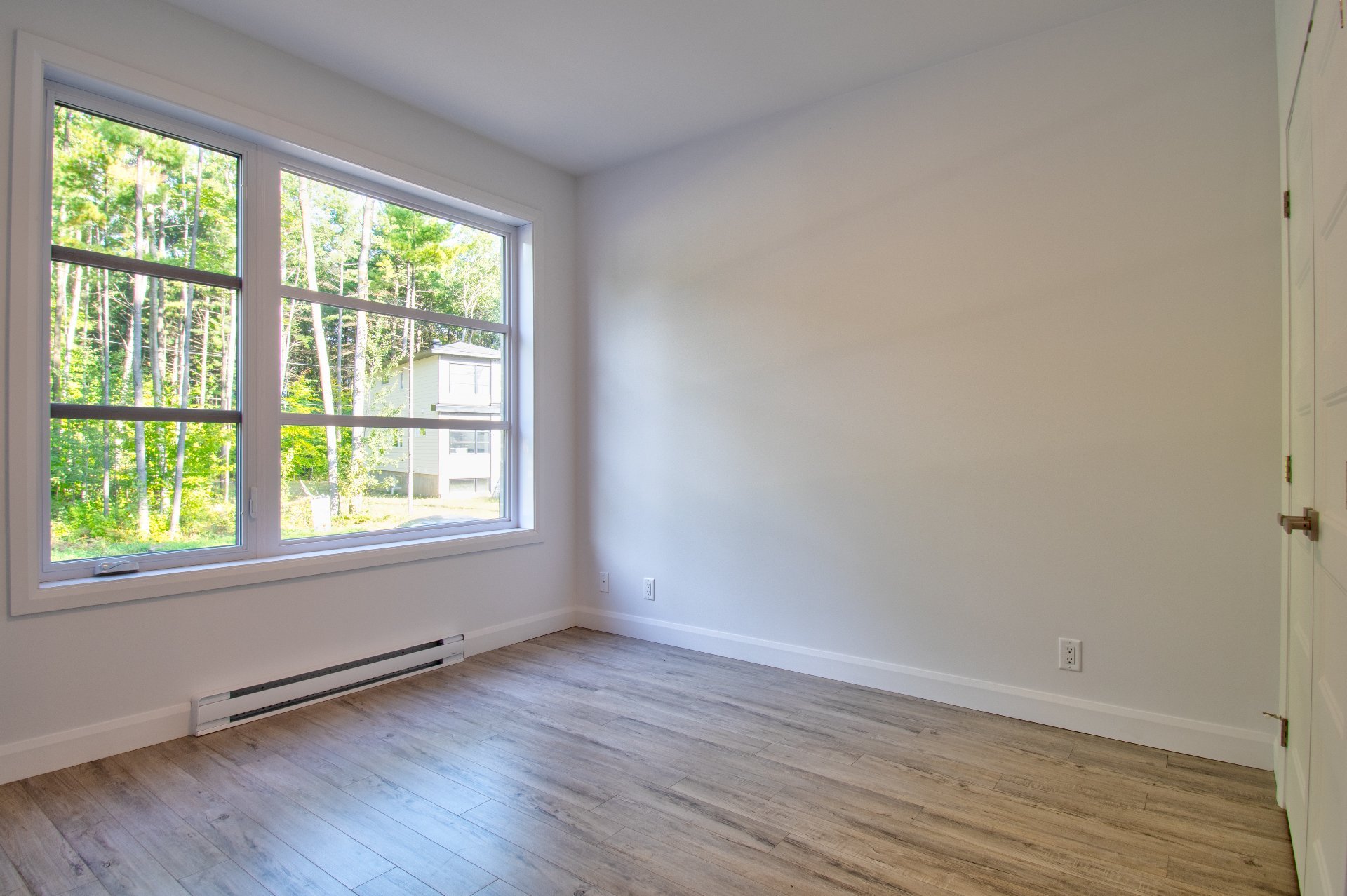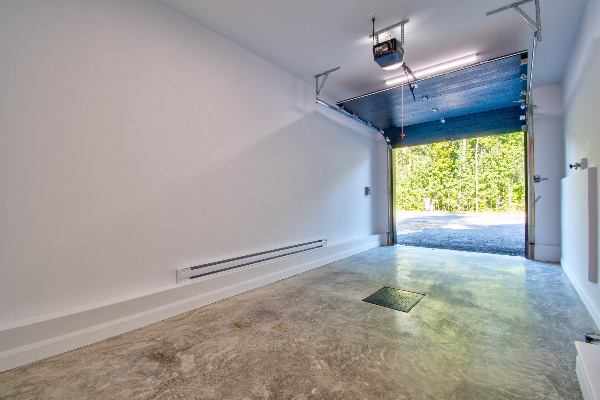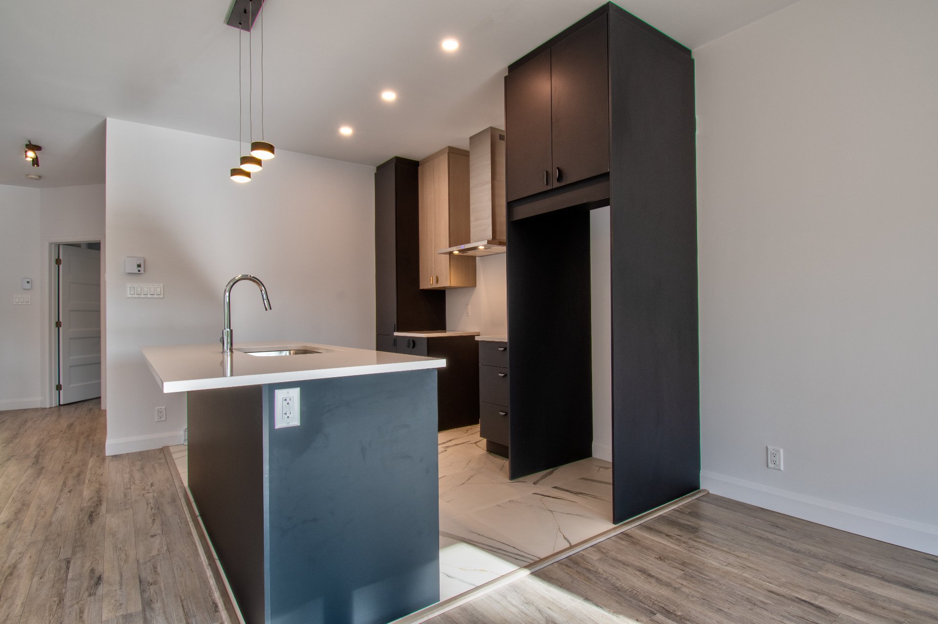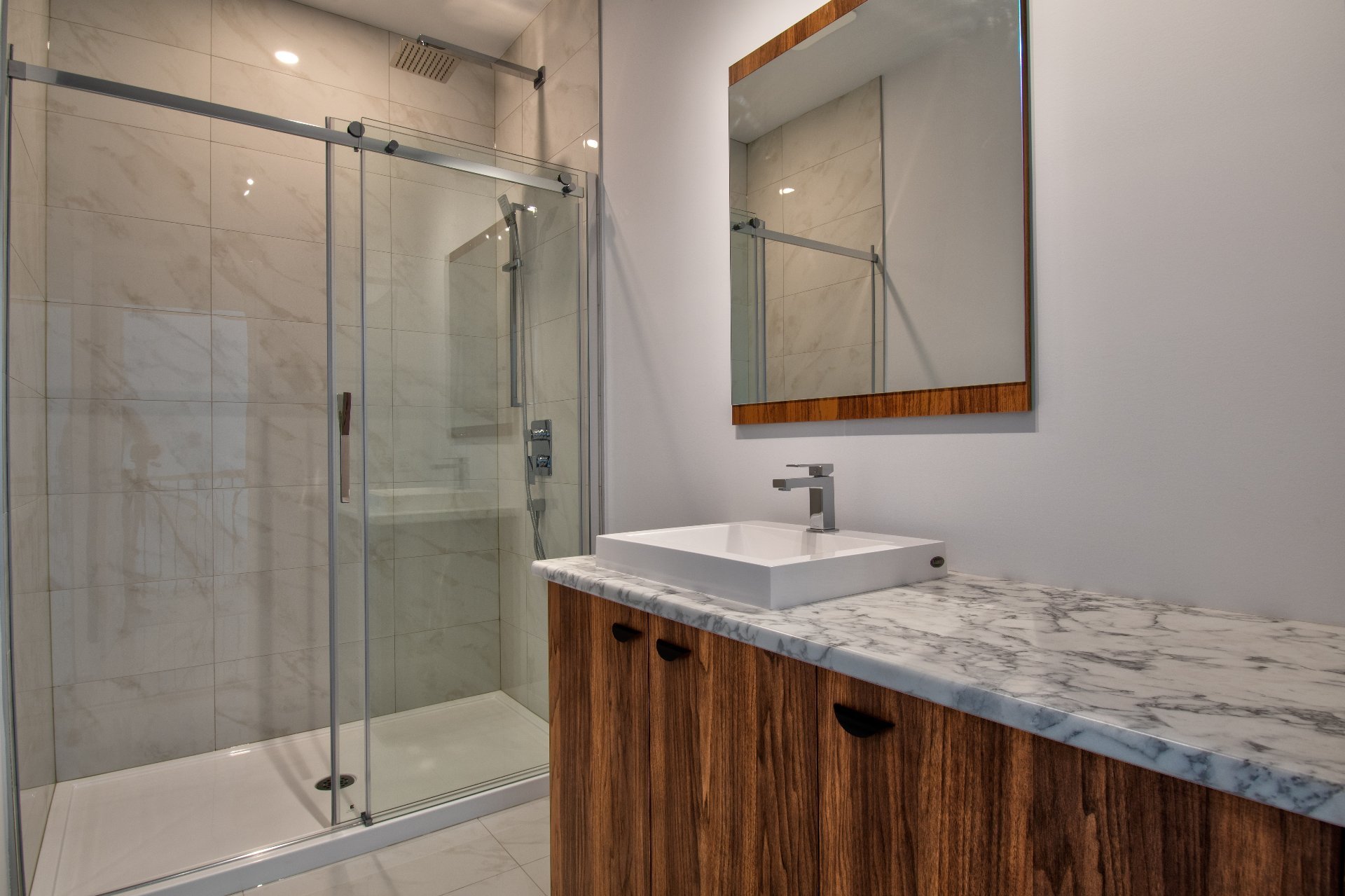 Cherry wood staircase on ground floor, black metal rungs - Island with double sink, modern faucets - Electrical outlet for future vehicle terminal connection - Lighting budget - 9-foot ceilings on ground floor, 8 elsewhere - Residential construction warranty - 2 copies of certificate of location - 2x 7-foot patio doors on ground floor - 18ftx4ft balcony - garage door motor