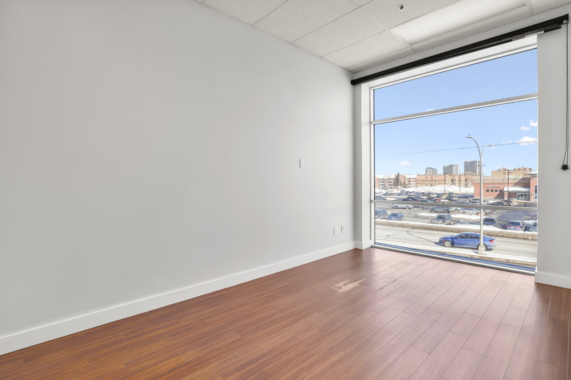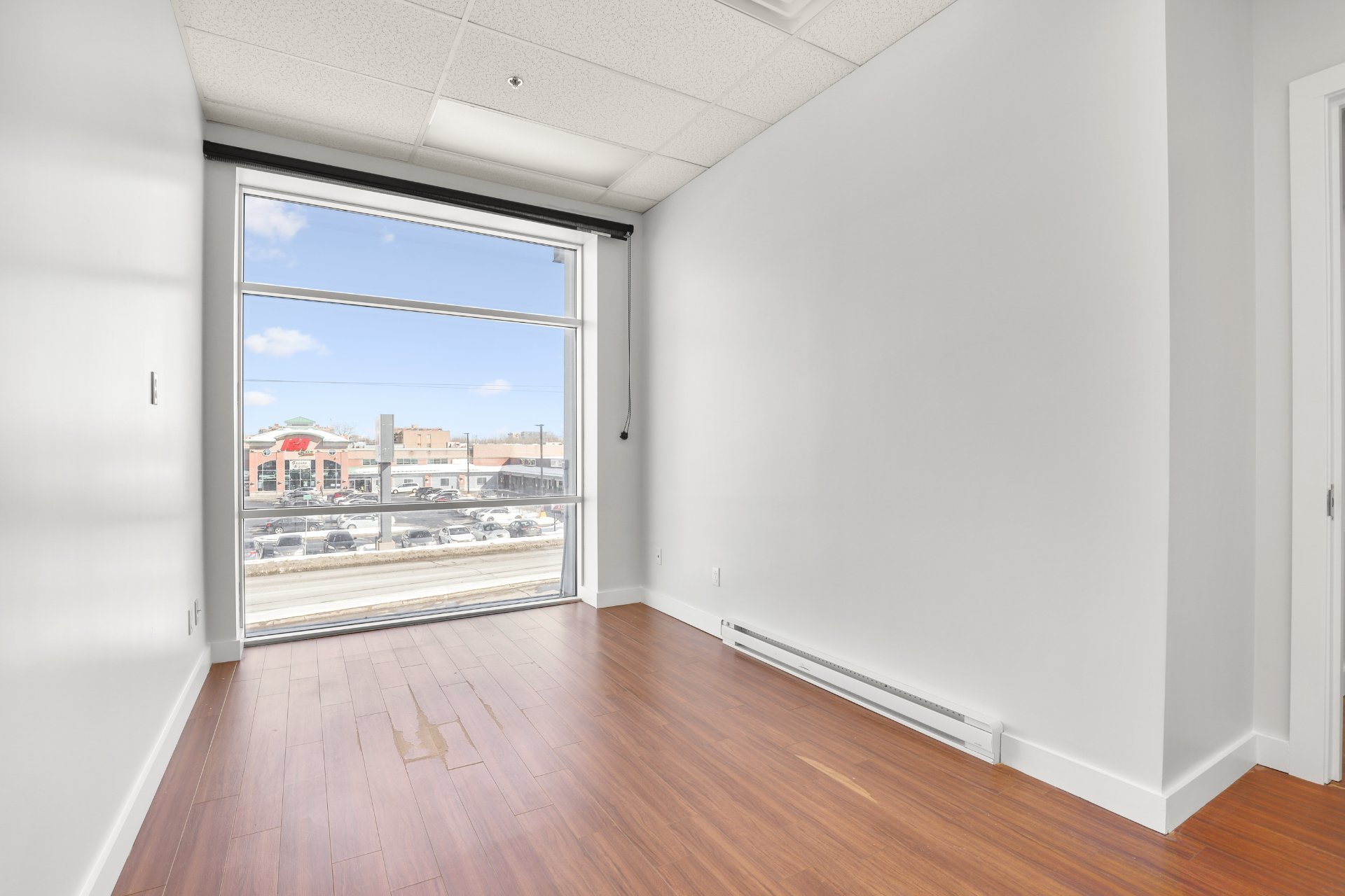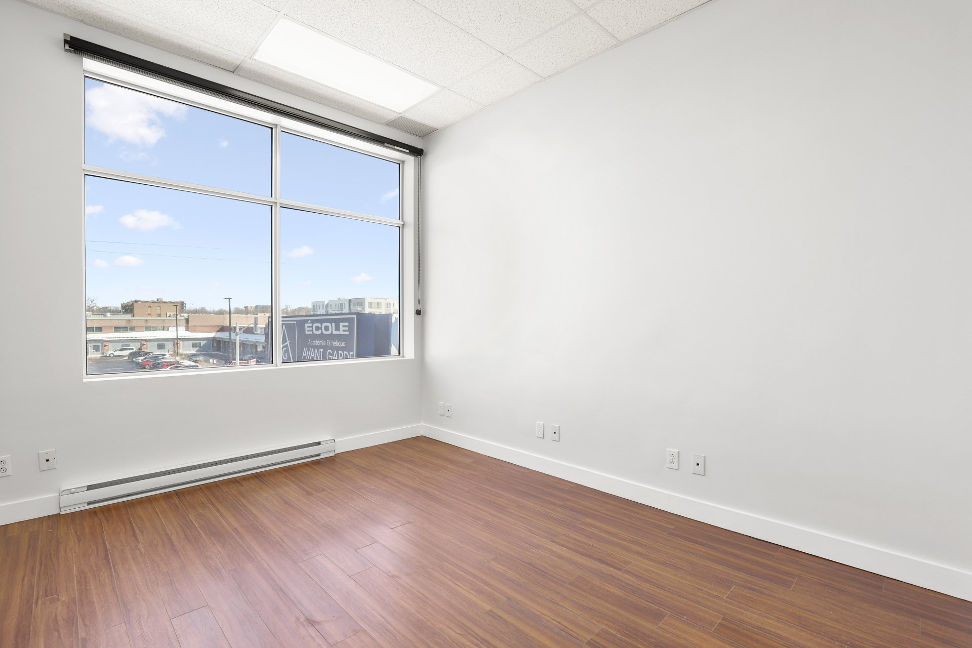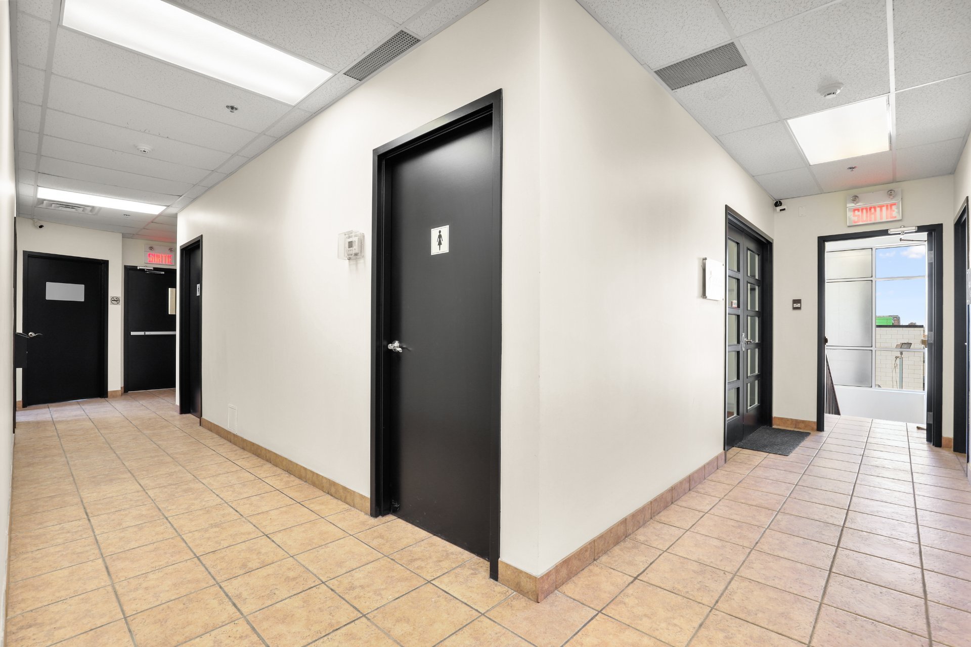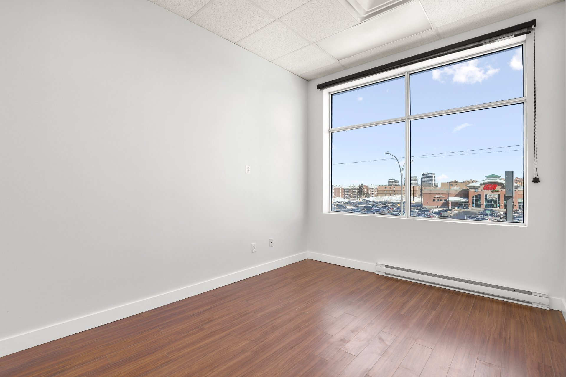 Unit 20.03 includes eight (8) offices, one (1) conference room, and one (1) storage space with doors and locks. It also features one (1) kitchen equipped with a sink built into a granite countertop, a granite wall counter, and wall-mounted cabinets above the sink. Shared restrooms are available on the same floor. The unit comes with two (2) reserved parking spaces, and visitor parking is also available. Hydro-Québec fees (heating and electricity), snow removal, and maintenance of common areas are included in the rent.