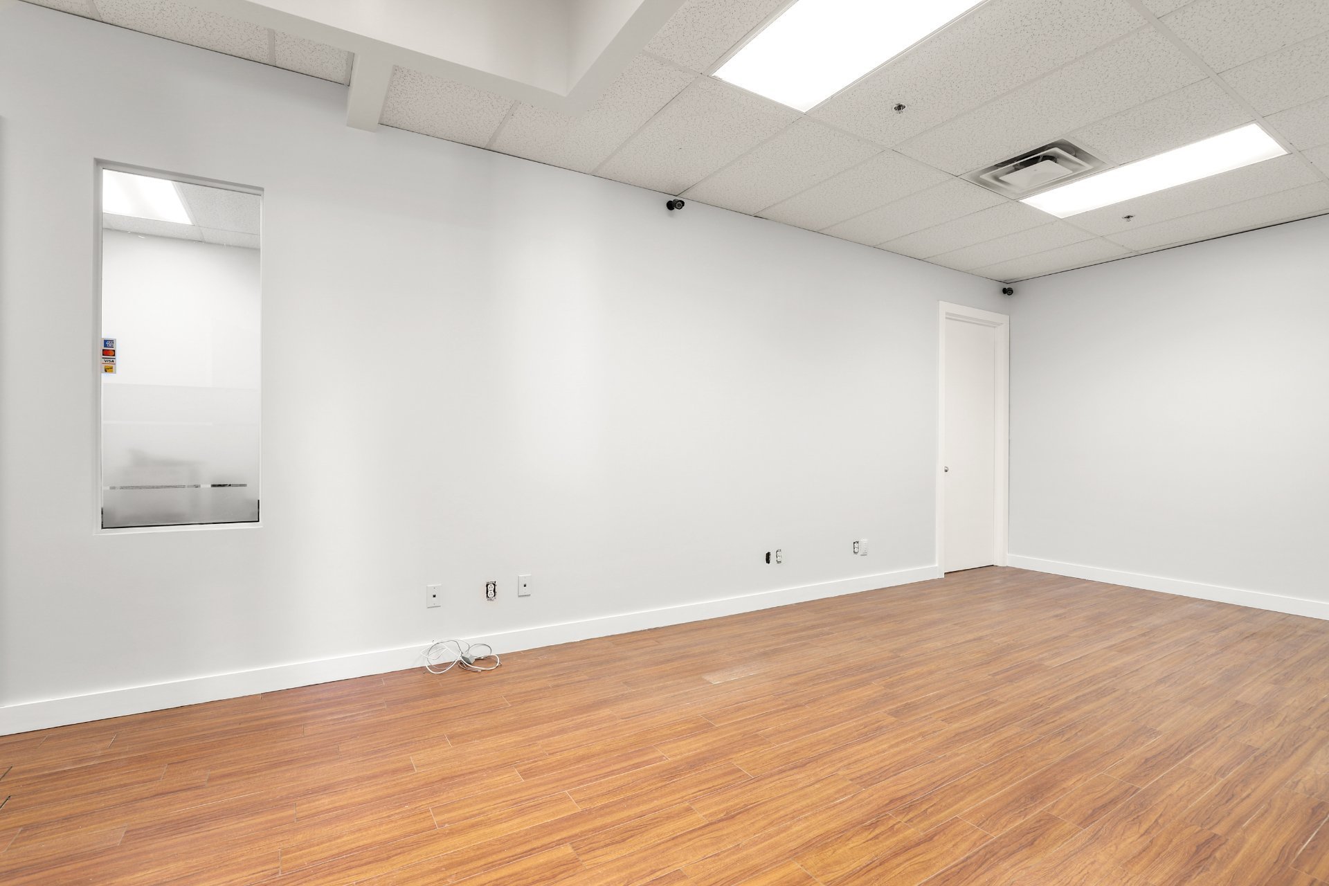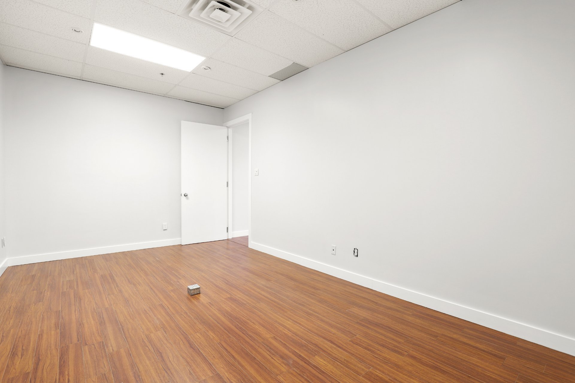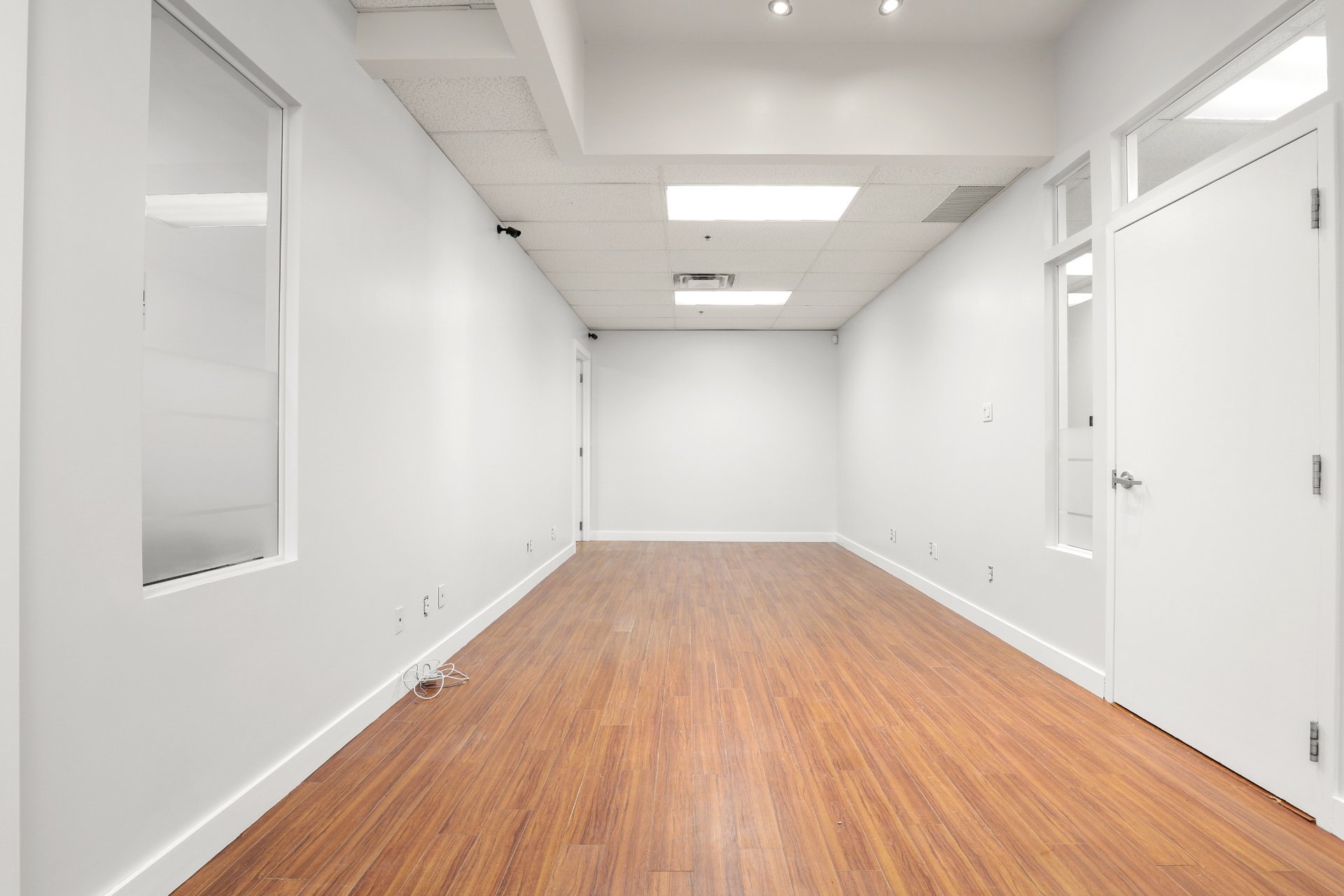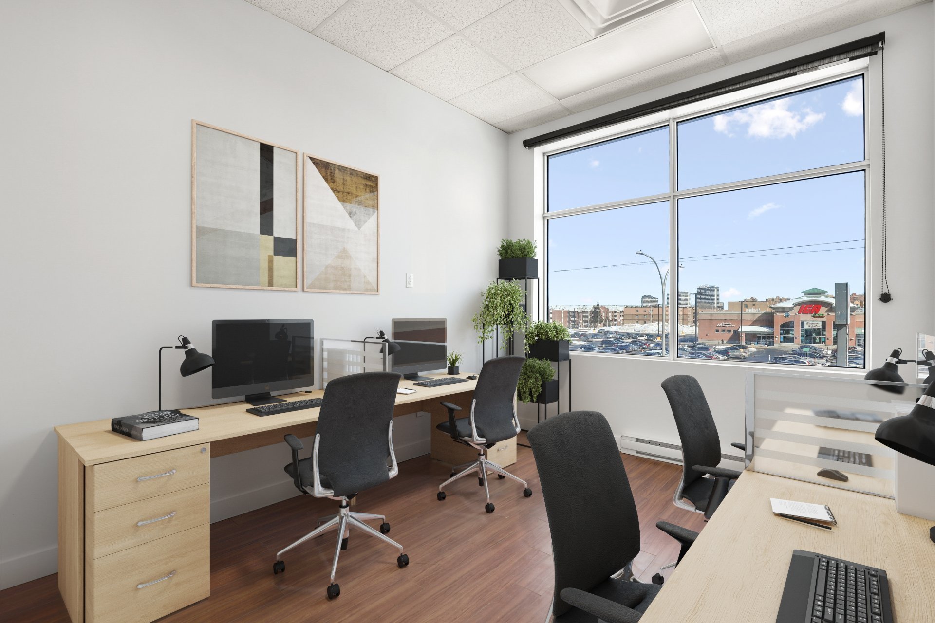 Unit 20.03 includes eight (8) offices, one (1) conference room, and one (1) storage space with doors and locks. It also features one (1) kitchen equipped with a sink built into a granite countertop, a granite wall counter, and wall-mounted cabinets above the sink. Shared restrooms are available on the same floor. The unit comes with two (2) reserved parking spaces, and visitor parking is also available. Hydro-Québec fees (heating and electricity), snow removal, and maintenance of common areas are included in the rent.