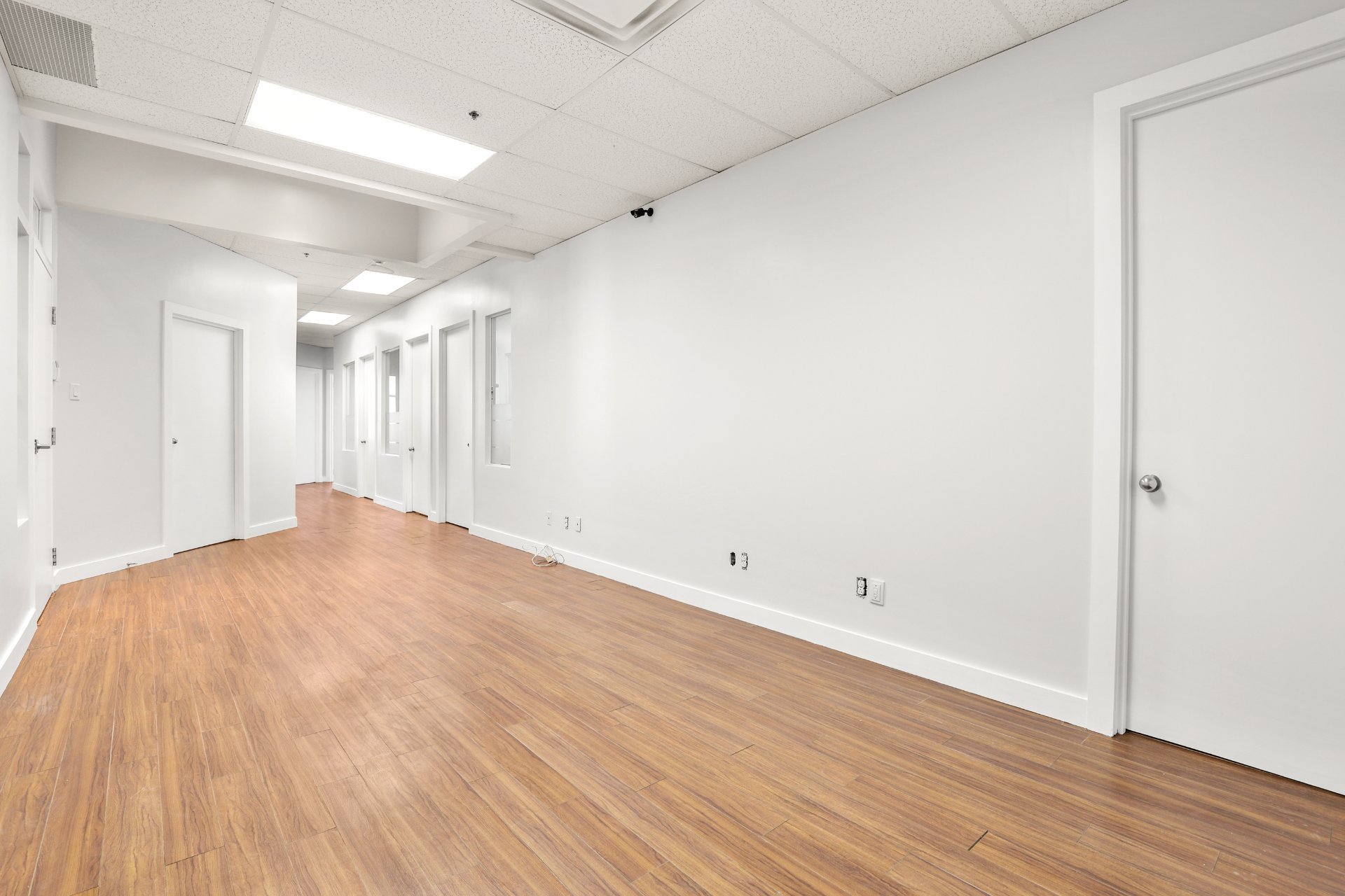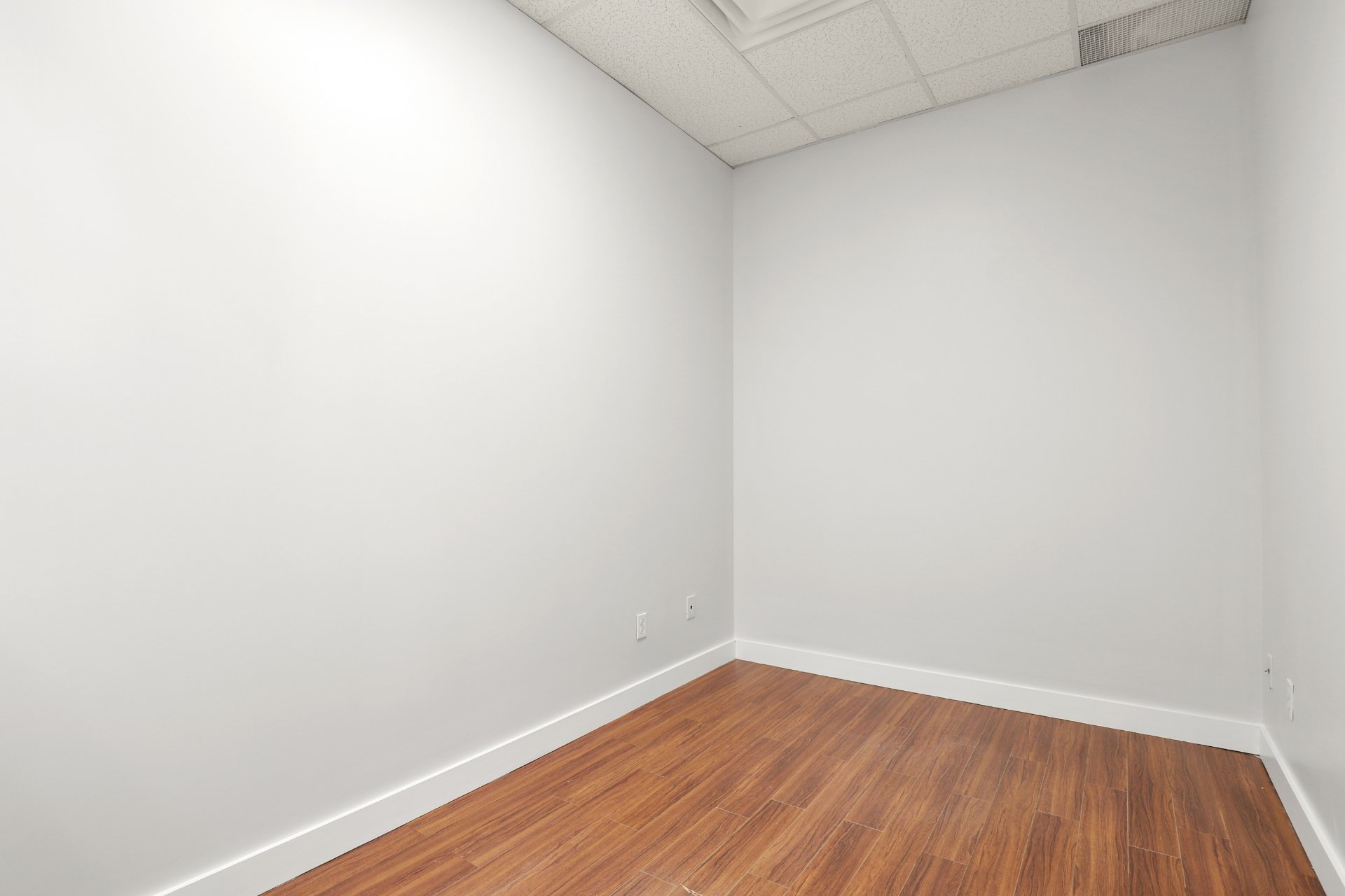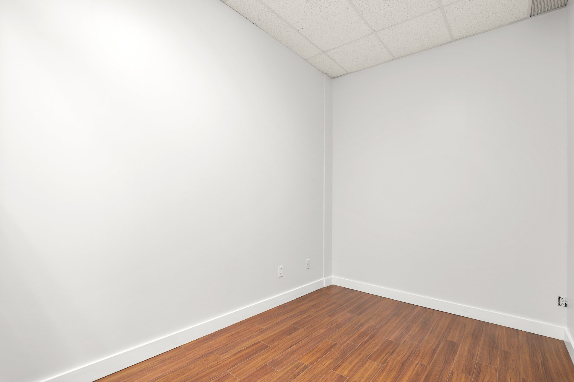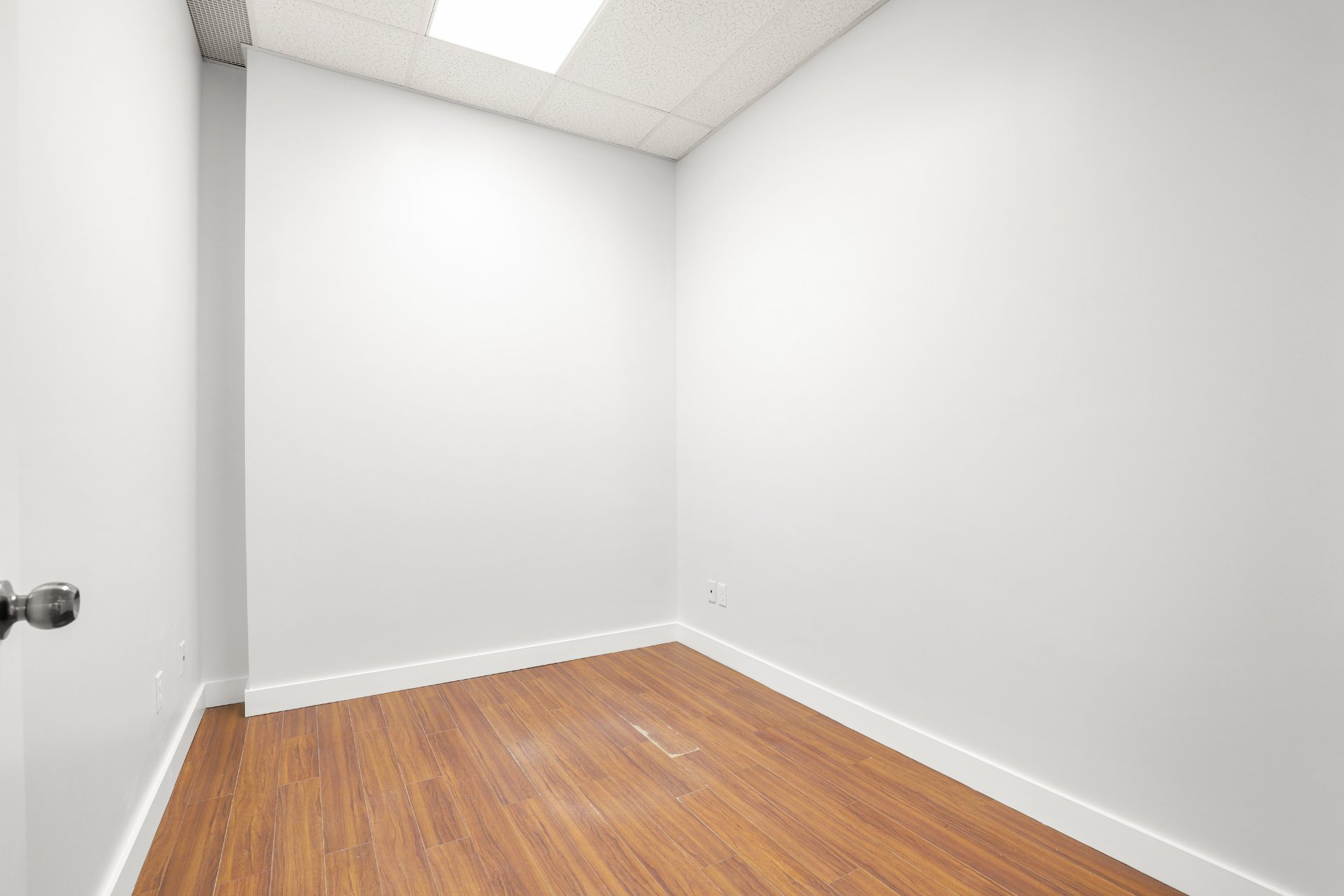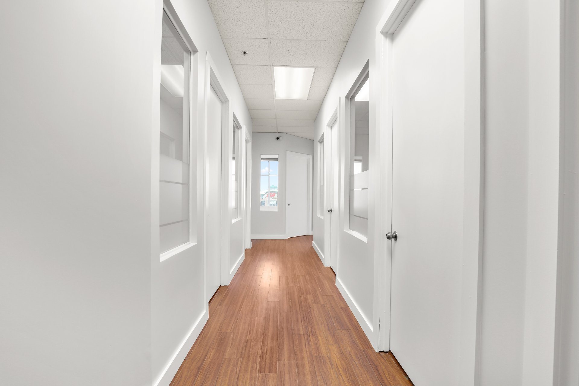 Unit 20.03 includes eight (8) offices, one (1) conference room, and one (1) storage space with doors and locks. It also features one (1) kitchen equipped with a sink built into a granite countertop, a granite wall counter, and wall-mounted cabinets above the sink. Shared restrooms are available on the same floor. The unit comes with two (2) reserved parking spaces, and visitor parking is also available. Hydro-Québec fees (heating and electricity), snow removal, and maintenance of common areas are included in the rent.
