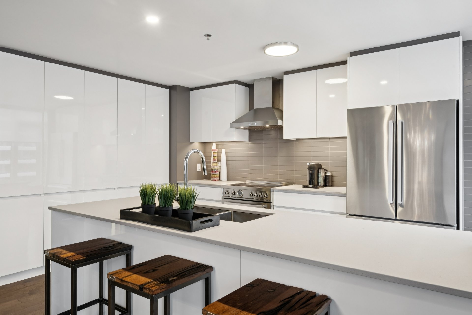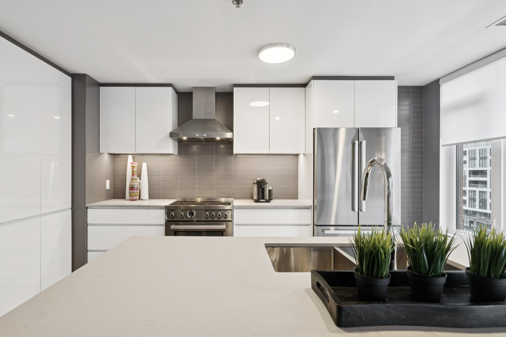 granit, dosseret de tuiles style métro, nombreuses armoires