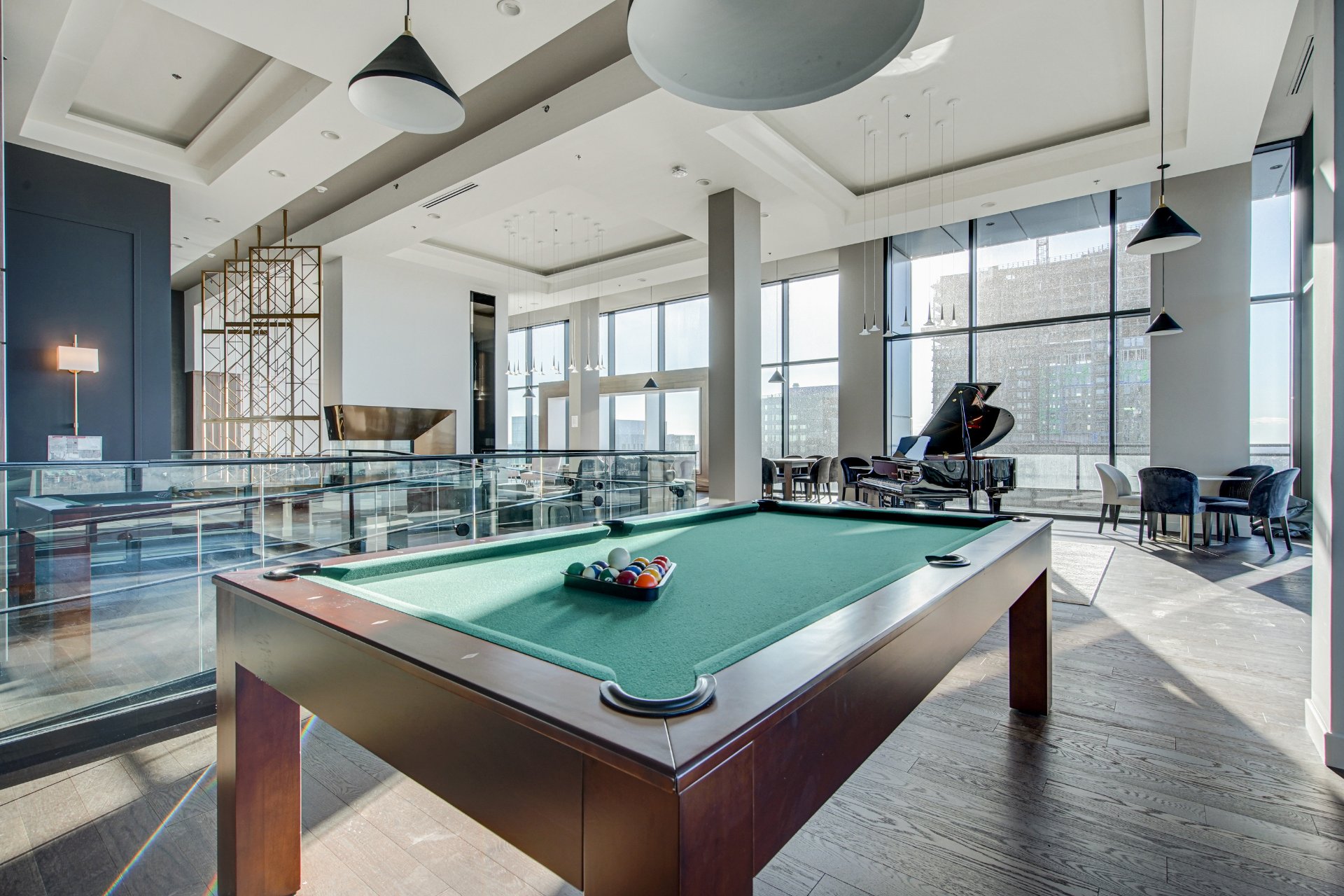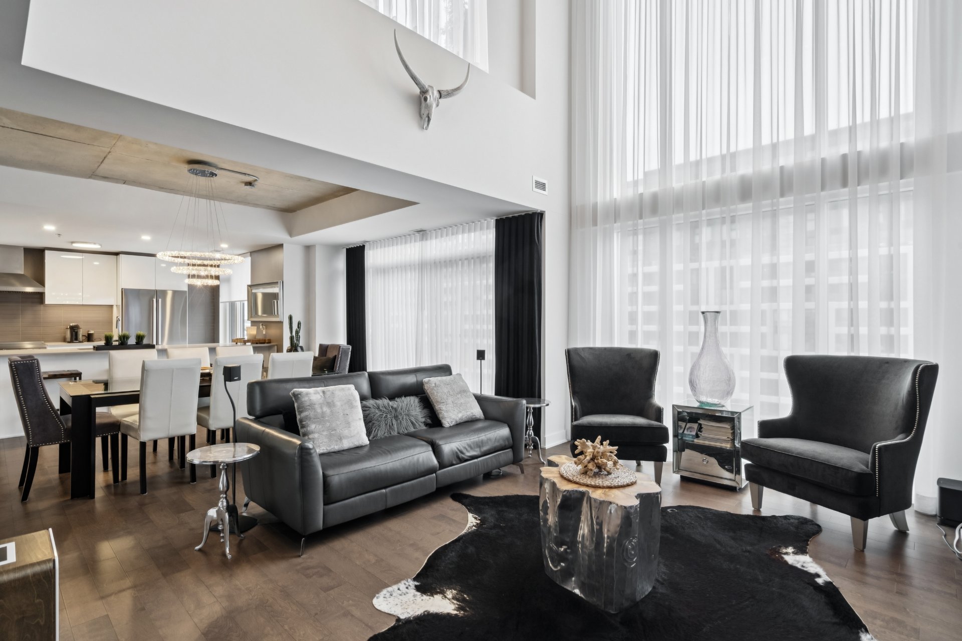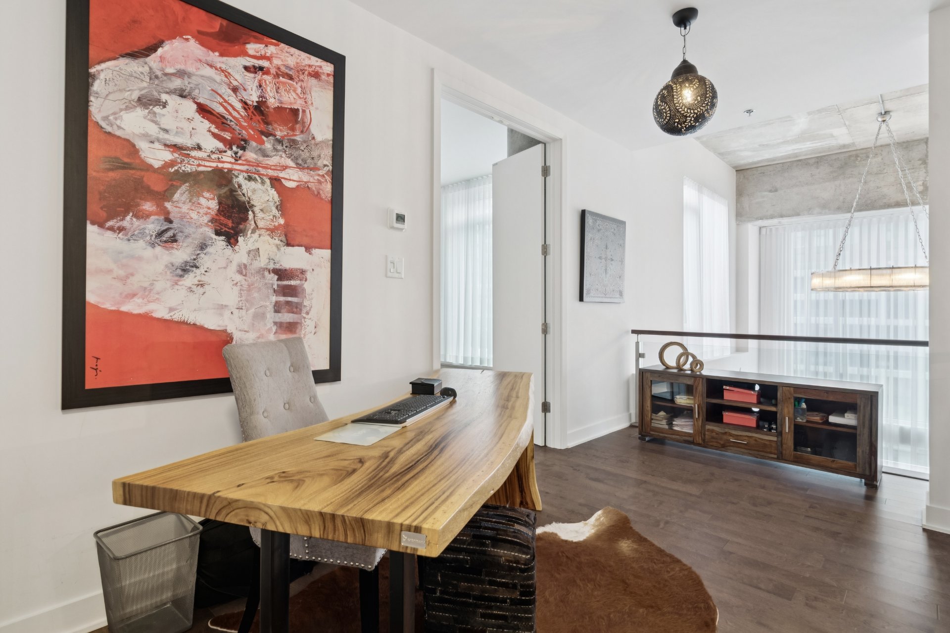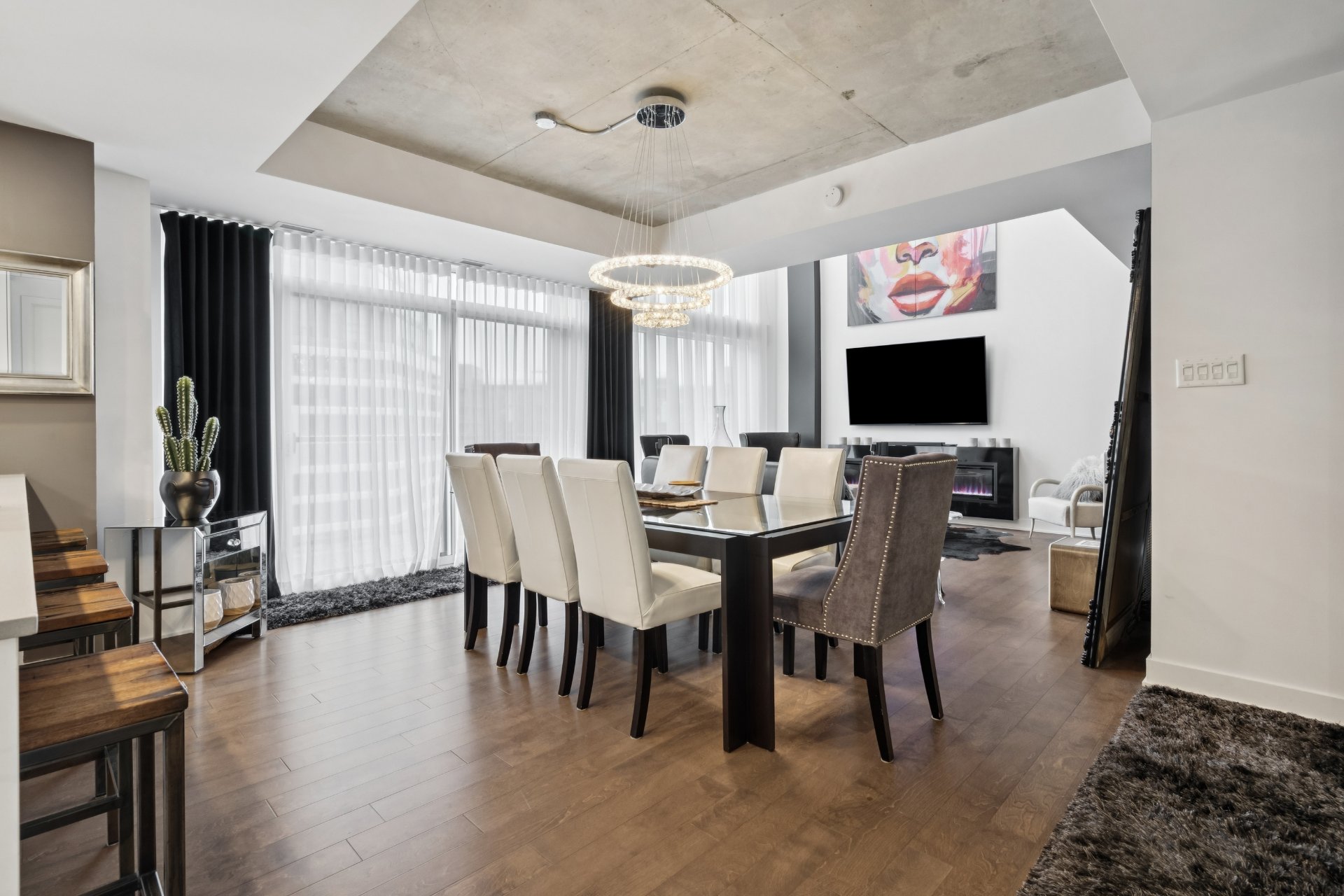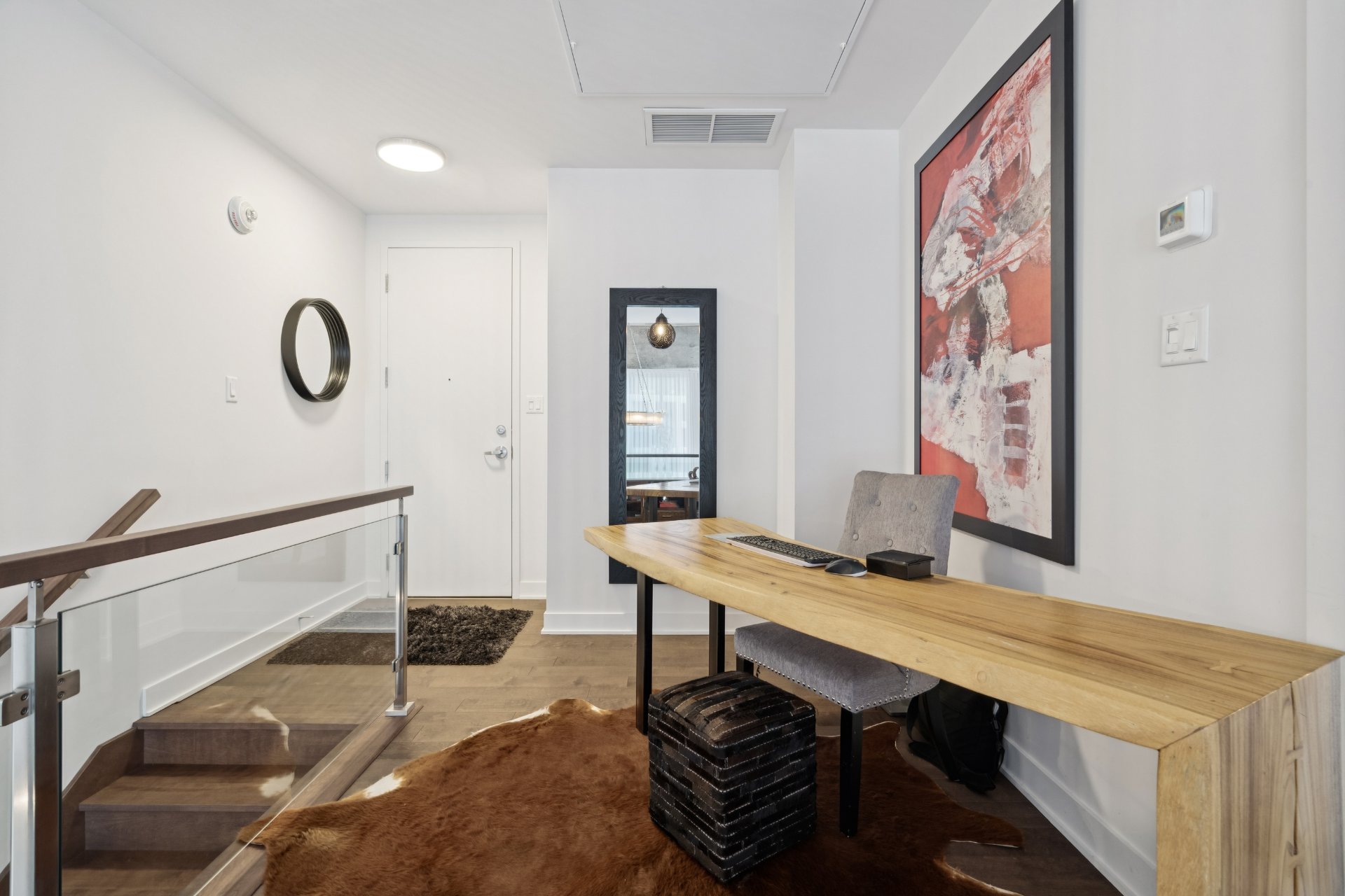 ** PENTHOUSE DE LUXE - UNITÉ DE COIN SUR 2 ÉTAGES - VUE DÉGAGÉE ** Aire ouverte, plancher de bois, plafonds 20p au salon, fenestration impressionnante, foyer électrique Napoléon. Magnifique cellier à la salle à manger, cuisine avec comptoir de granit, électroménagers Bertazzoni inclus. 2 chambres à coucher, chambre principale au 2e étage avec walk-in et salle de bain privée ainsi qu'un superbe boudoir. 2 balcons, 2 espaces garage, 3 rangements. À 2 mins du REM (sans sortir à l'extérieur). Plusieurs aires communes : piscines intérieure/extérieure, terrasse sur le toit, gym, salle commune, skylounge, spa/sauna et +. Suite addenda