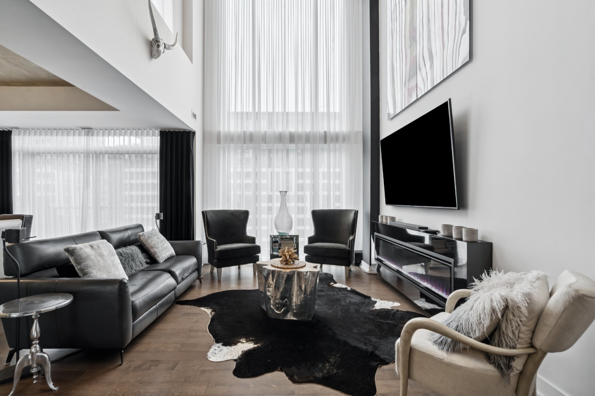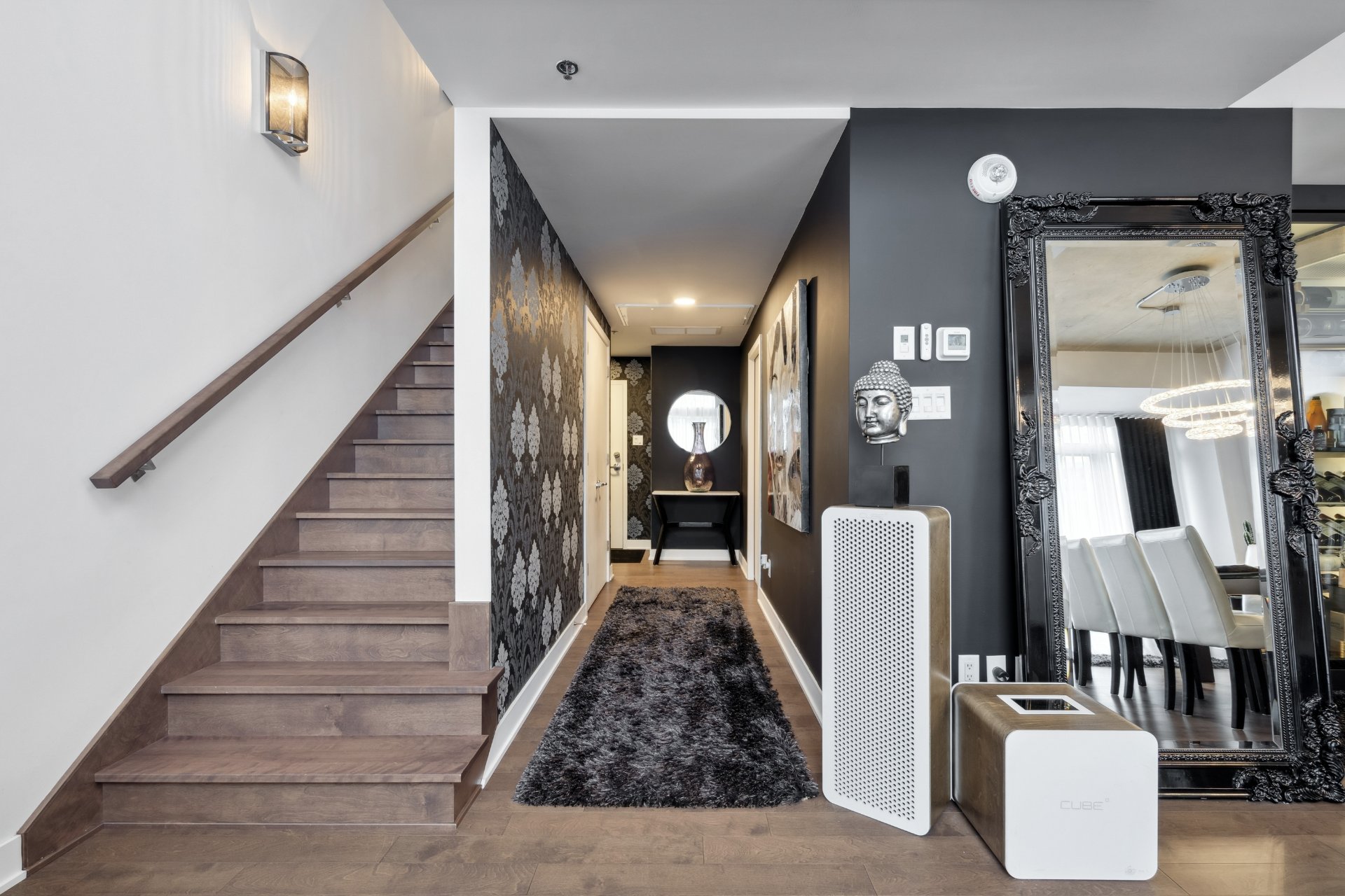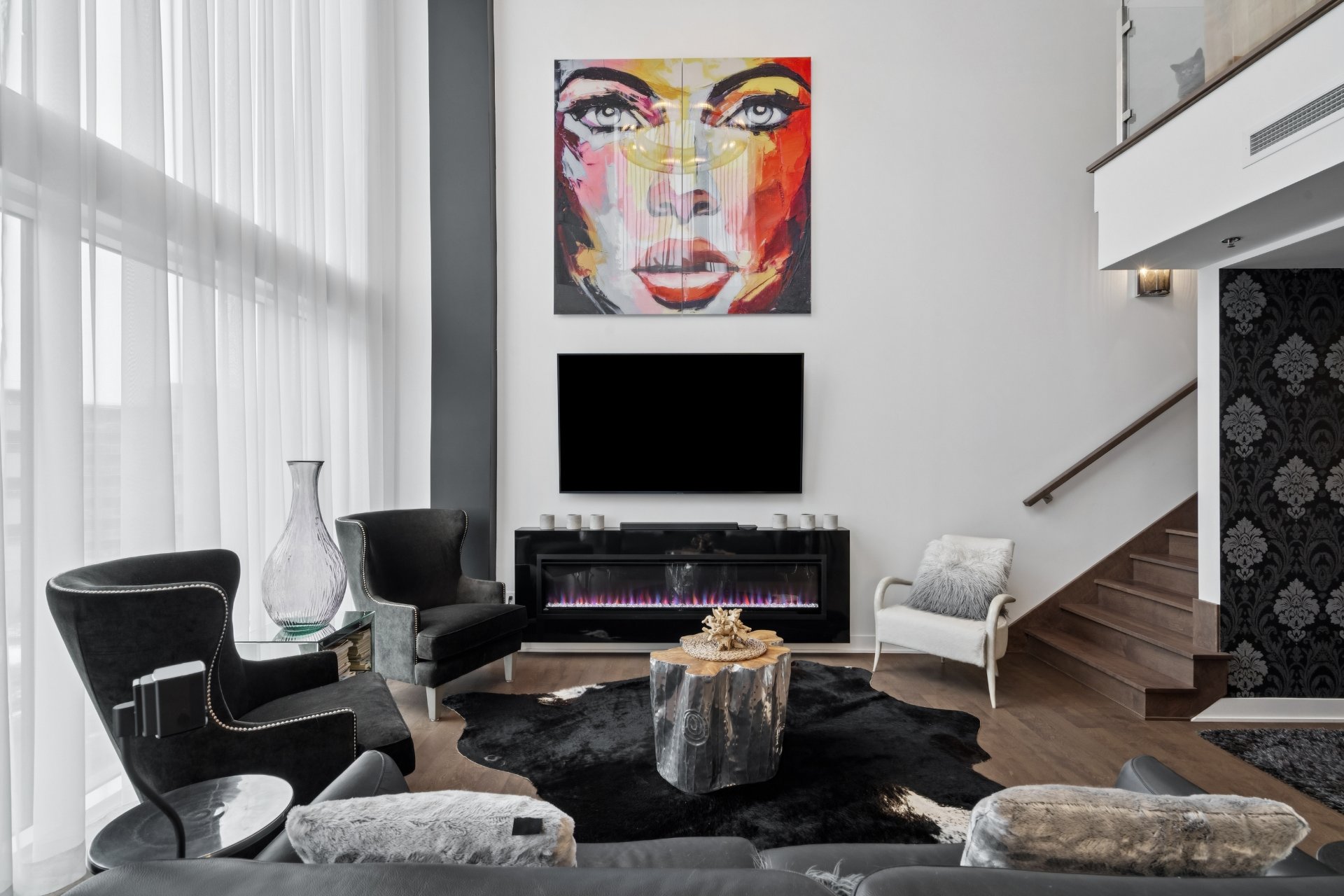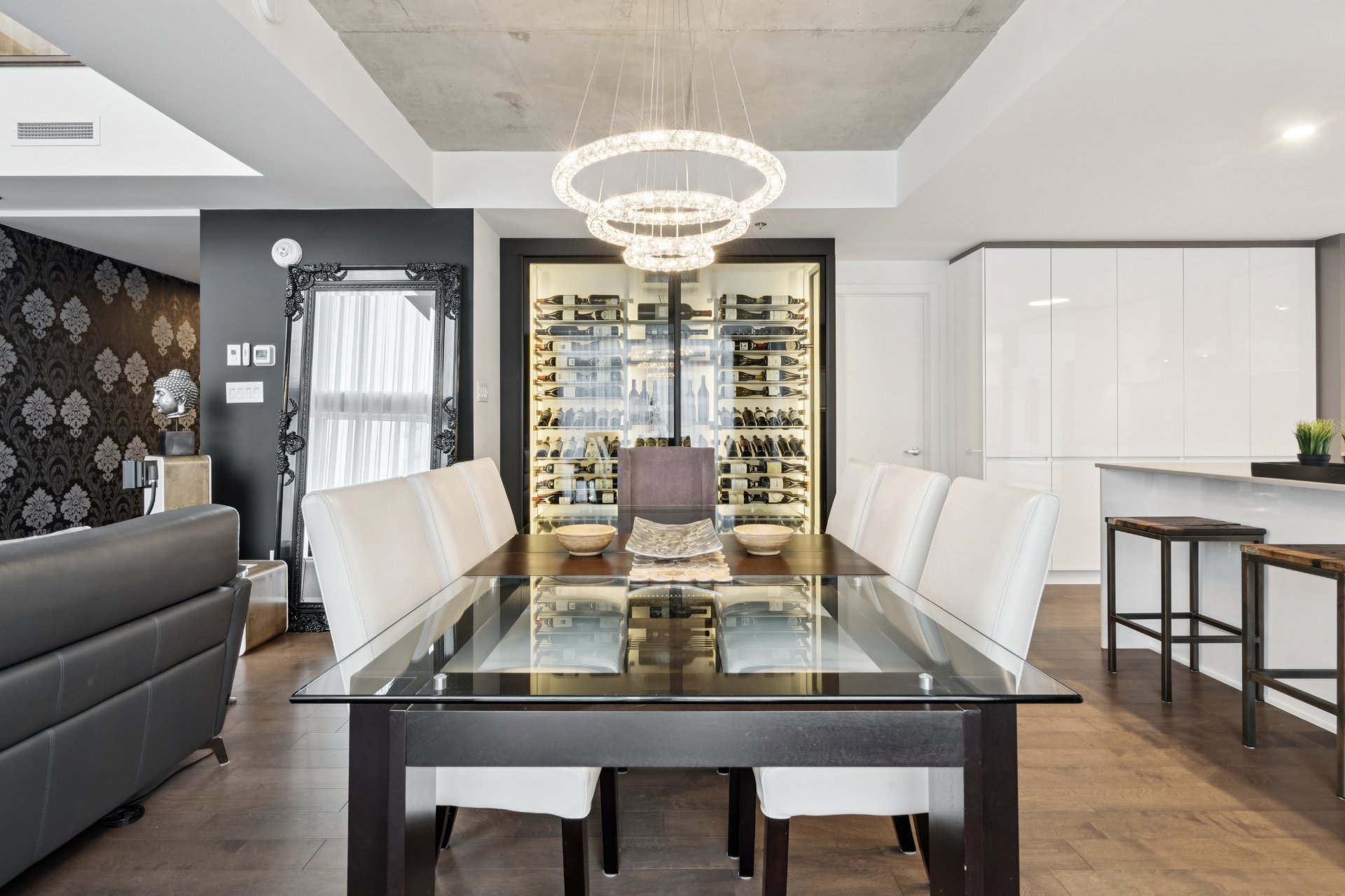 ** PENTHOUSE DE LUXE - UNITÉ DE COIN SUR 2 ÉTAGES - VUE DÉGAGÉE ** Aire ouverte, plancher de bois, plafonds 20p au salon, fenestration impressionnante, foyer électrique Napoléon. Magnifique cellier à la salle à manger, cuisine avec comptoir de granit, électroménagers Bertazzoni inclus. 2 chambres à coucher, chambre principale au 2e étage avec walk-in et salle de bain privée ainsi qu'un superbe boudoir. 2 balcons, 2 espaces garage, 3 rangements. À 2 mins du REM (sans sortir à l'extérieur). Plusieurs aires communes : piscines intérieure/extérieure, terrasse sur le toit, gym, salle commune, skylounge, spa/sauna et +. Suite addenda