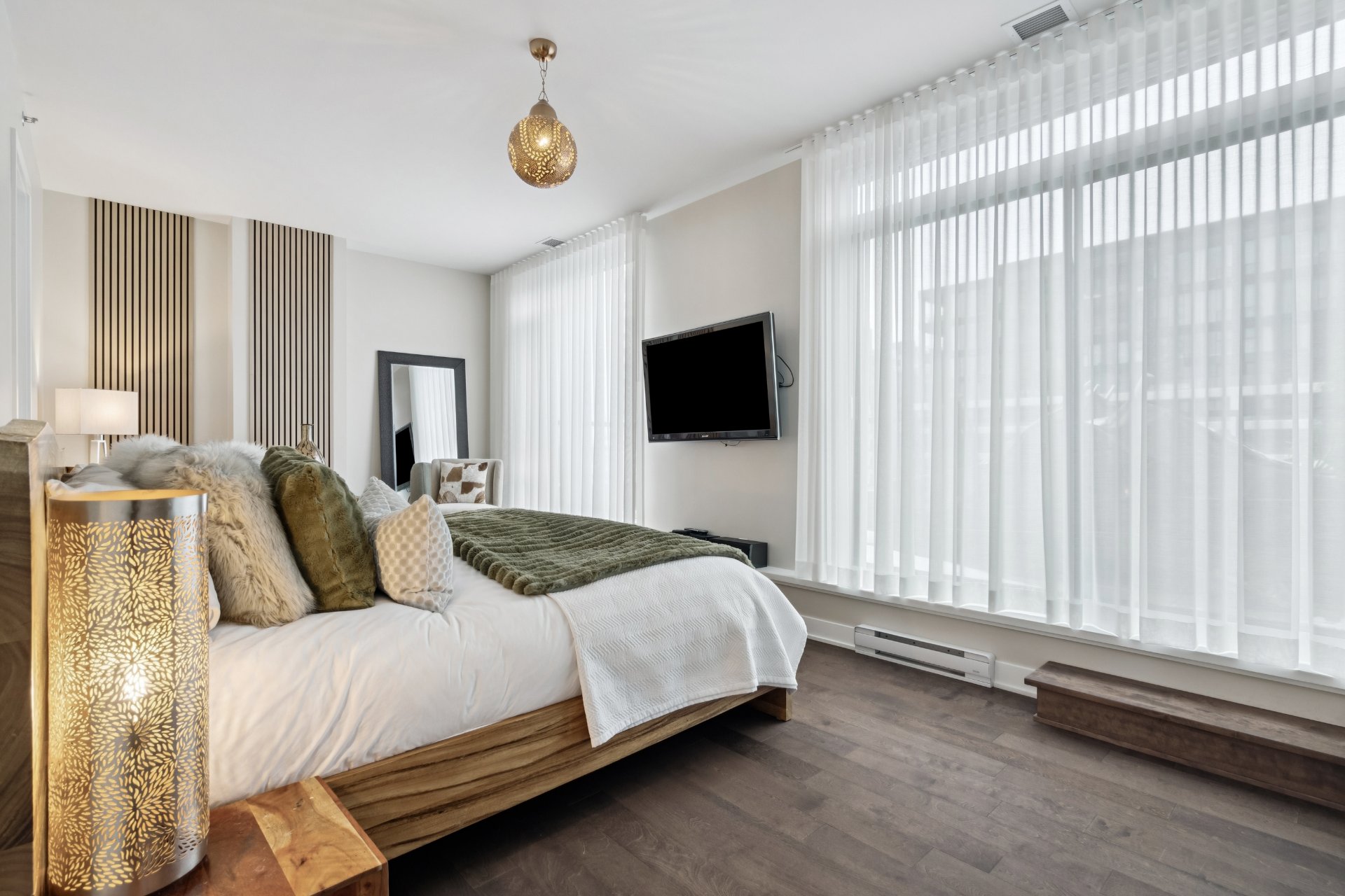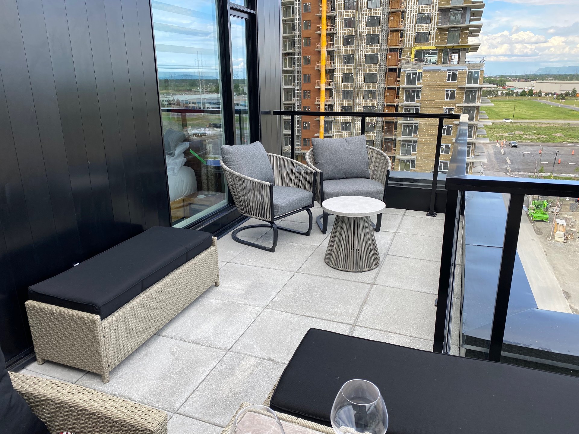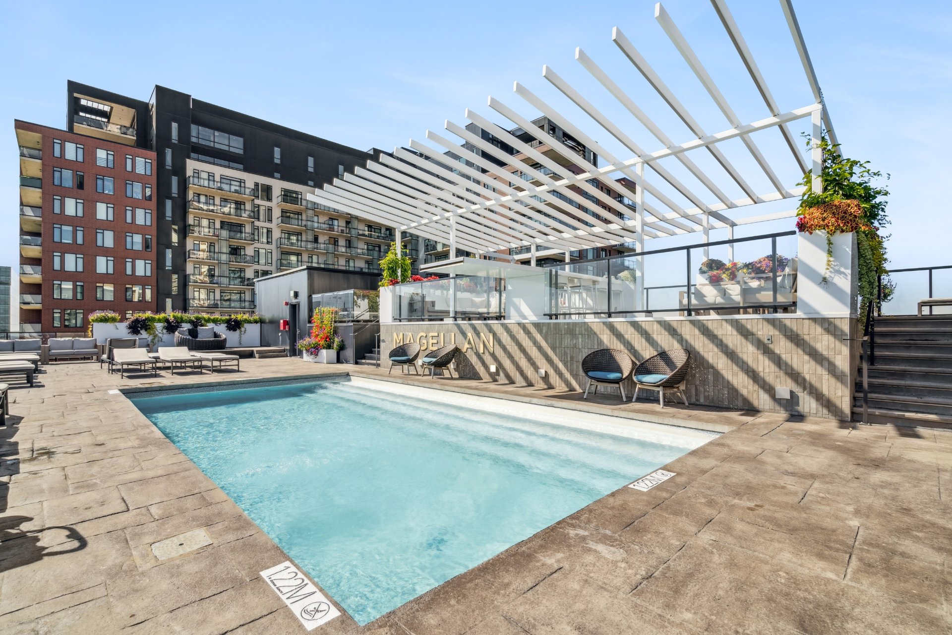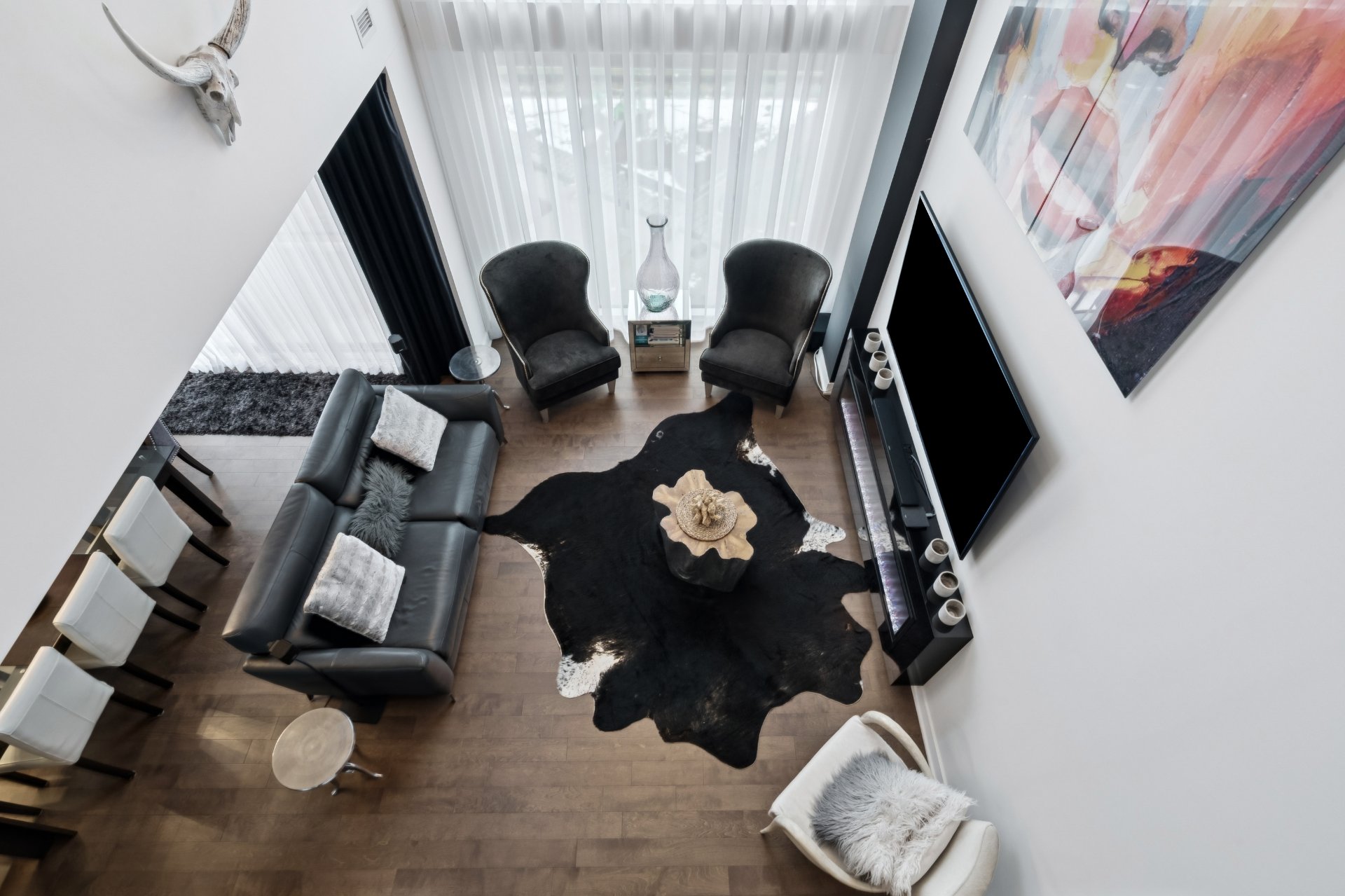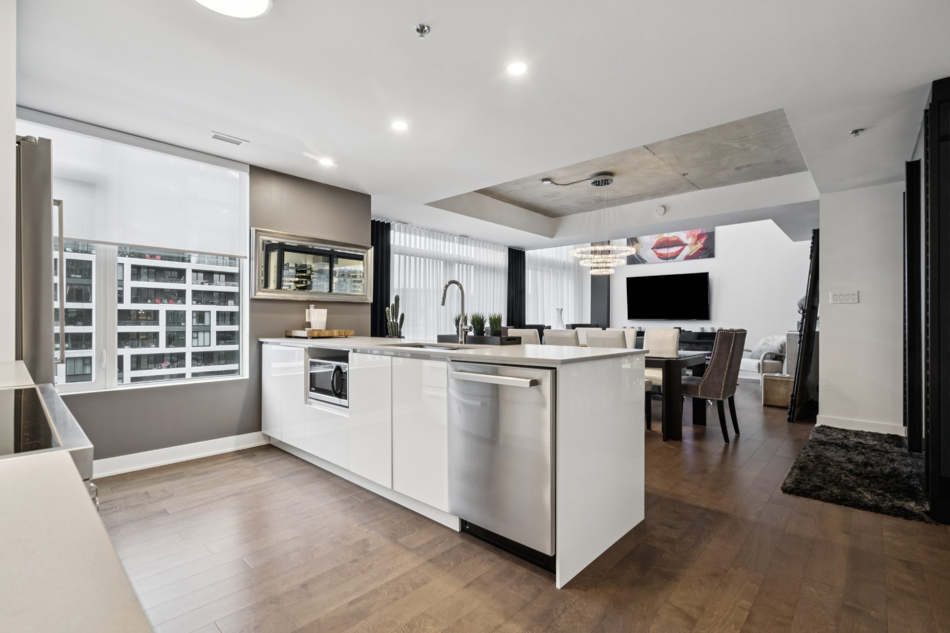 ** PENTHOUSE DE LUXE - UNITÉ DE COIN SUR 2 ÉTAGES - VUE DÉGAGÉE ** Aire ouverte, plancher de bois, plafonds 20p au salon, fenestration impressionnante, foyer électrique Napoléon. Magnifique cellier à la salle à manger, cuisine avec comptoir de granit, électroménagers Bertazzoni inclus. 2 chambres à coucher, chambre principale au 2e étage avec walk-in et salle de bain privée ainsi qu'un superbe boudoir. 2 balcons, 2 espaces garage, 3 rangements. À 2 mins du REM (sans sortir à l'extérieur). Plusieurs aires communes : piscines intérieure/extérieure, terrasse sur le toit, gym, salle commune, skylounge, spa/sauna et +. Suite addenda