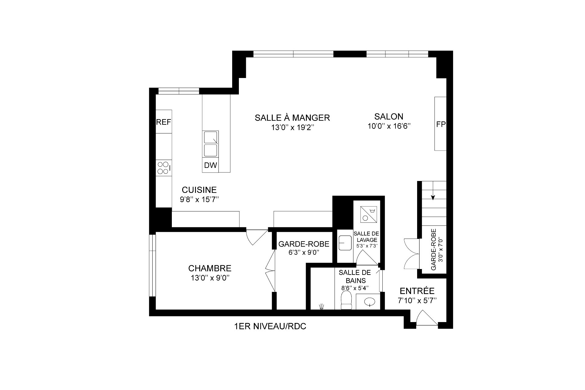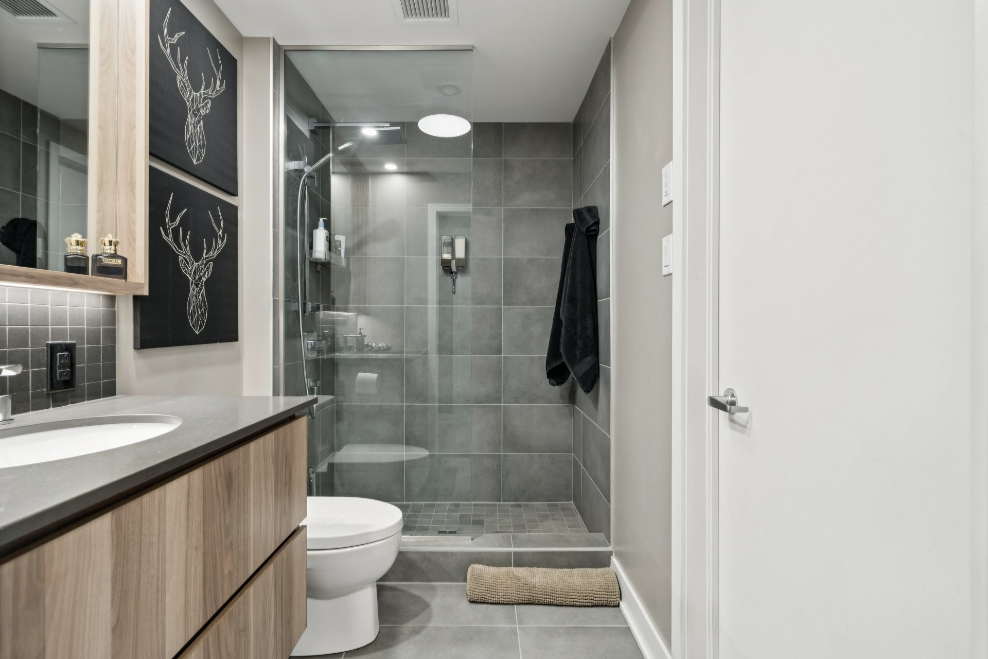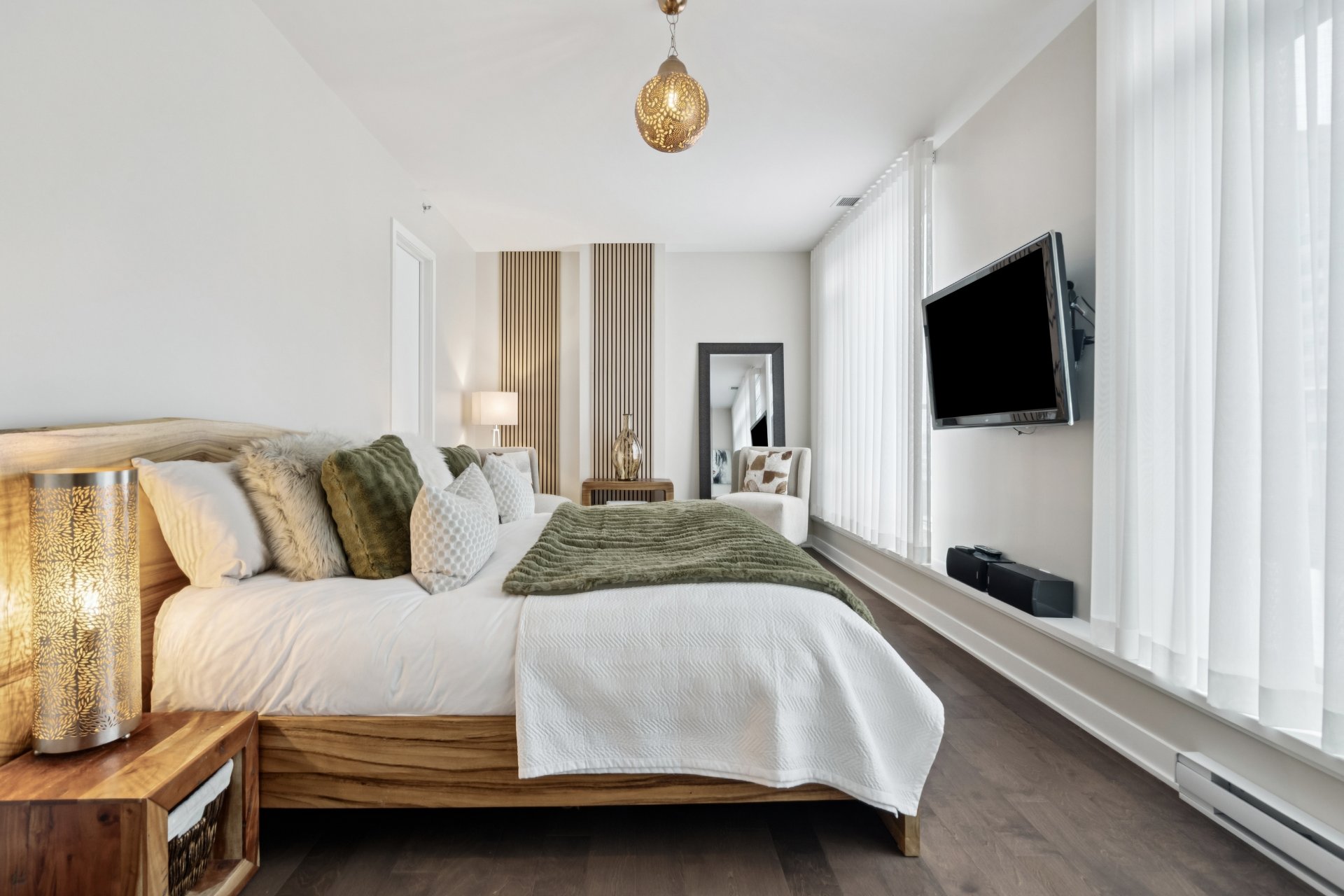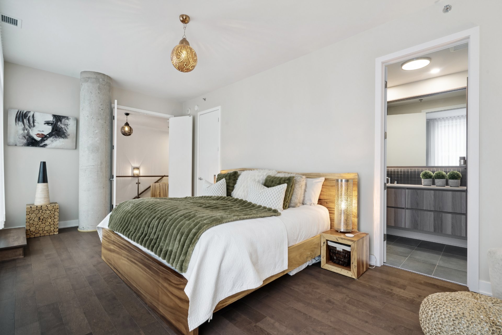 - Chambre avec walk-in 9' x 6,3', plafond finition béton et