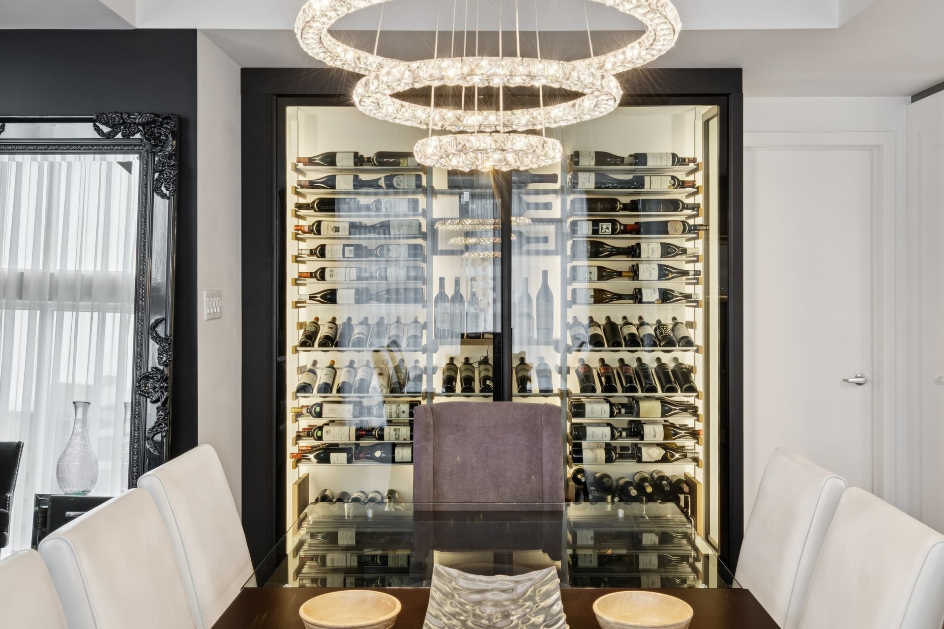 Électroménagers Bertazzoni : réfrigérateur, cuisinière et lave-vaisselle, laveuse-sécheuse LG : modèles Inverter Direct Drive et Sensory Dry, foyer électrique Napoléon : modèle mural de 254cm avec caisson intégré, balayeuse centrale : ASP Beam - modèle #398, 680 AW, série Sérénité, cave à vin : The Wine Square - modèle CUBE, rideaux, rideaux électriques du salon, toiles et habillages de fenêtres provenant de Draperie Cholette, luminaires