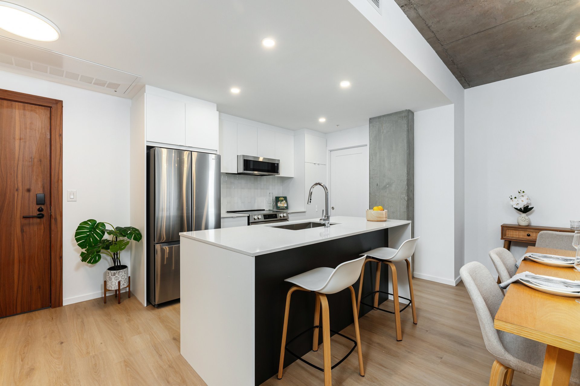 Réfrigérateur, cuisinière, micro-ondes, lave-vaisselle, laveuse, sécheuse, chauffage, eau chaude, électricité, internet, air climatisé central, tringles à rideaux, luminaires, gym, terrasse et piscine sur le toit.