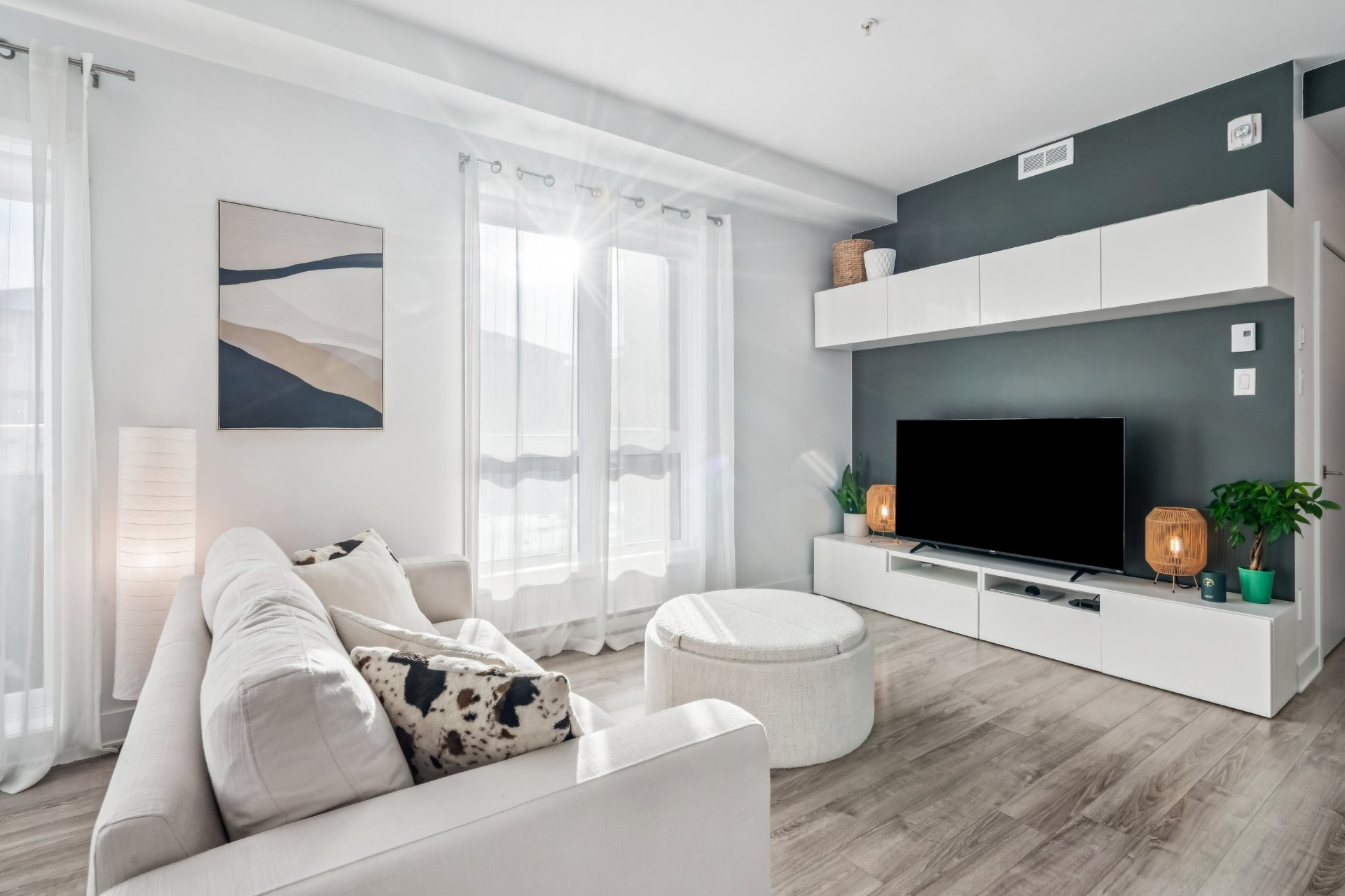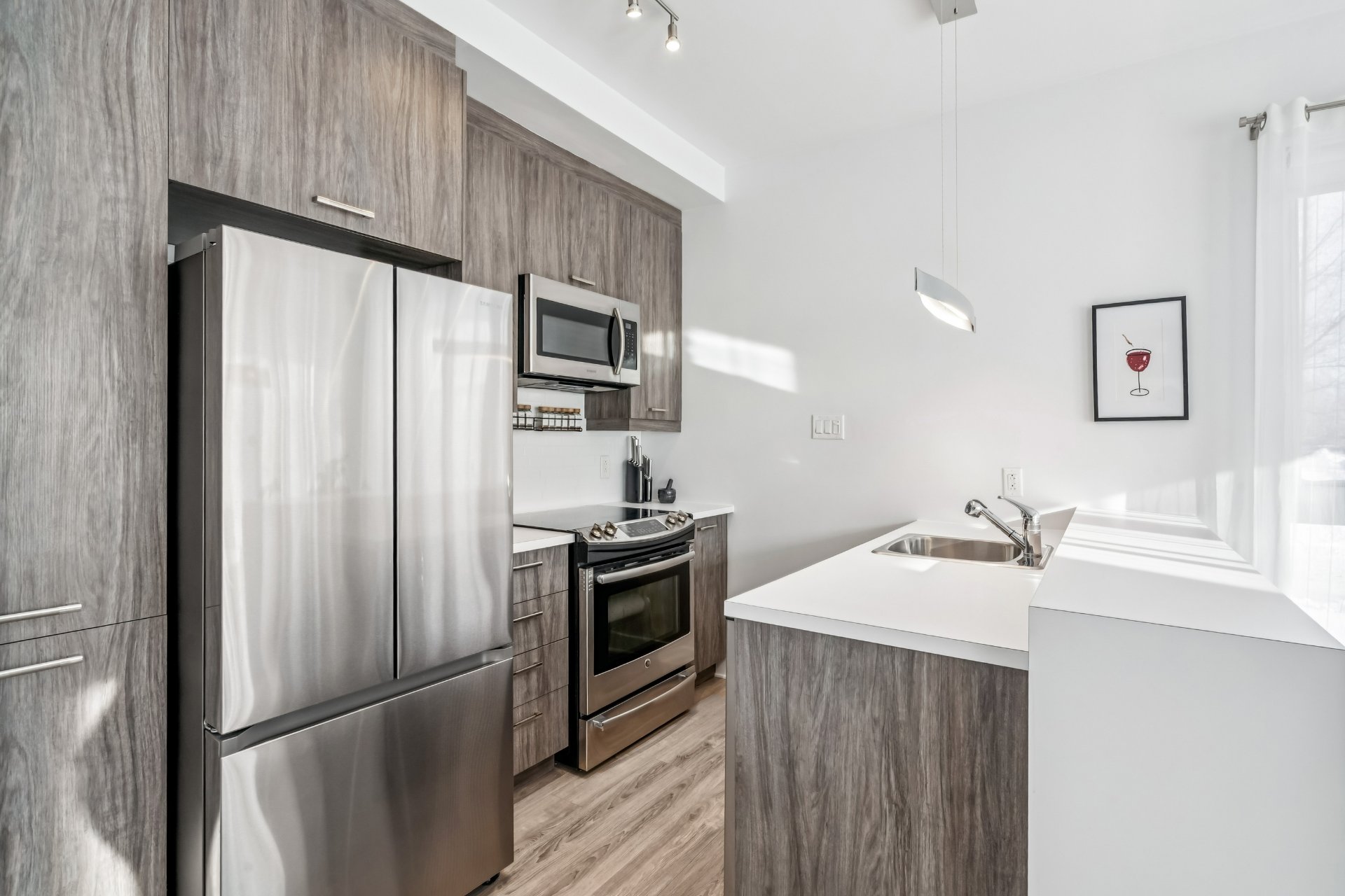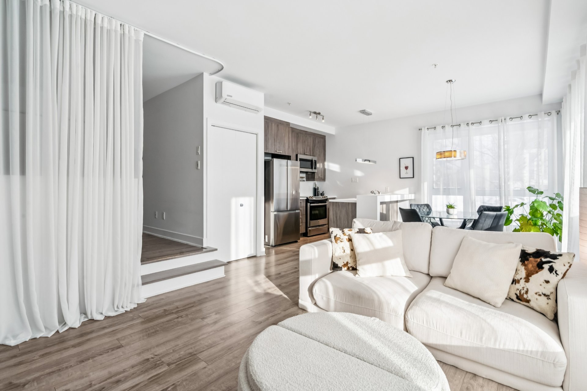 Tous les électroménagers (réfrigérateur, lave-vaisselle, cuisinière, laveuse et sécheuse). Stores opaques, rideaux, aspirateur central et accessoires, luminaires, téléviseur mural et unité de rangement au salon, ridea...