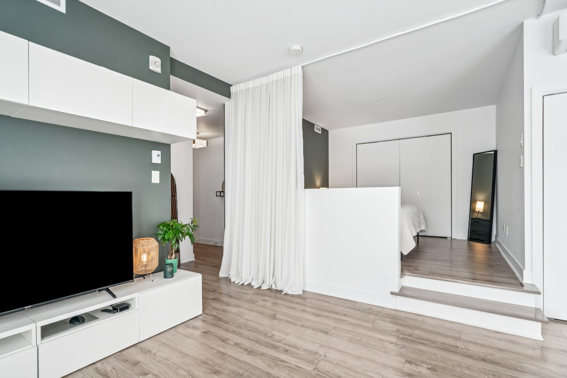 Tous les électroménagers (réfrigérateur, lave-vaisselle, cuisinière, laveuse et sécheuse). Stores opaques, rideaux, aspirateur central et accessoires, luminaires, téléviseur mural et unité de rangement au salon, rideaux de séparation (chambre).