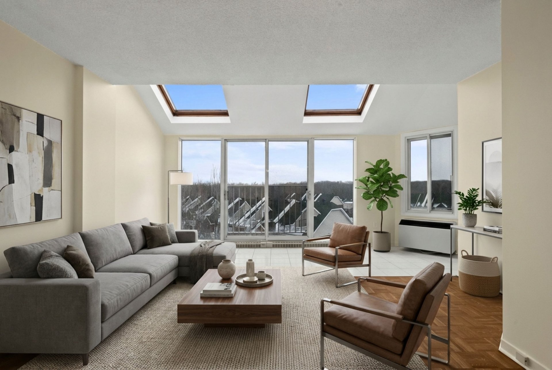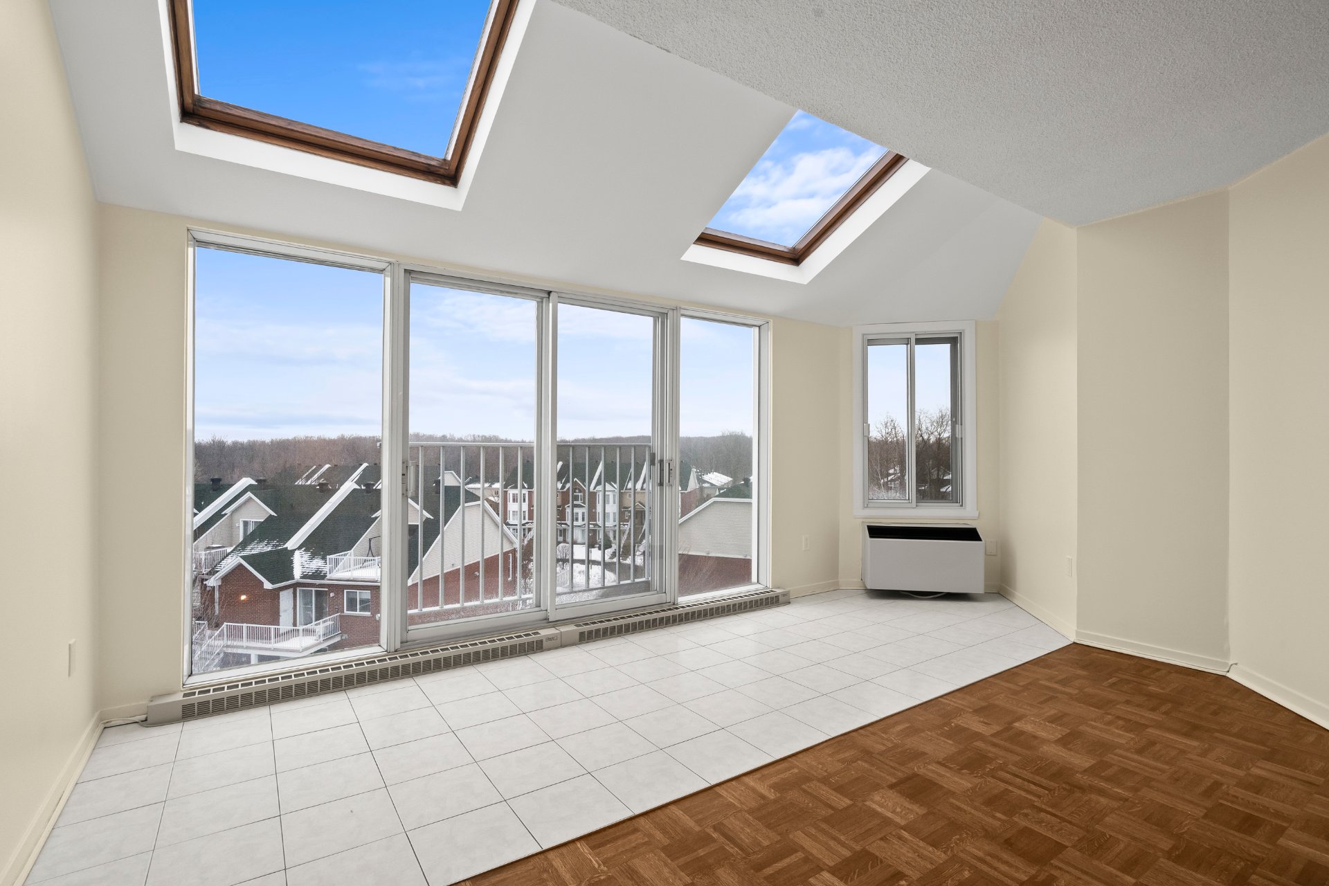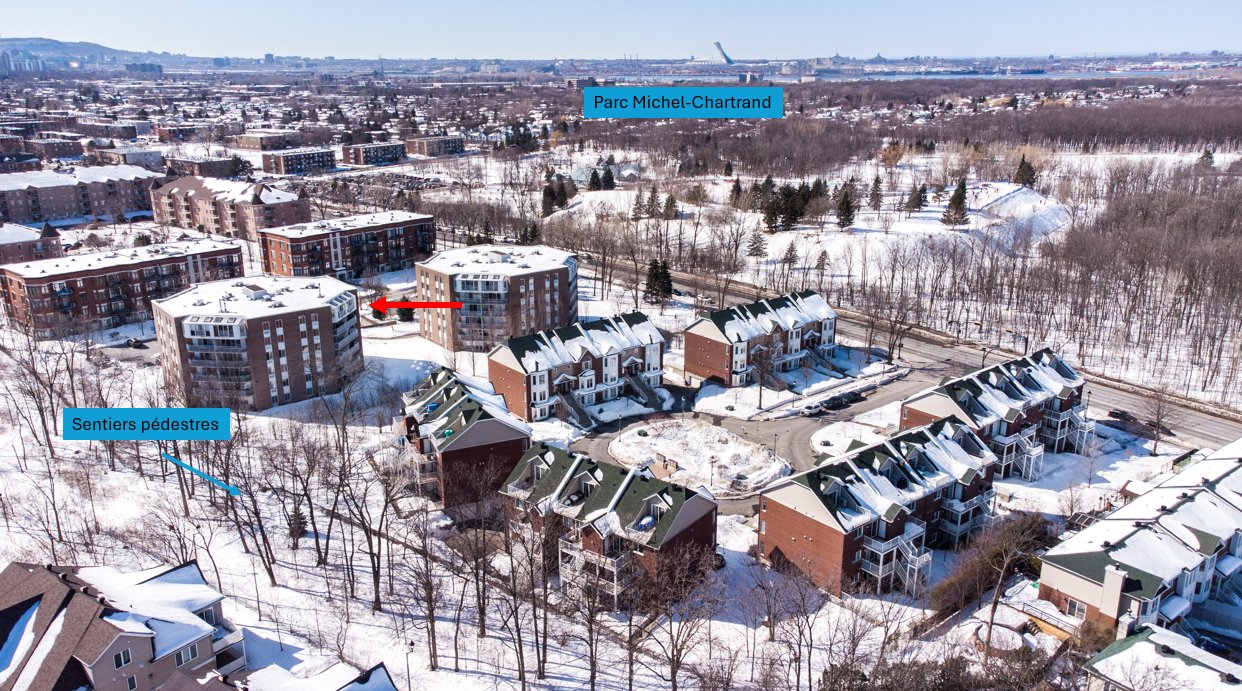 *Les tours du Parc* Située au dernier étage de l'immeuble, avec une vue panoramique et une abondance de luminosité provenant de sa fenestration surdimensionnée et de ses puits de lumière, très belle unité de 2 chambres à coucher, cuisine et salle de bain rénovées, climatiseur mural, 1 espace de stationnement privé au garage, locker à proximité, immeuble sécuritaire avec caméra de surveillance et interphone, très tranquille avec insonorisation ++, ascenseur, chute à déchet, salle commune, stationnements visiteur, entouré de verdure et à quelques pas du parc Michel-Chartrand ainsi que de tous les services via de nombreux sentiers pédestres!