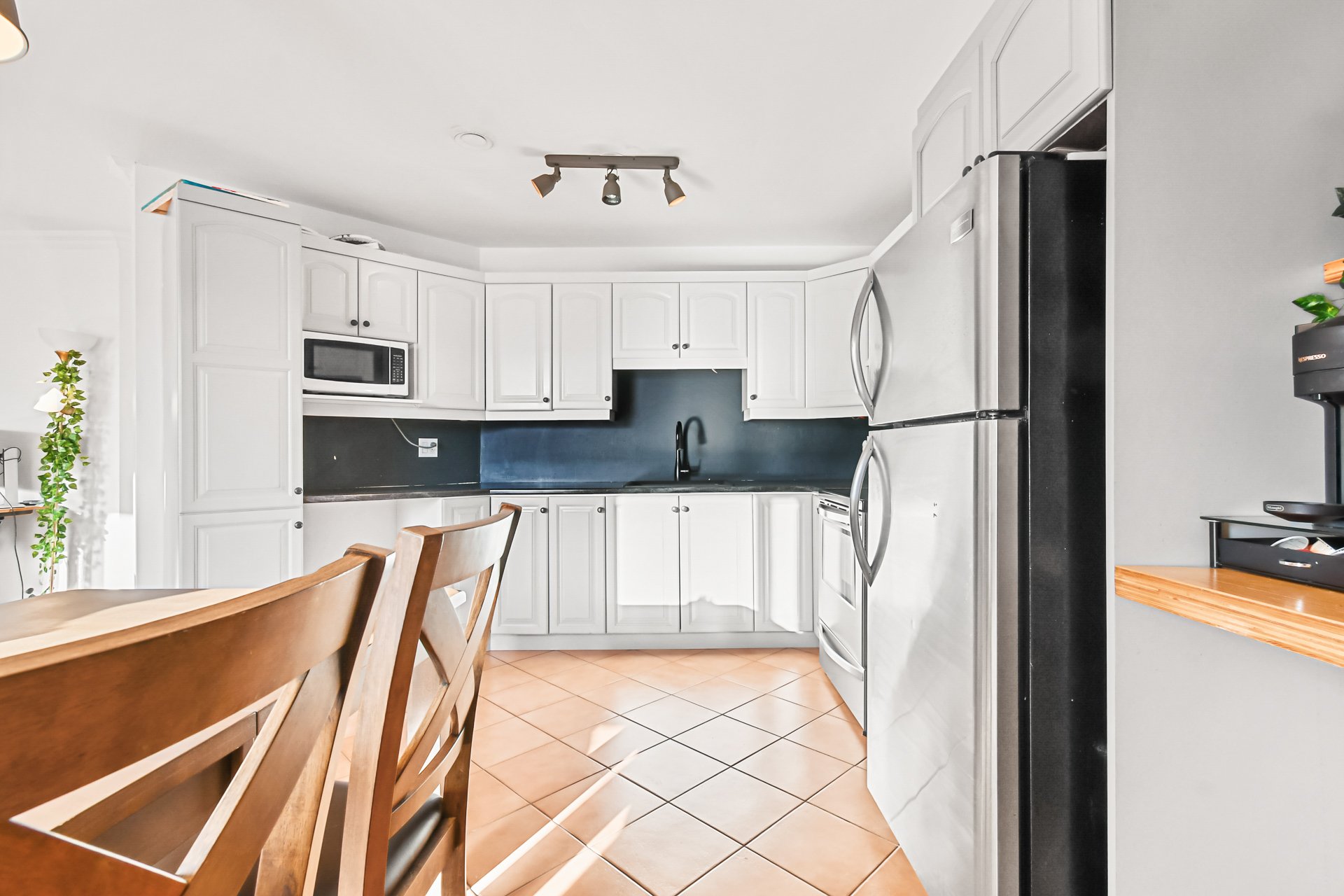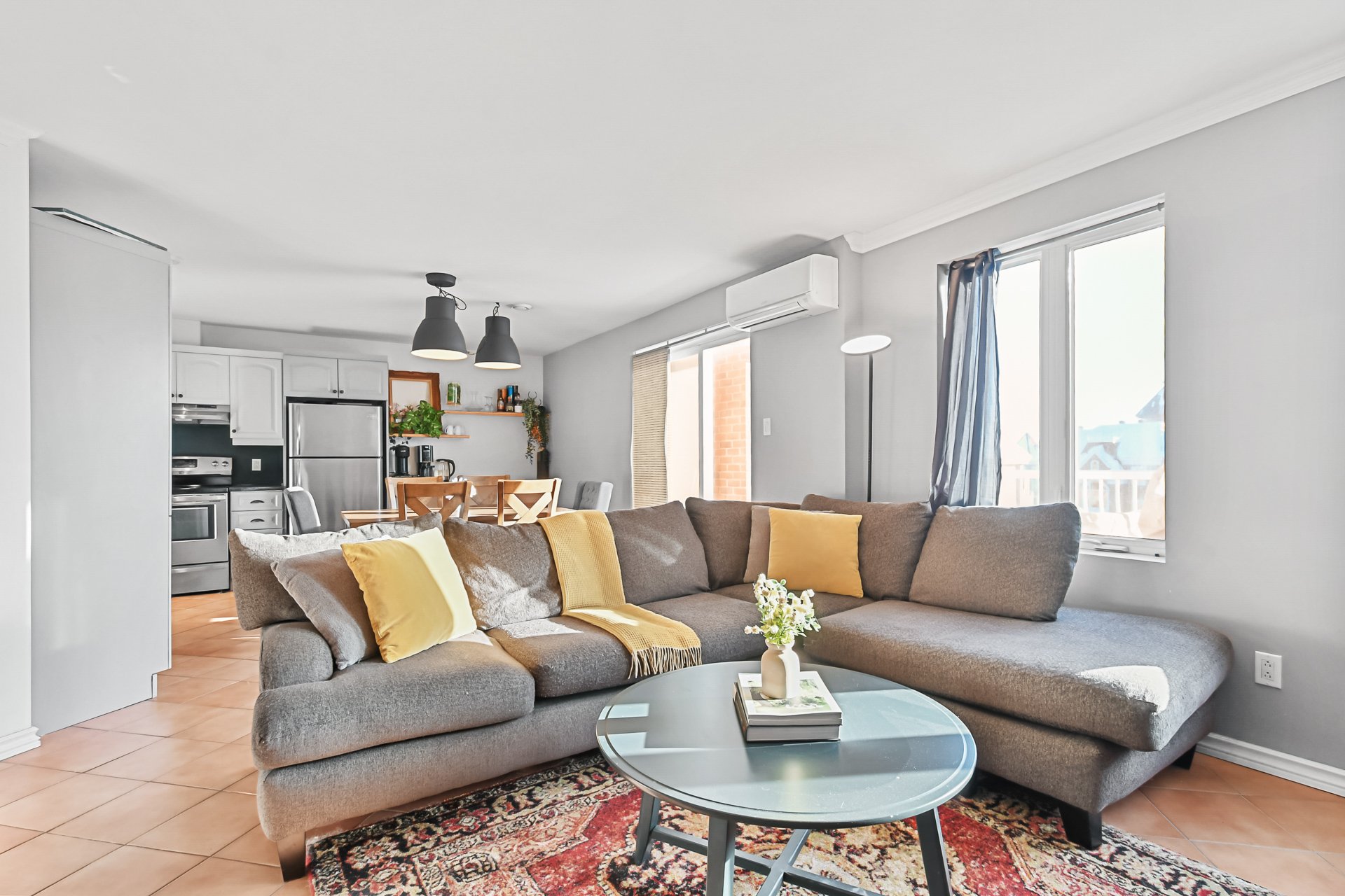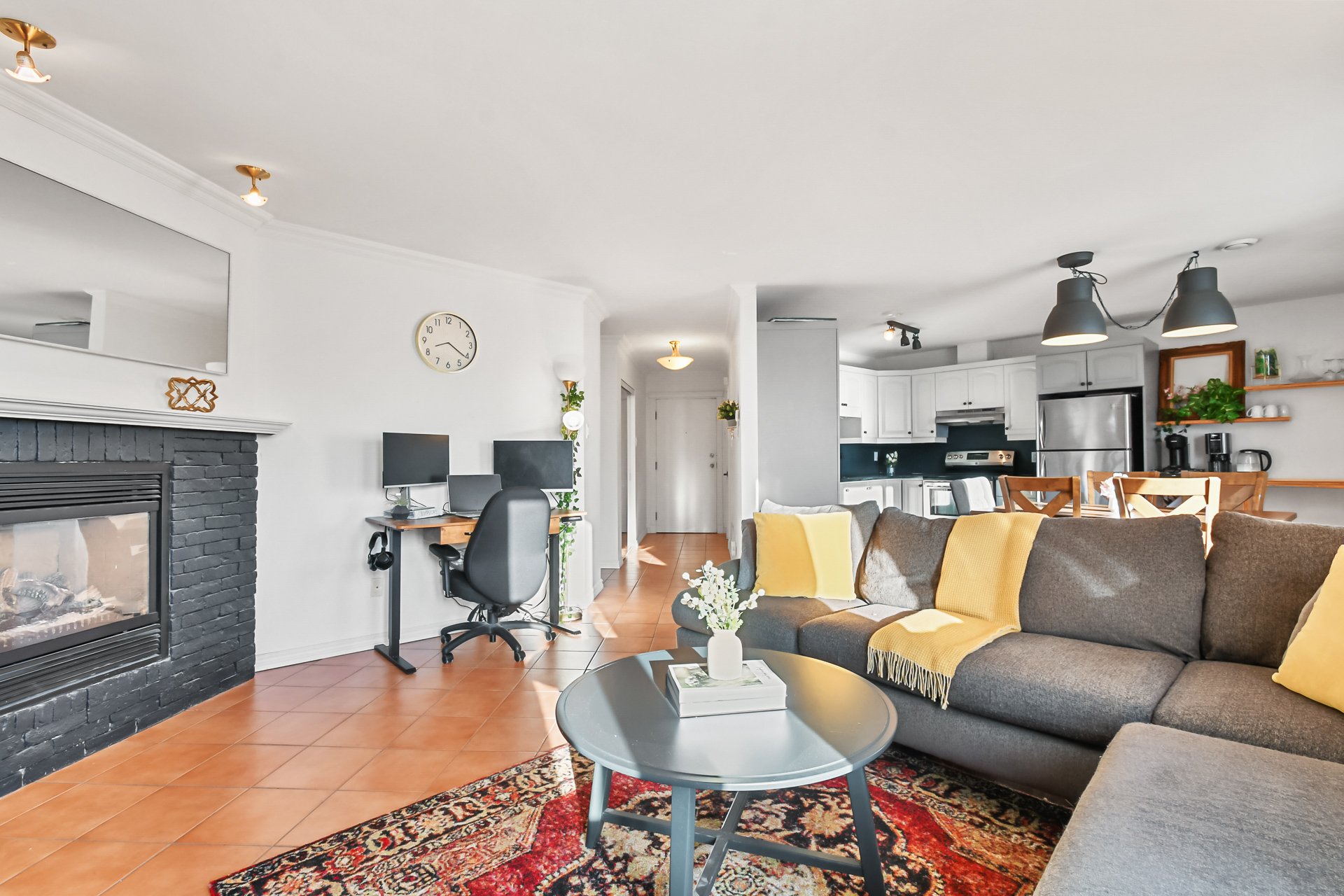 Située au 4e étage sur la montée Masson, cette copropriété offre une aire de vie ouverte regroupant salon et salle à manger, agrémentée d'un foyer au gaz et de planchers de céramique. La cuisine propose beaucoup de rangement et un comptoir de service. L'unité comprend deux chambres avec garde-robes doubles, une salle de bain moderne avec vanité flottante et douche en coin, ainsi qu'un espace laveuse-sécheuse. Deux stationnements inclus. Secteur très recherché, à proximité des commerces, écoles, parcs et restaurants.