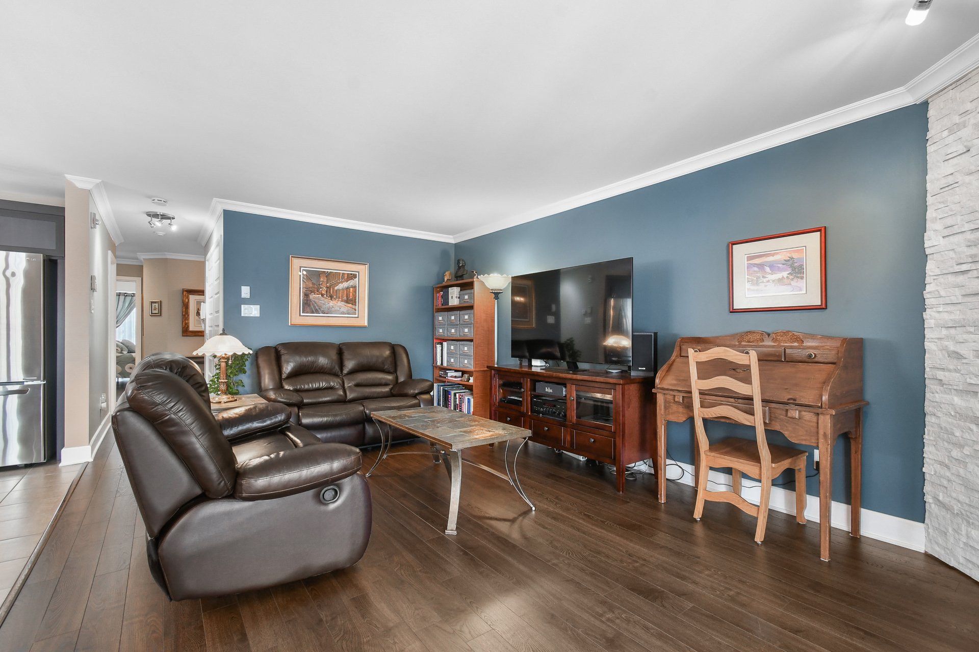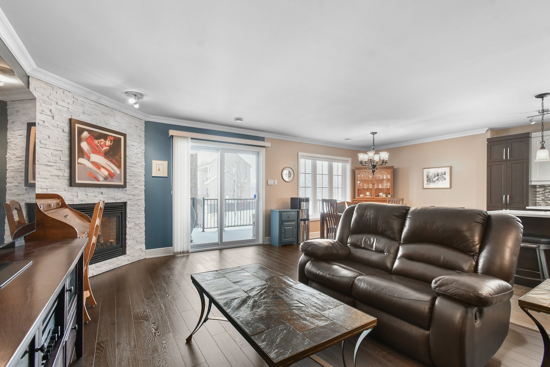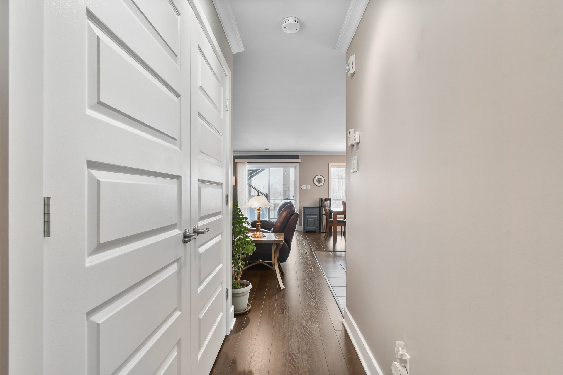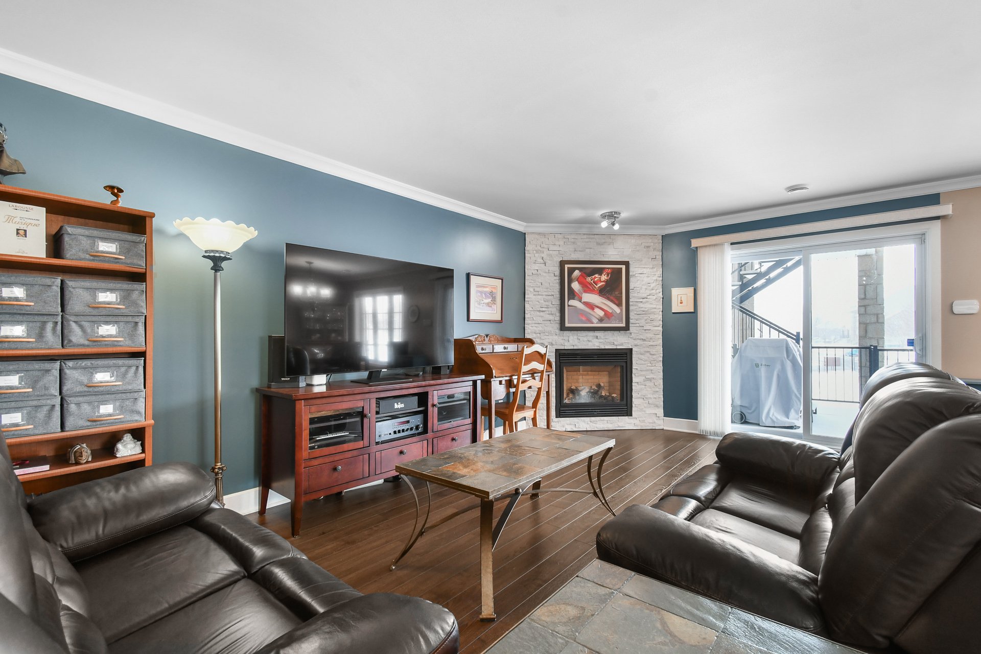 Beau condo situé au premier étage, adossé au parc de la Seigneurie et à son étang, avec garage et stationnement extérieur. Cuisine avec îlot et comptoirs de quartz, salon doté d'un foyer au gaz naturel, système central de chauffage avec climatiseur. Deux chambres, dont la chambre des maîtres avec walk-in. Grand balcon muni de toiles solaires, prise de gaz pour BBQ, vue arrière dégagée. Accès rapide aux autoroutes 25 et 640, près de tous les services et sentiers pesdestres du parc du grand Coteau. Libre le 21 février. Bienvenue!
