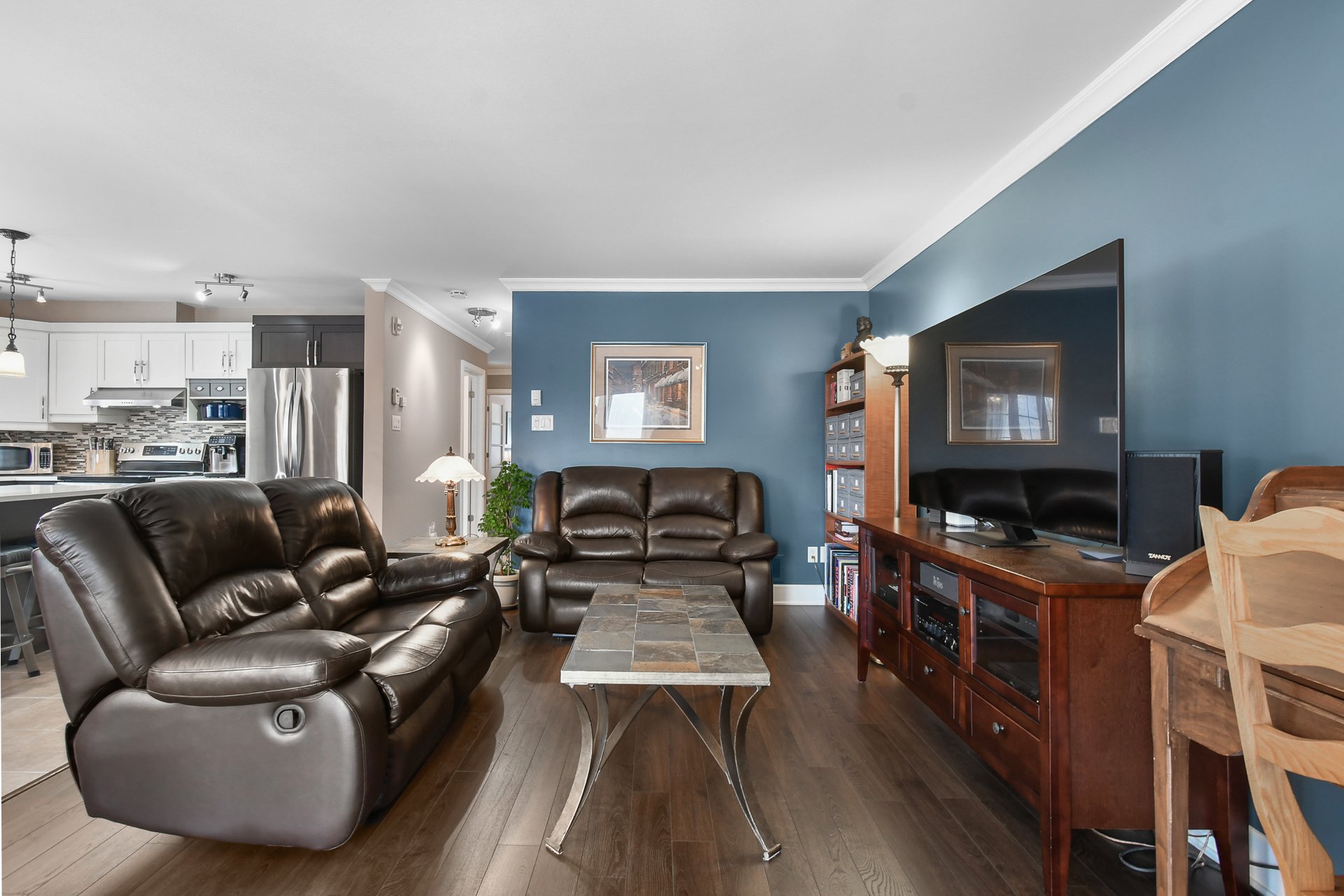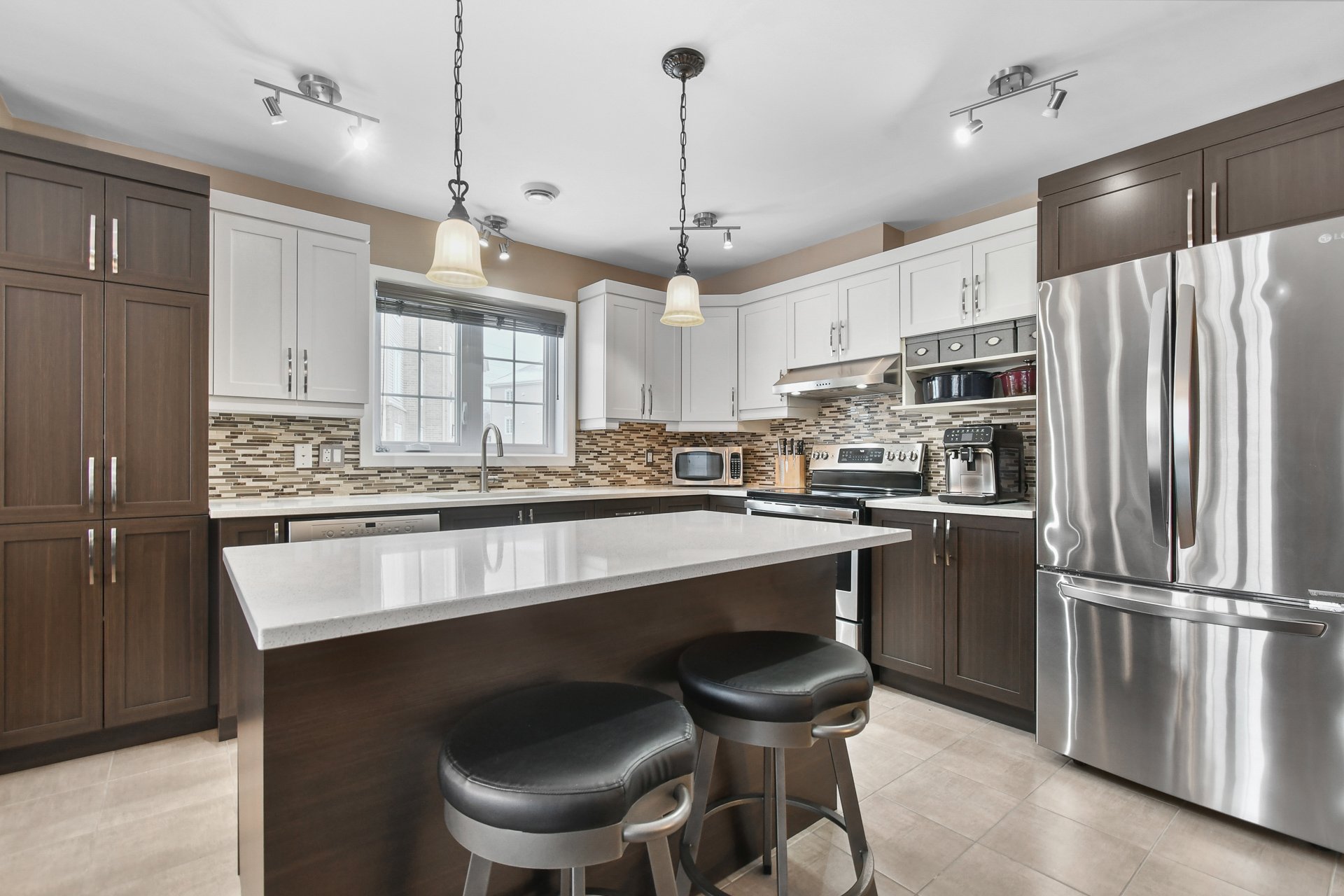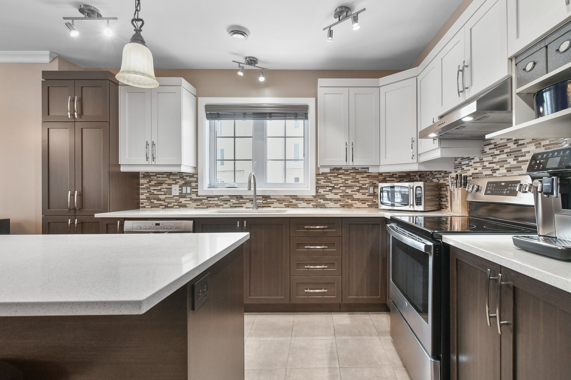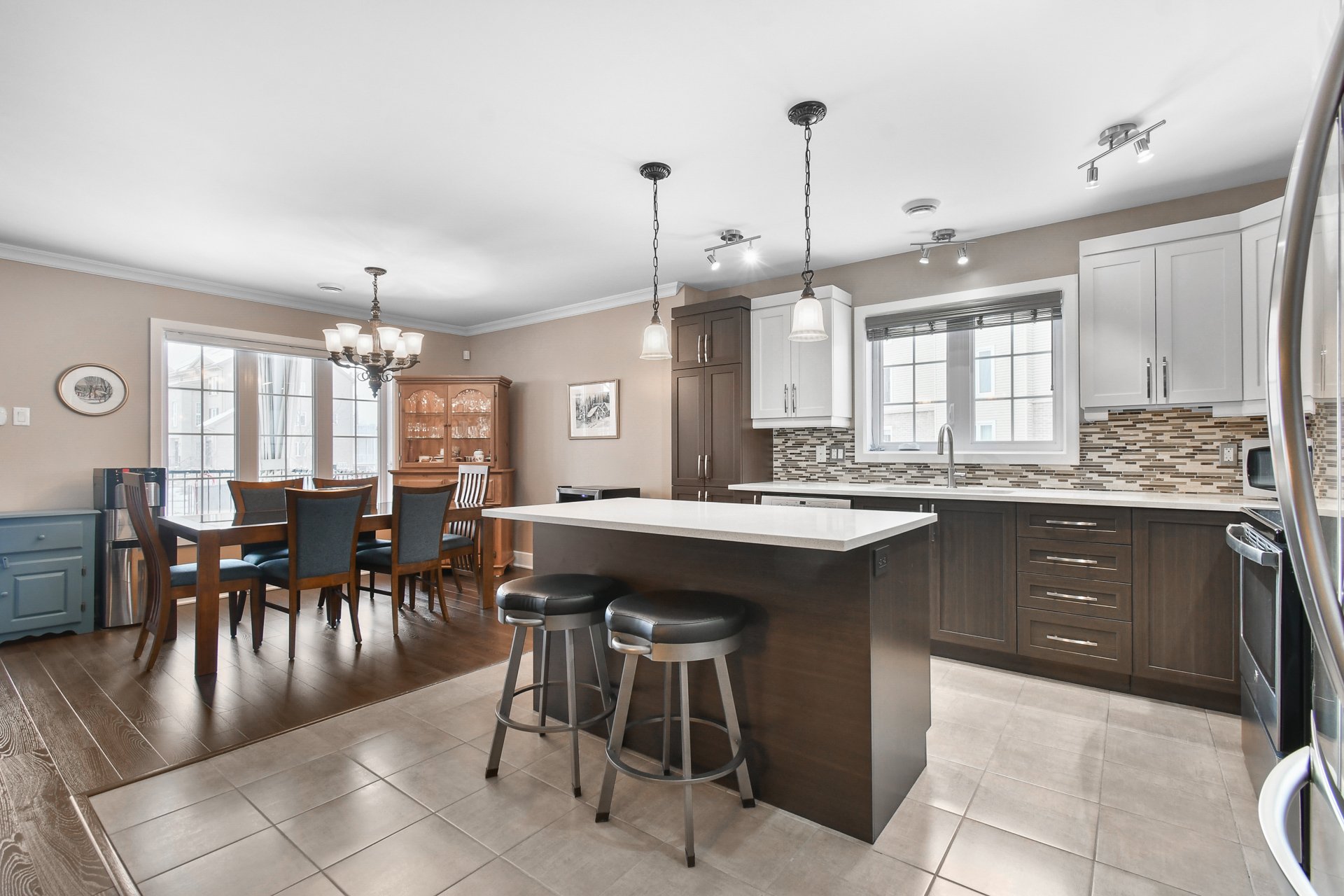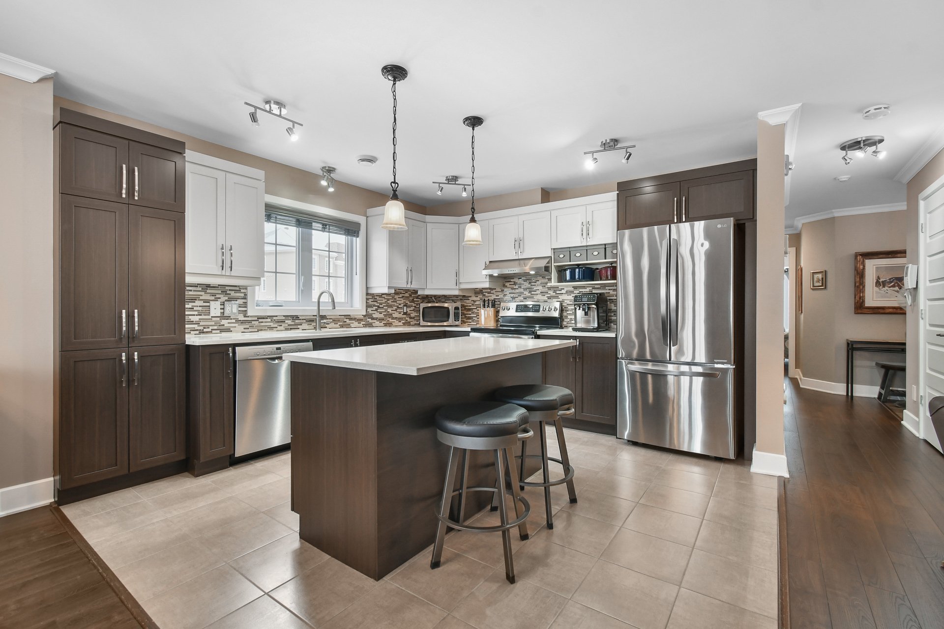Beau condo situé au premier étage, adossé au parc de la Seigneurie et à son étang, avec garage et stationnement extérieur. Cuisine avec îlot et comptoirs de quartz, salon doté d'un foyer au gaz naturel, système central de chauffage avec climatiseur. Deux chambres, dont la chambre des maîtres avec walk-in. Grand balcon muni de toiles solaires, prise de gaz pour BBQ, vue arrière dégagée. Accès rapide aux autoroutes 25 et 640, près de tous les services et sentiers pesdestres du parc du grand Coteau. Libre le 21 février. Bienvenue!