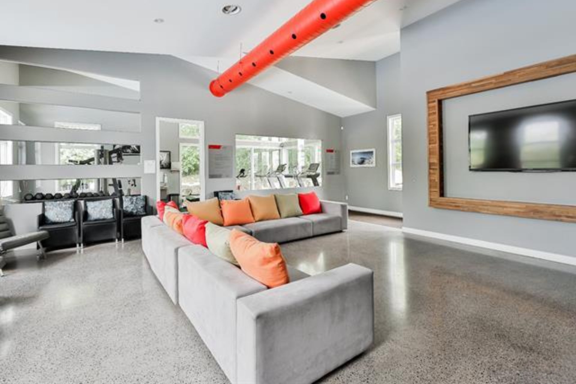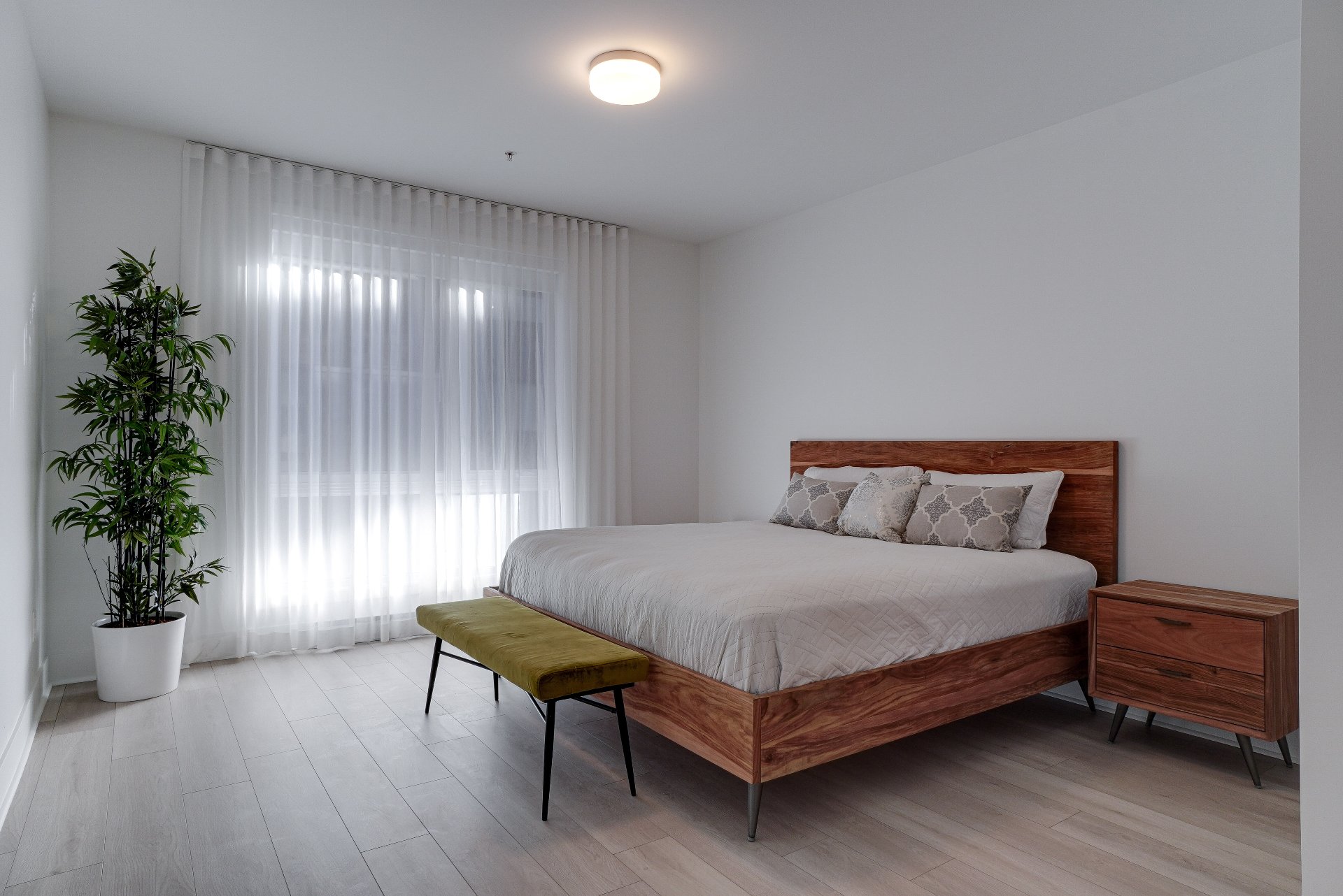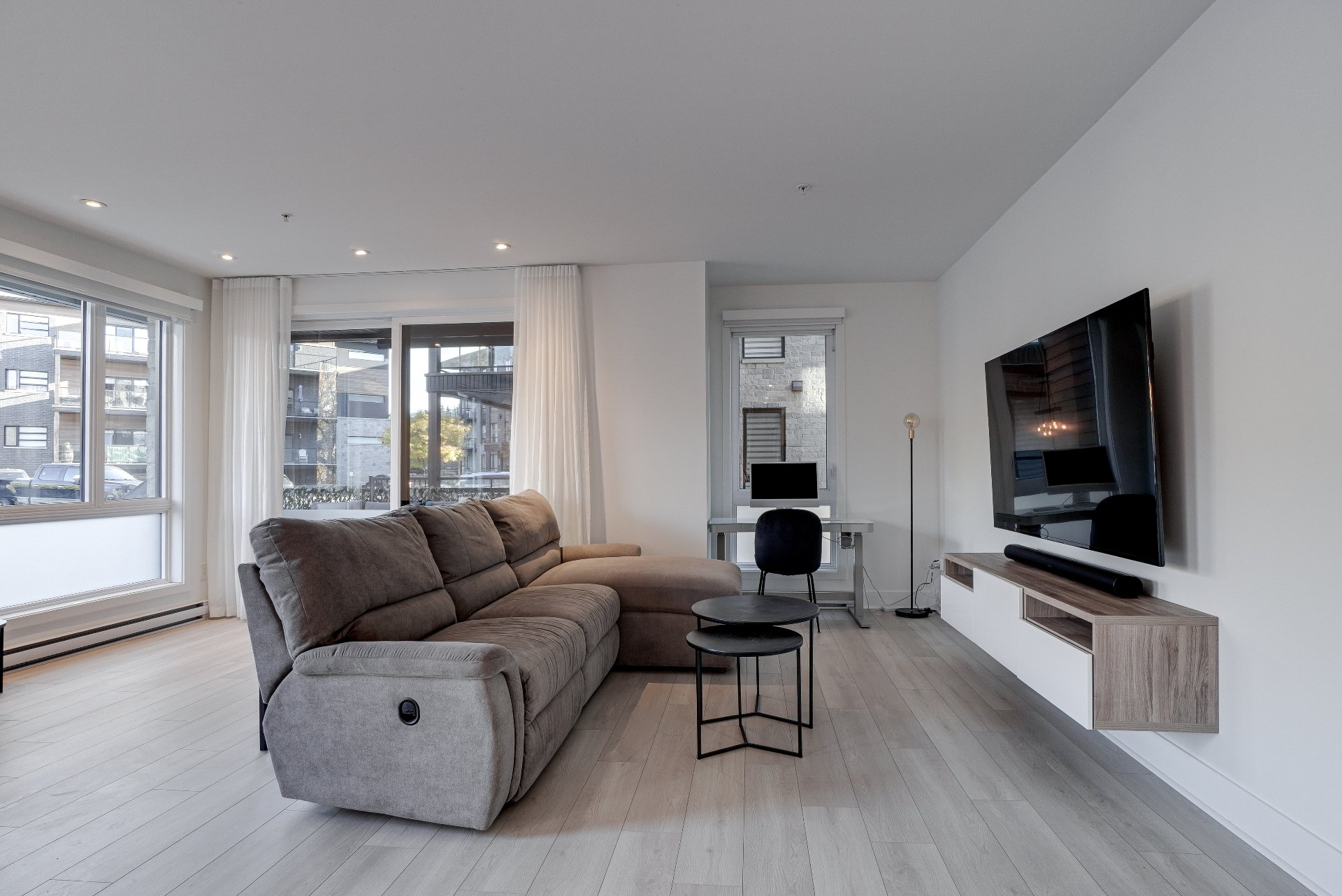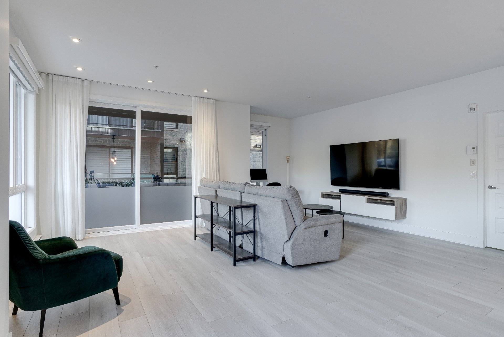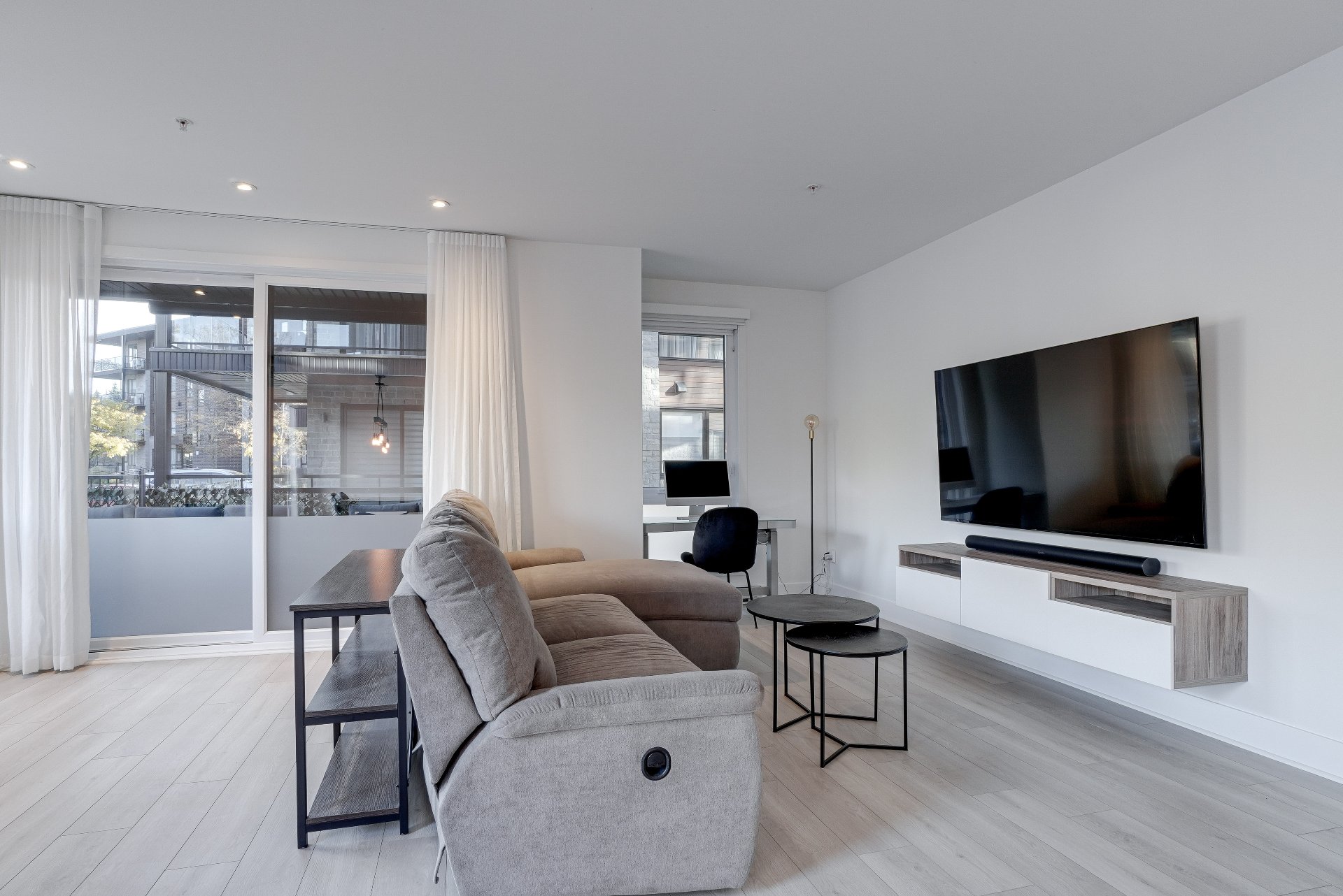 Luminaires, pôles, rideaux, stores motorisé de jour blanc et de nuit noir, meuble de TV et support TV, filage pour brancher une borne de recharge électrique avec un DCC. (Dispositif de commande et de coupure)