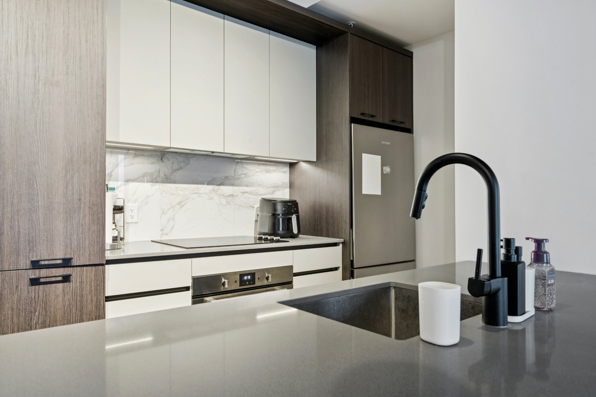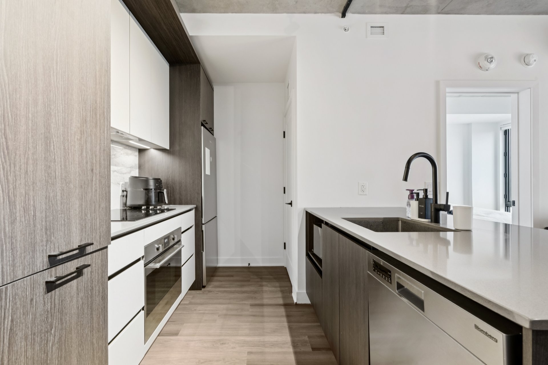 L'aire ouverte dévoile une cuisine au design raffiné, dotée