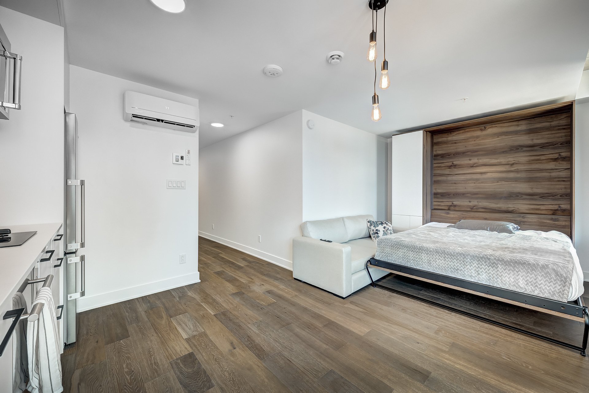 Fridge, microwave with oven functions, dishwasher, washer, dryer, blinds, light fixtures, Murphy bed(queen) and mattress, mattress cover/protector, couch, wall-mounted TV, 1 locker.