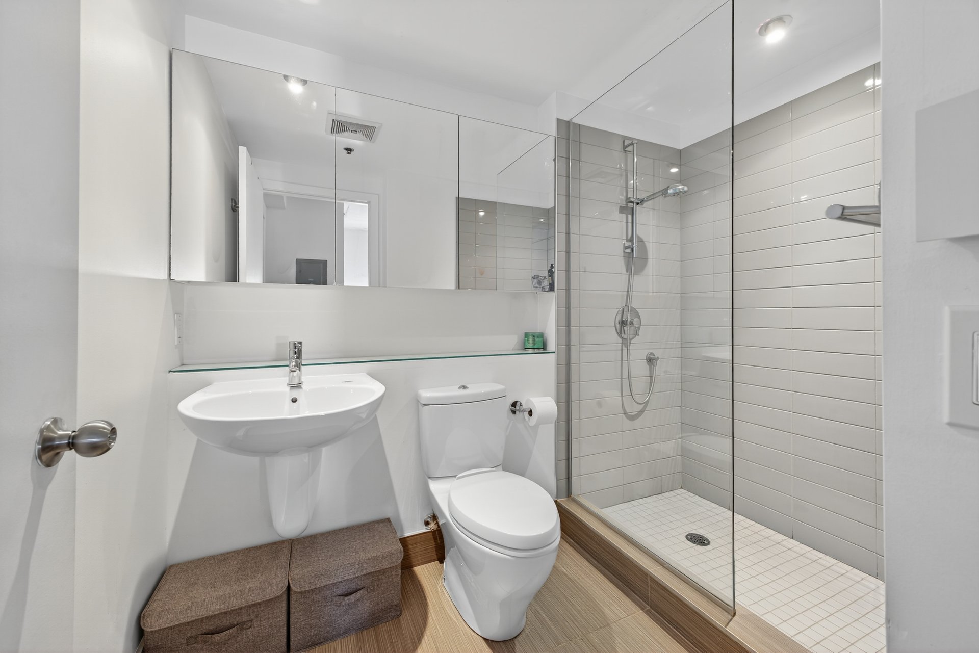 minimaliste avec une grande douche vitrée.