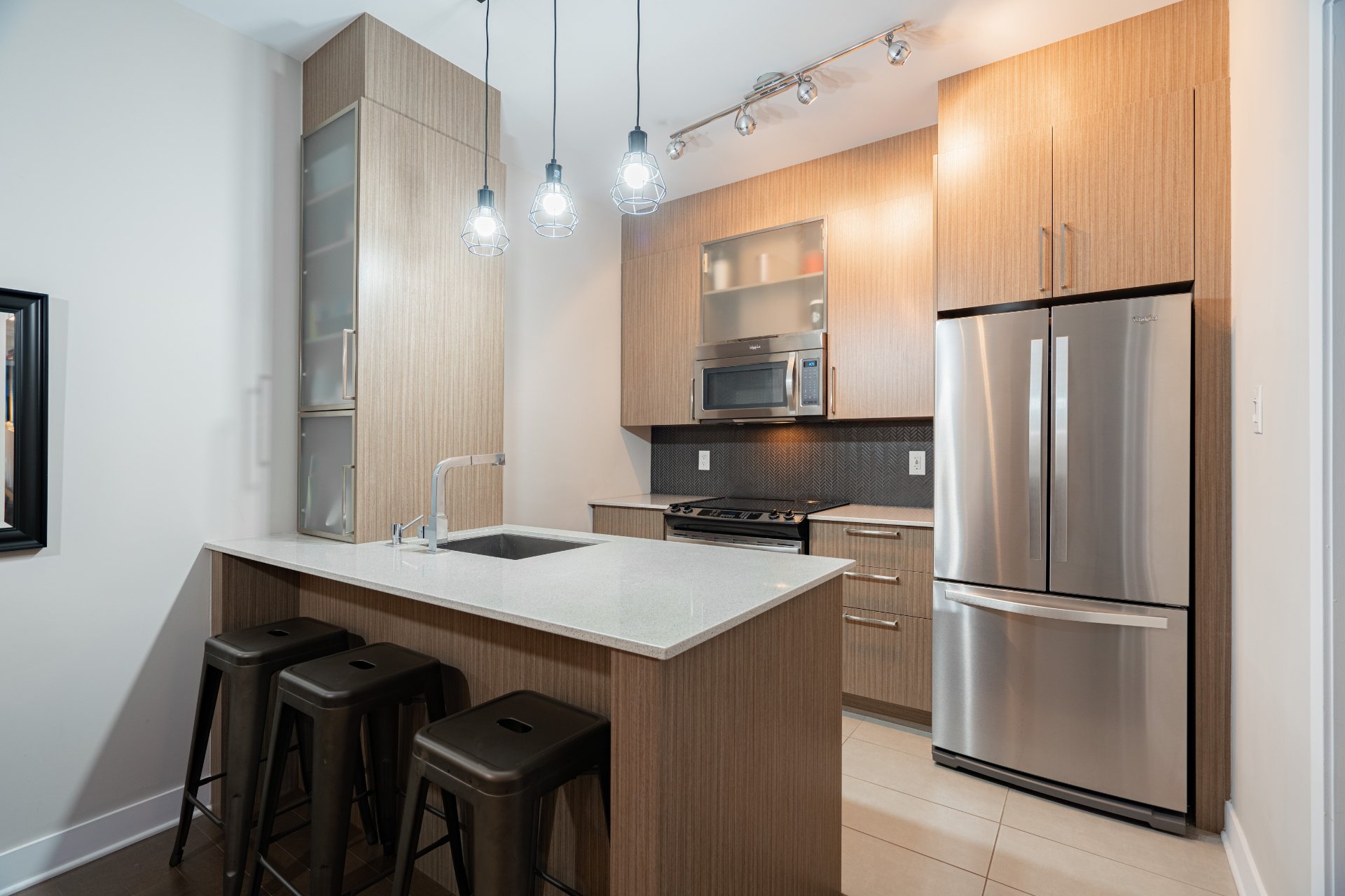 -Cuisine moderne avec îlot en quartz et nombreux rangements.