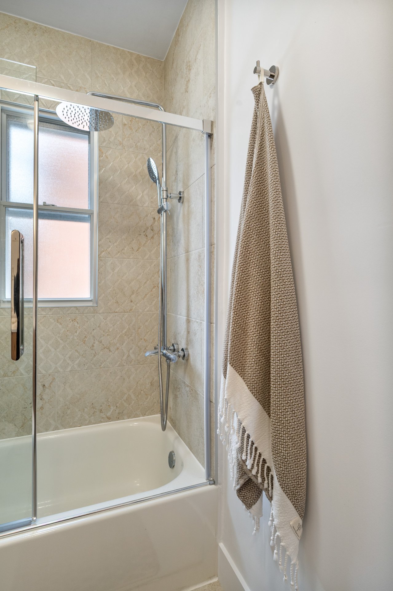 The bathroom is equipped with a tub/shower combination,
