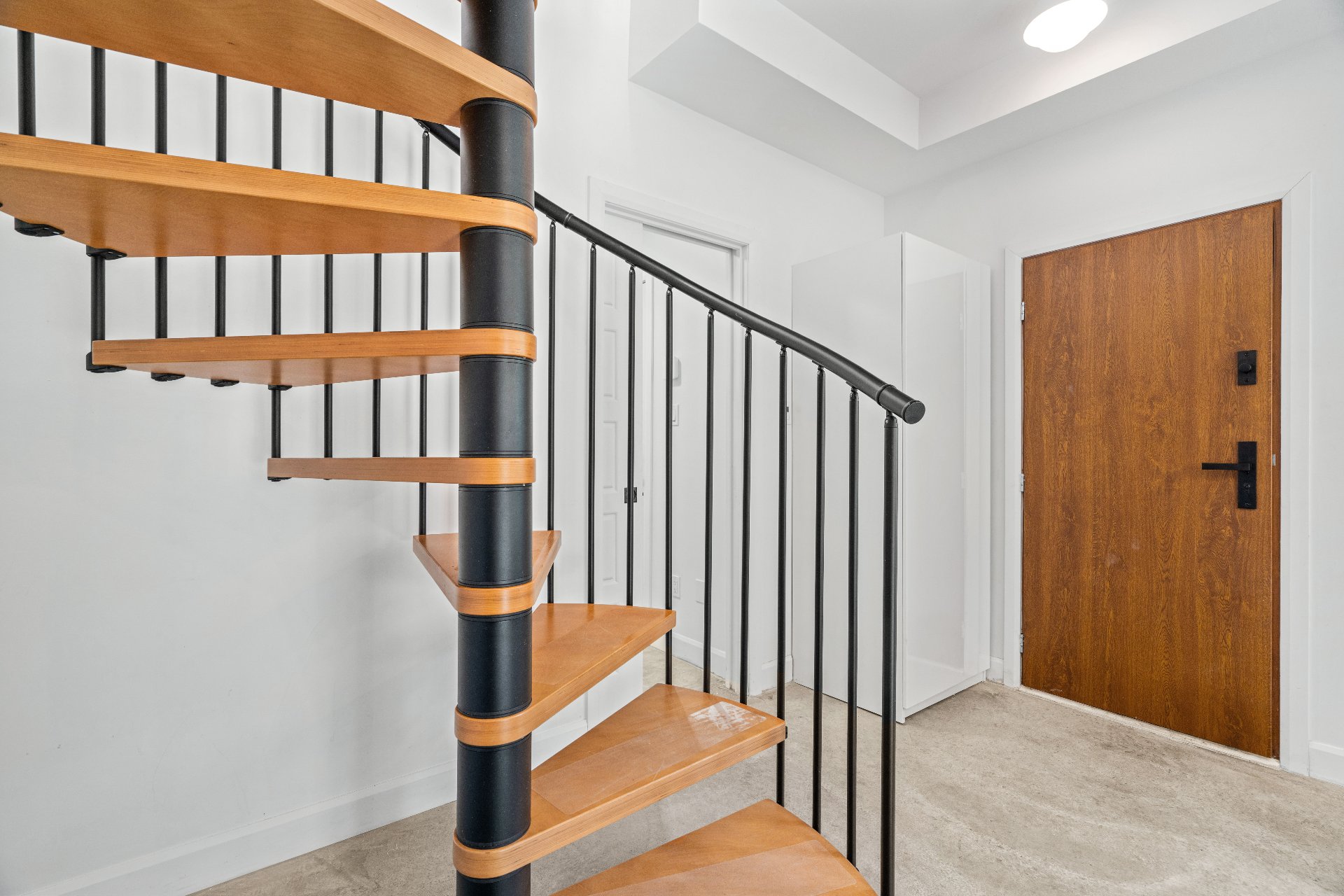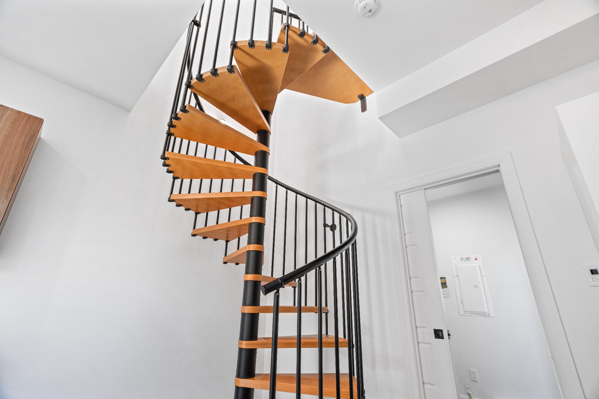 Un escalier en colimaçon élégant mène à l'étage, où une