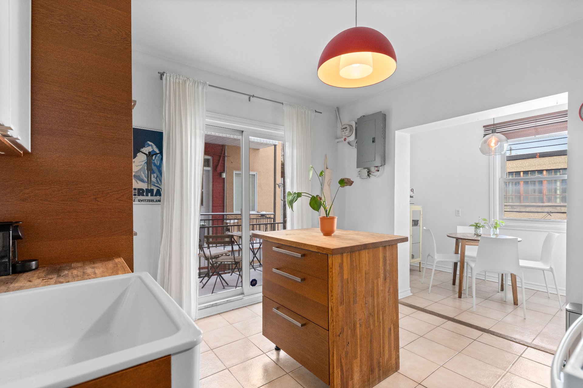 central, des comptoirs de bois et un buffet intégré,