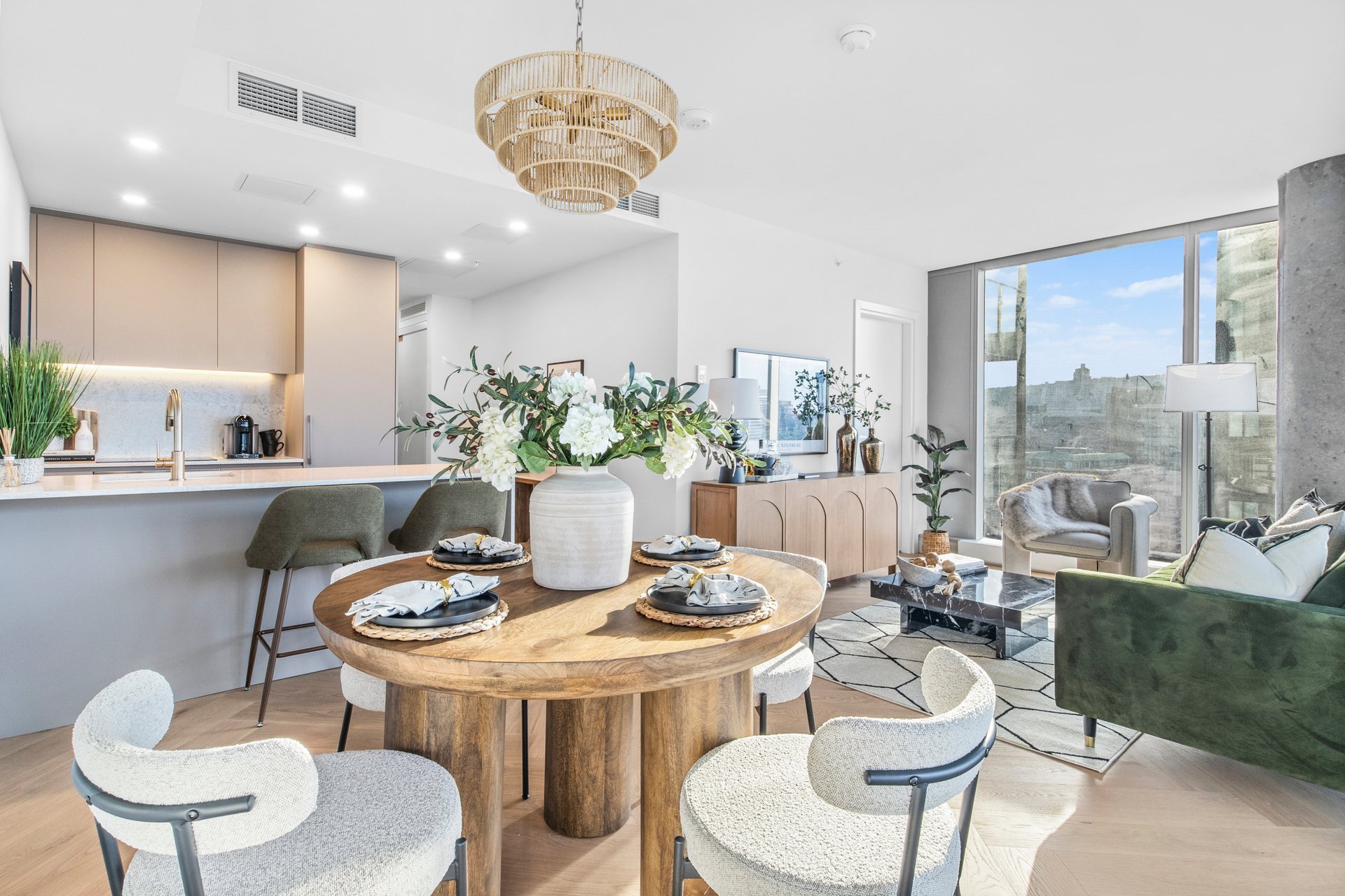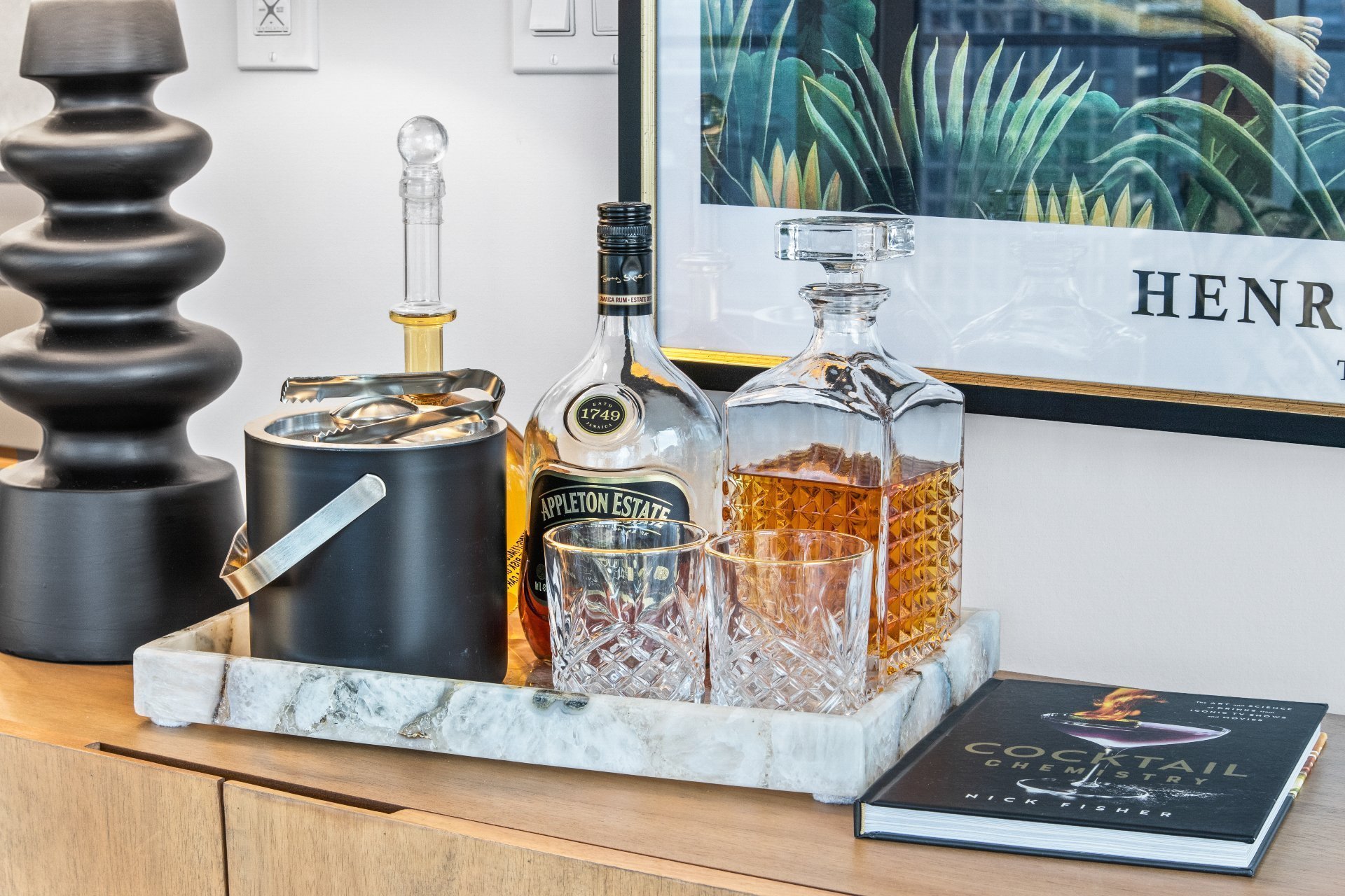 FULLY FURNISHED RENTAL WITH PENTHOUSE PACKAGE upgrades throughout unit (i.e. herringbone wood floors, brass fixtures, etc.). New designer-style furniture, light fixtures + fridge, stove, microwave, dishwasher, washer/...