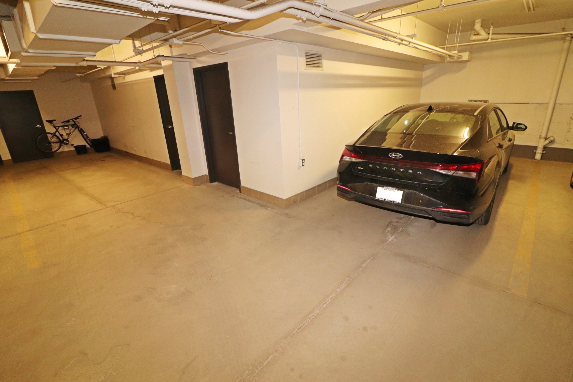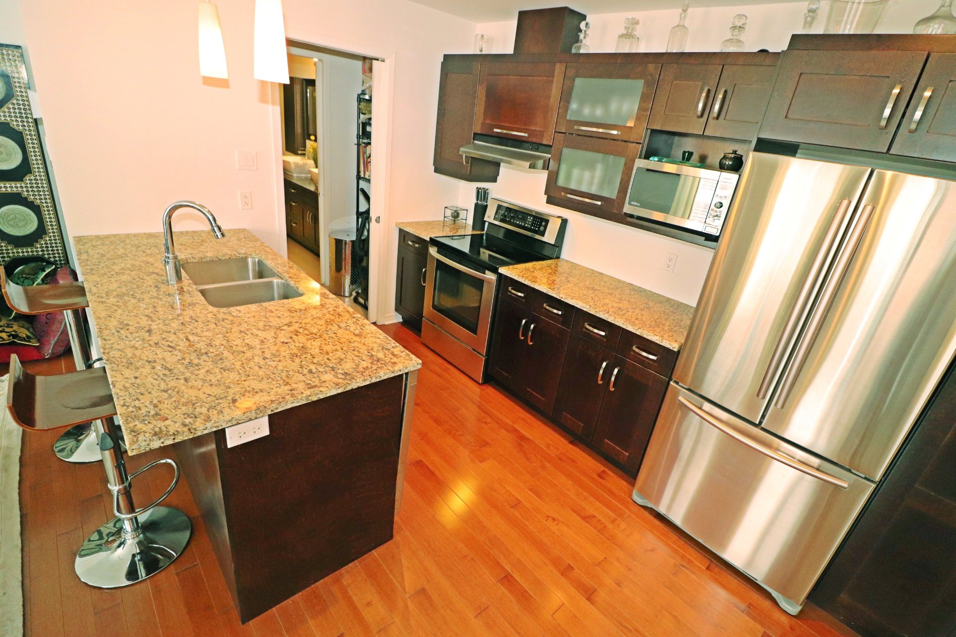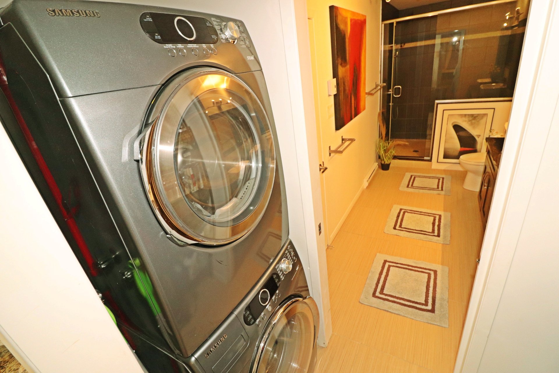 Un espace de stationnement intérieur et un casier au sous-sol, luminaires, réfrigérateur, cuisinière, lave-vaisselle, laveuse, sécheuse, un climatiseur, rails, stores horizontaux pour fenêtres.