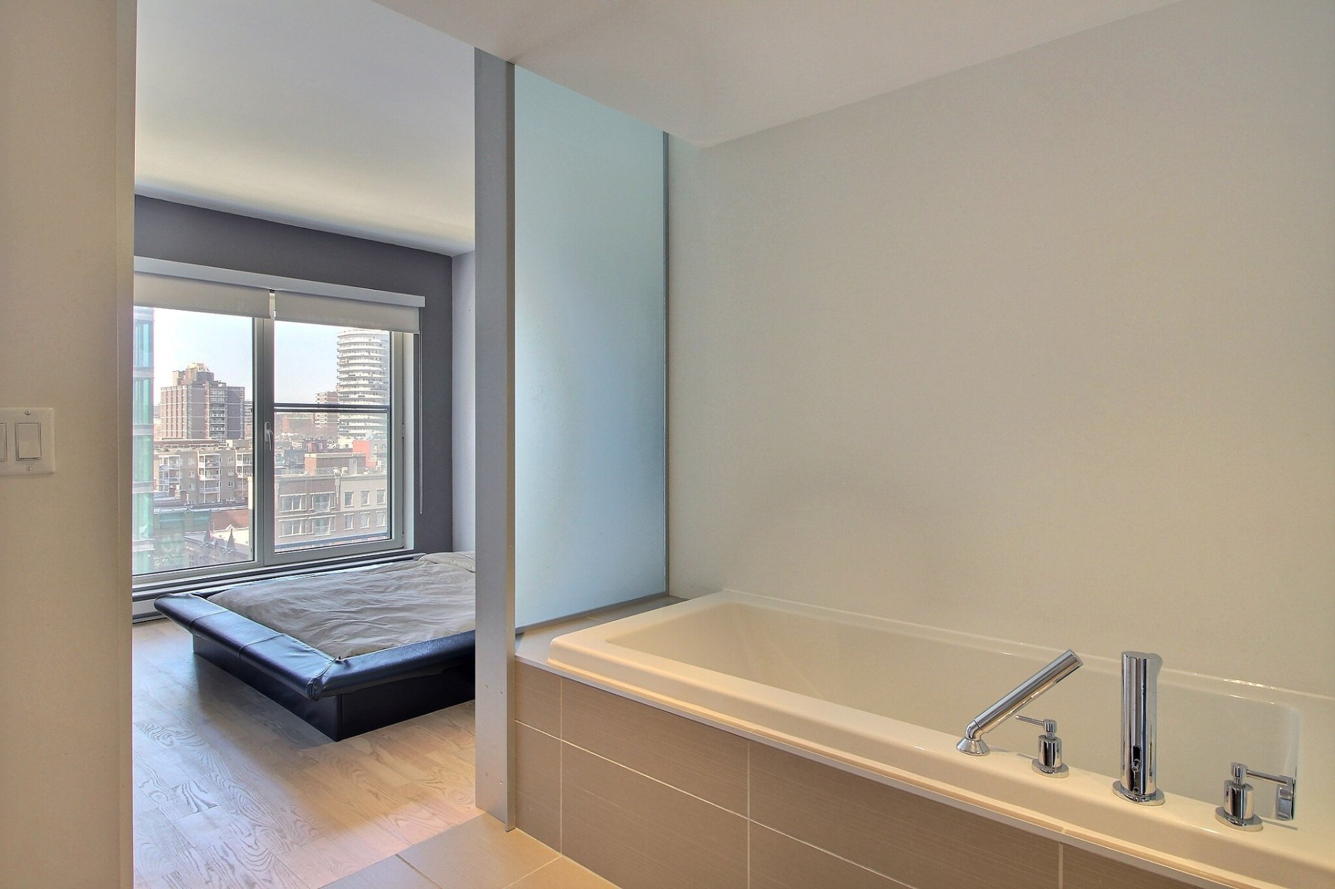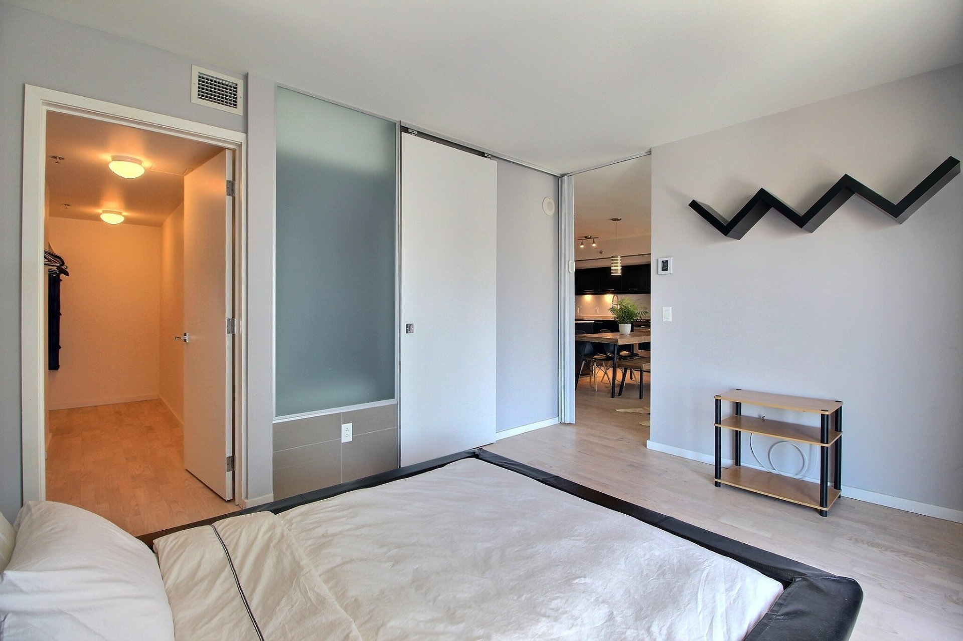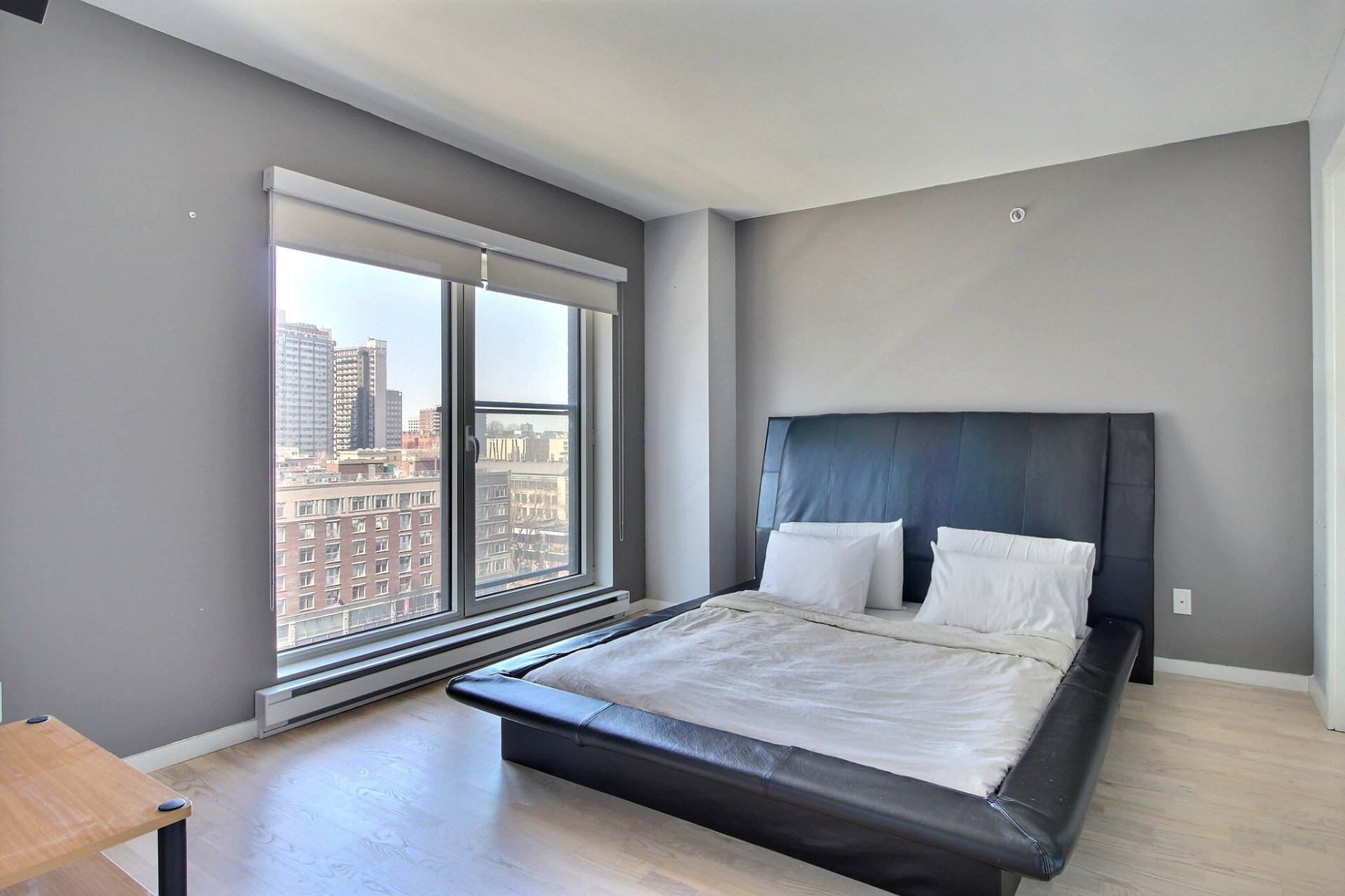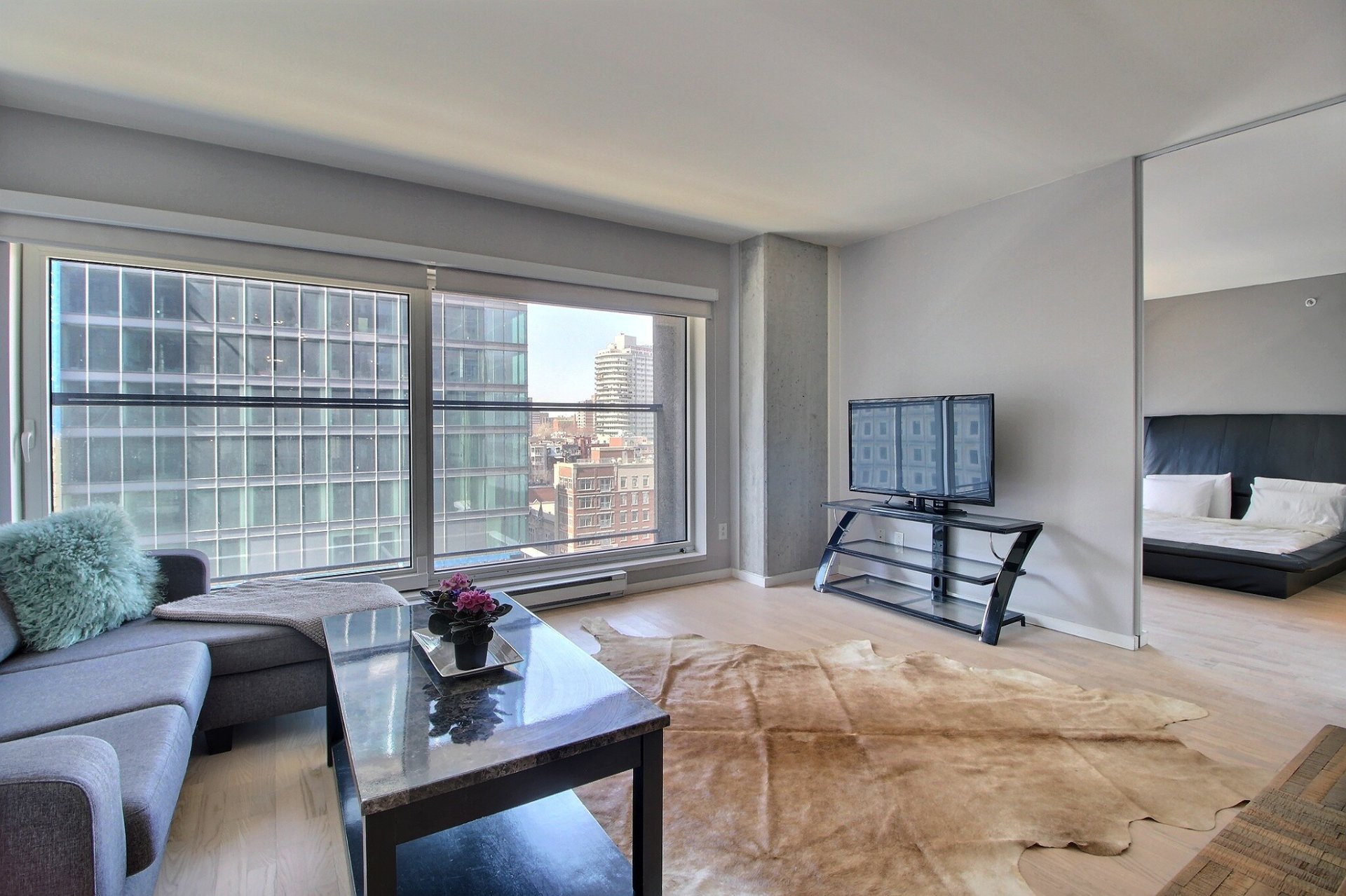 Impeccable condo on the 11th floor; ** Free Feb 1st 2026 occupancy ** A bedroom with adjoining bathroom -- walk-in closet; Living space without partitions -- dining room and kitchen; Appliances included as well as furniture; The common living areas include a library/living room giving access to the garden. A combined training room with swimming pool and sauna. 24 hour security guard in the lobby and common areas. Four elevators which are also monitored by cameras 24 hours a day. Exceptional location, in the heart of the Quartier des Spectacles.