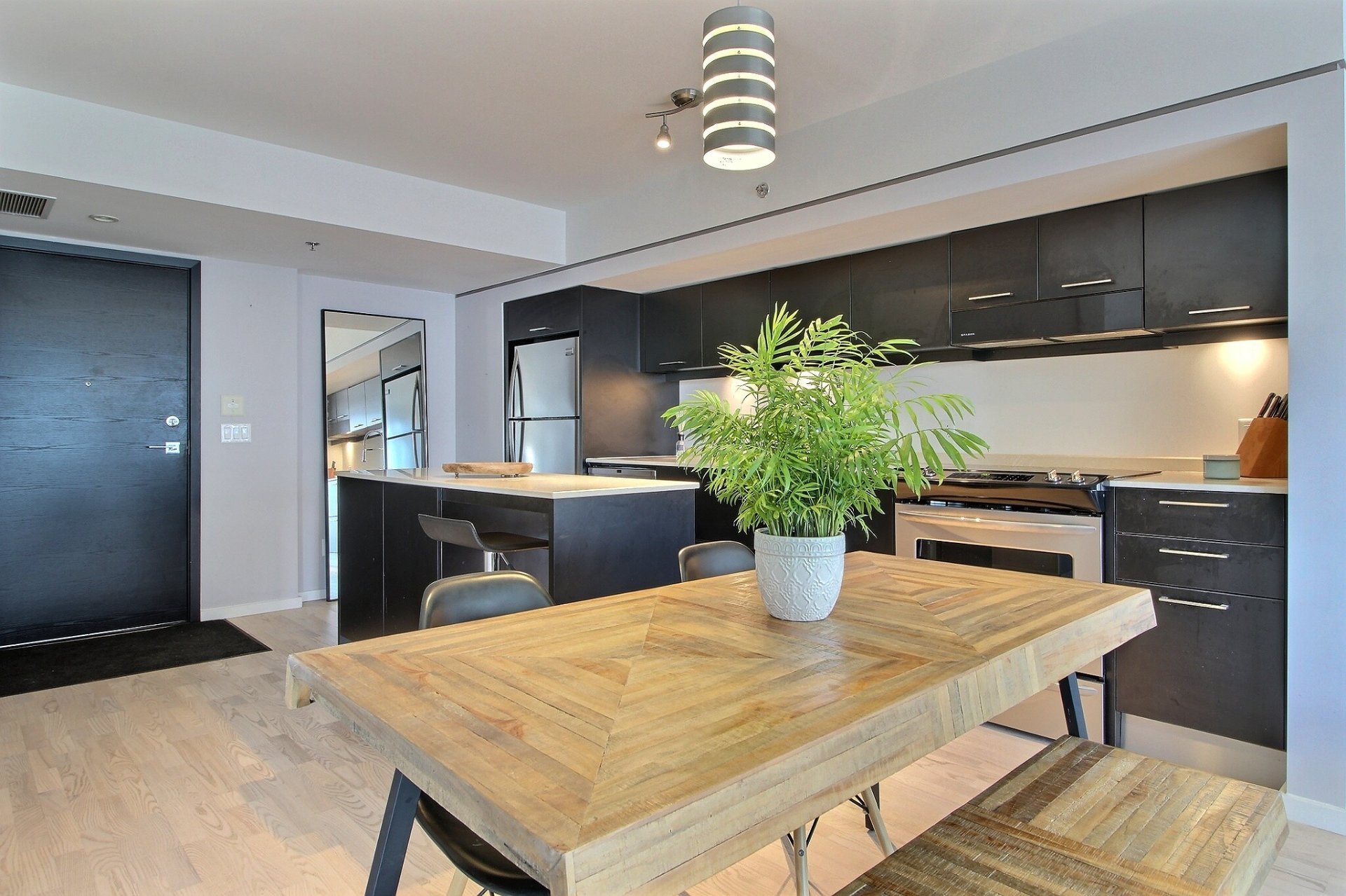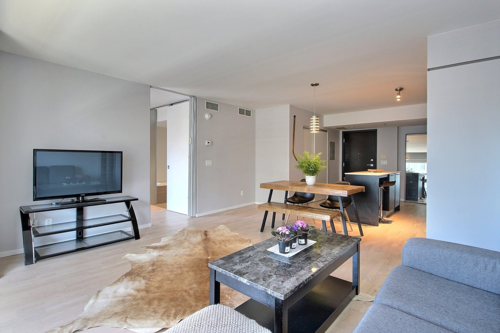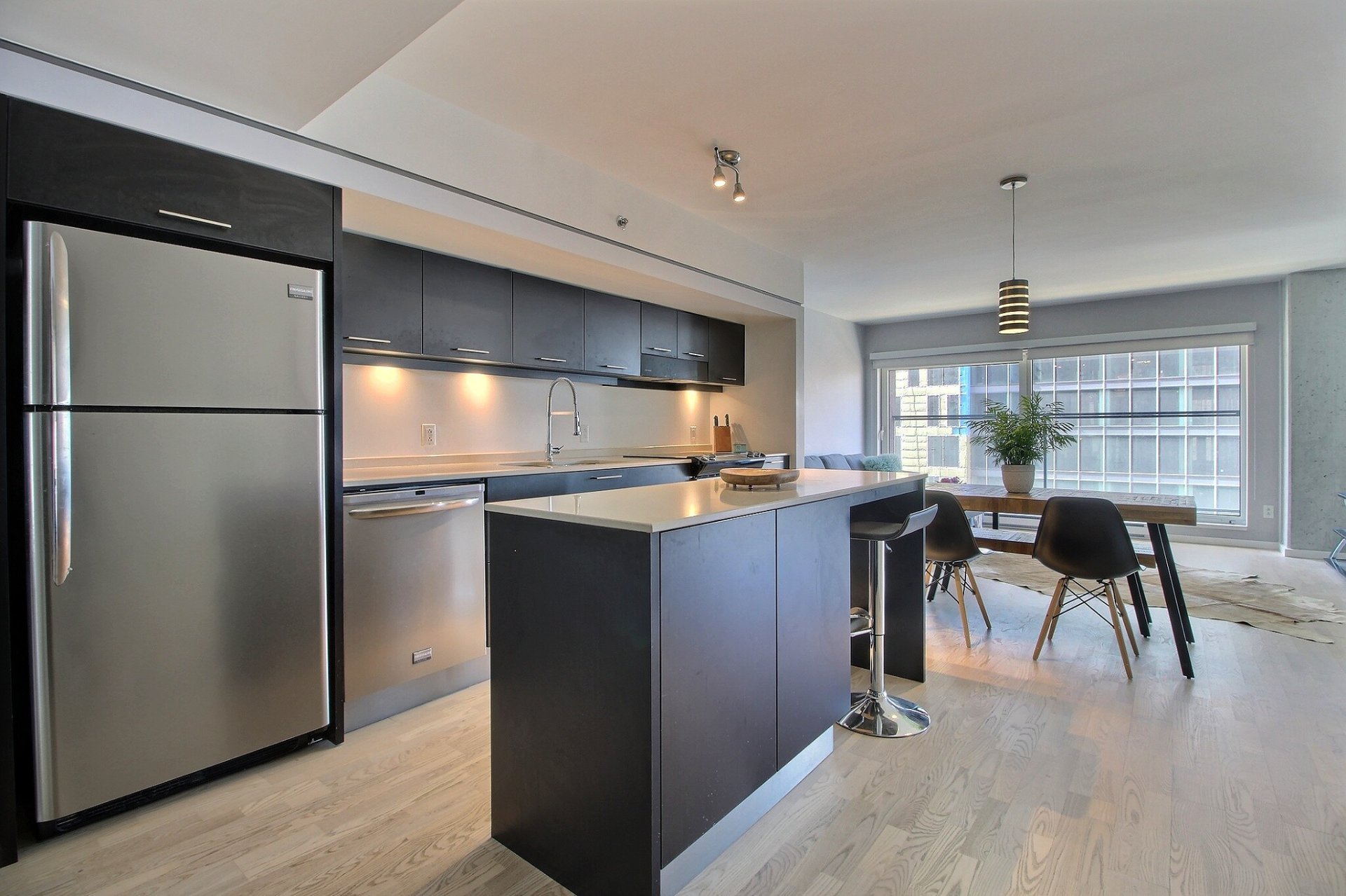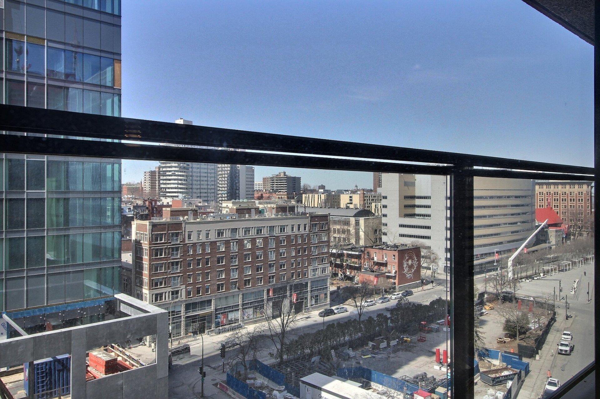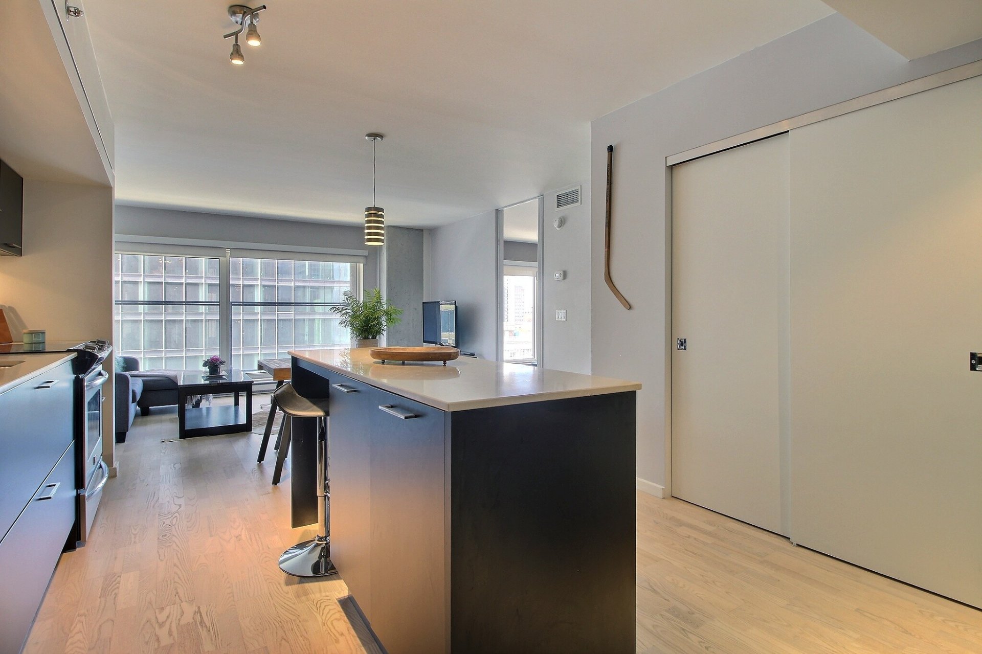 Impeccable condo on the 11th floor; ** Free Feb 1st 2026 occupancy ** A bedroom with adjoining bathroom -- walk-in closet; Living space without partitions -- dining room and kitchen; Appliances included as well as furniture; The common living areas include a library/living room giving access to the garden. A combined training room with swimming pool and sauna. 24 hour security guard in the lobby and common areas. Four elevators which are also monitored by cameras 24 hours a day. Exceptional location, in the heart of the Quartier des Spectacles.