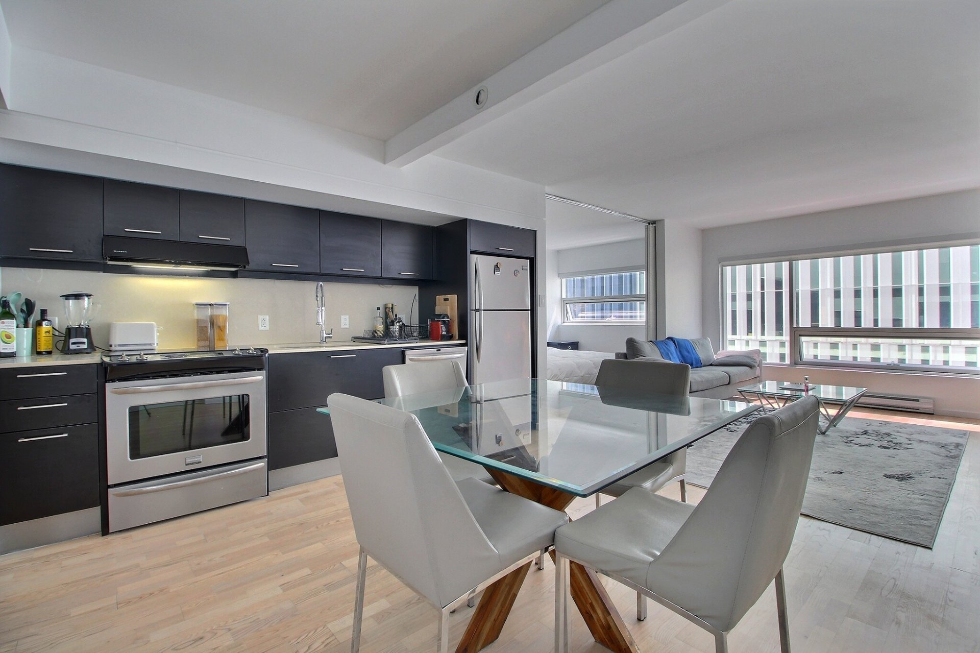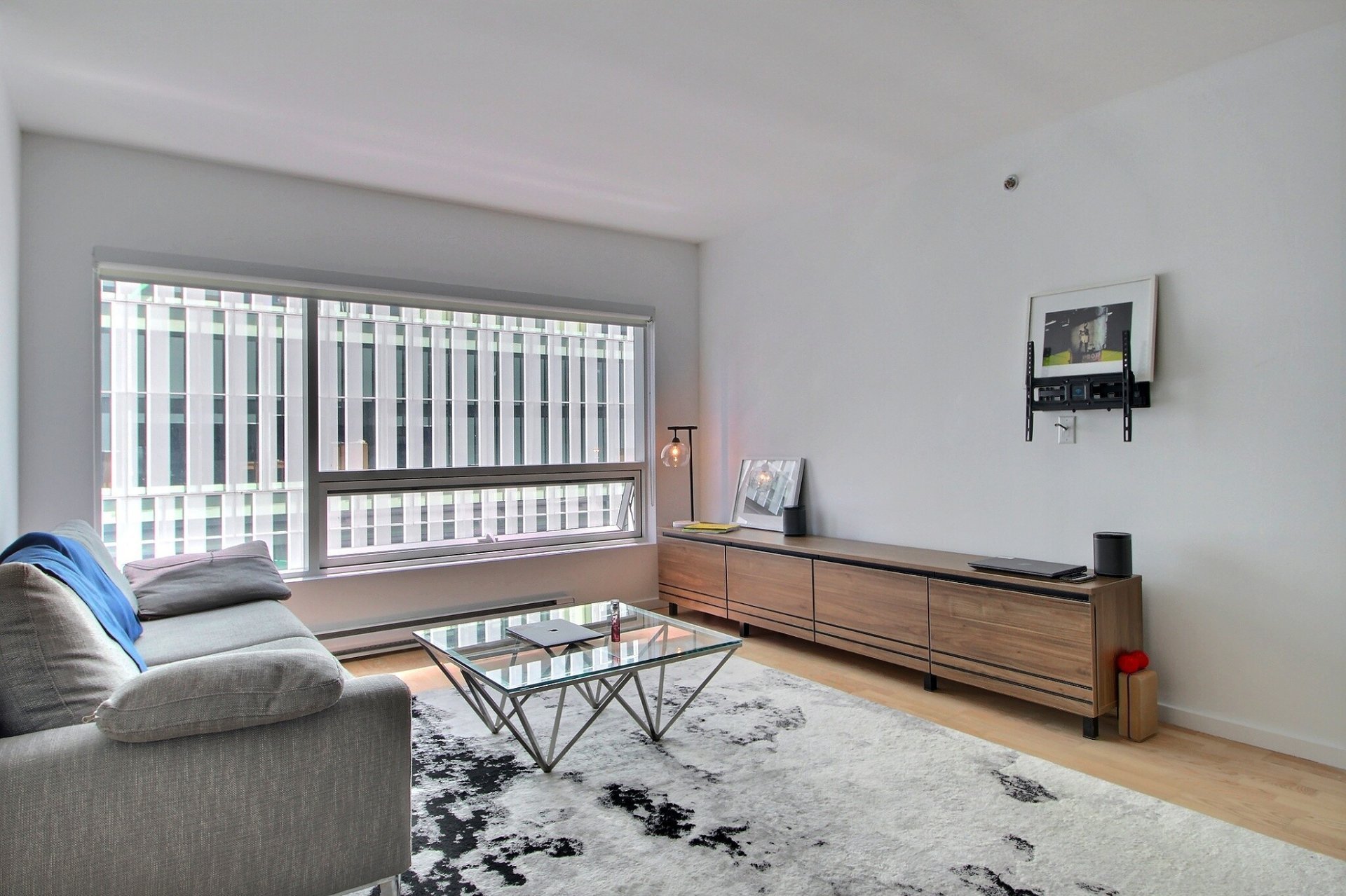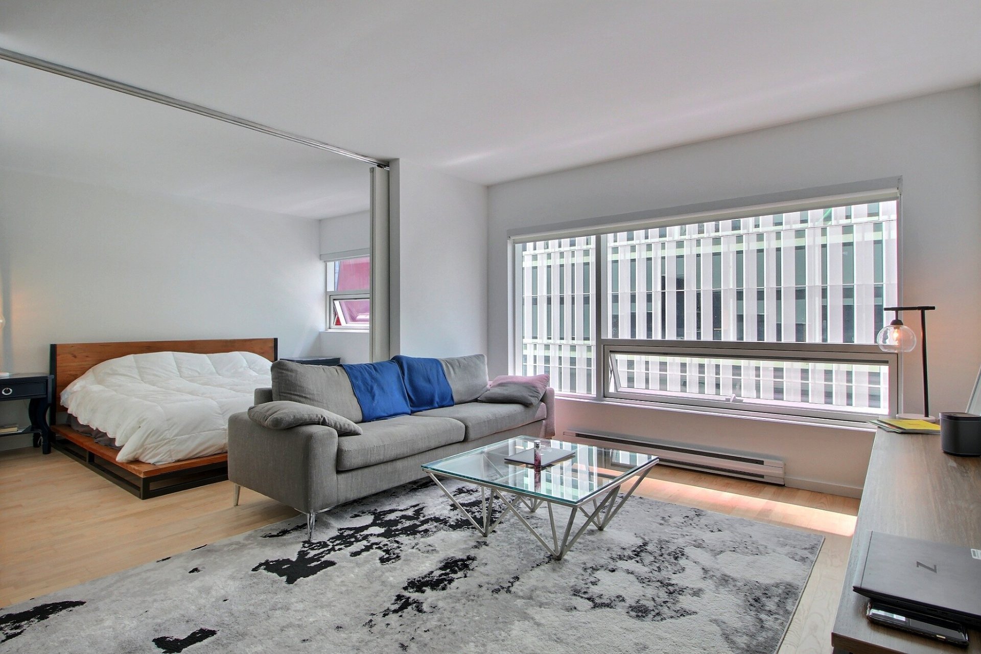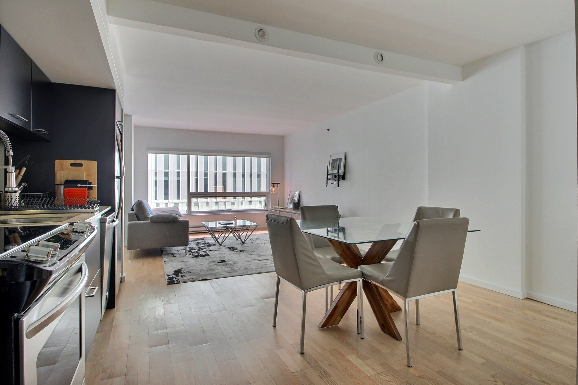 Au coeur du Quartier des Spectacles. L'unité comprend une chambre à coucher avec salle de bains attenante, une aire ouverte lumineuse (salon, cuisine et salle à manger), ainsi qu'un espace de rangement (#415). Tous les meubles sont inclus dans la vente. Profitez d'un accès direct à la station de métro Place-des-Arts, d'un service de sécurité 24/7, d'une piscine, d'un gym, d'un sauna, et d'un jardin-terrasse paisible. Une vie urbaine pratique et élégante, à distance de marche des meilleurs attraits culturels et commerciaux de Montréal. Occupation des lieux : 1er septembre. Stationnement inclus.