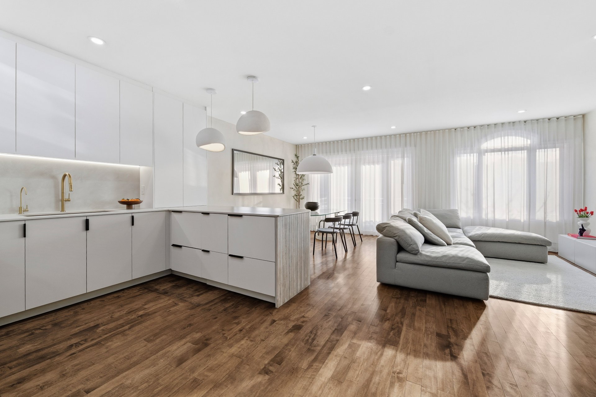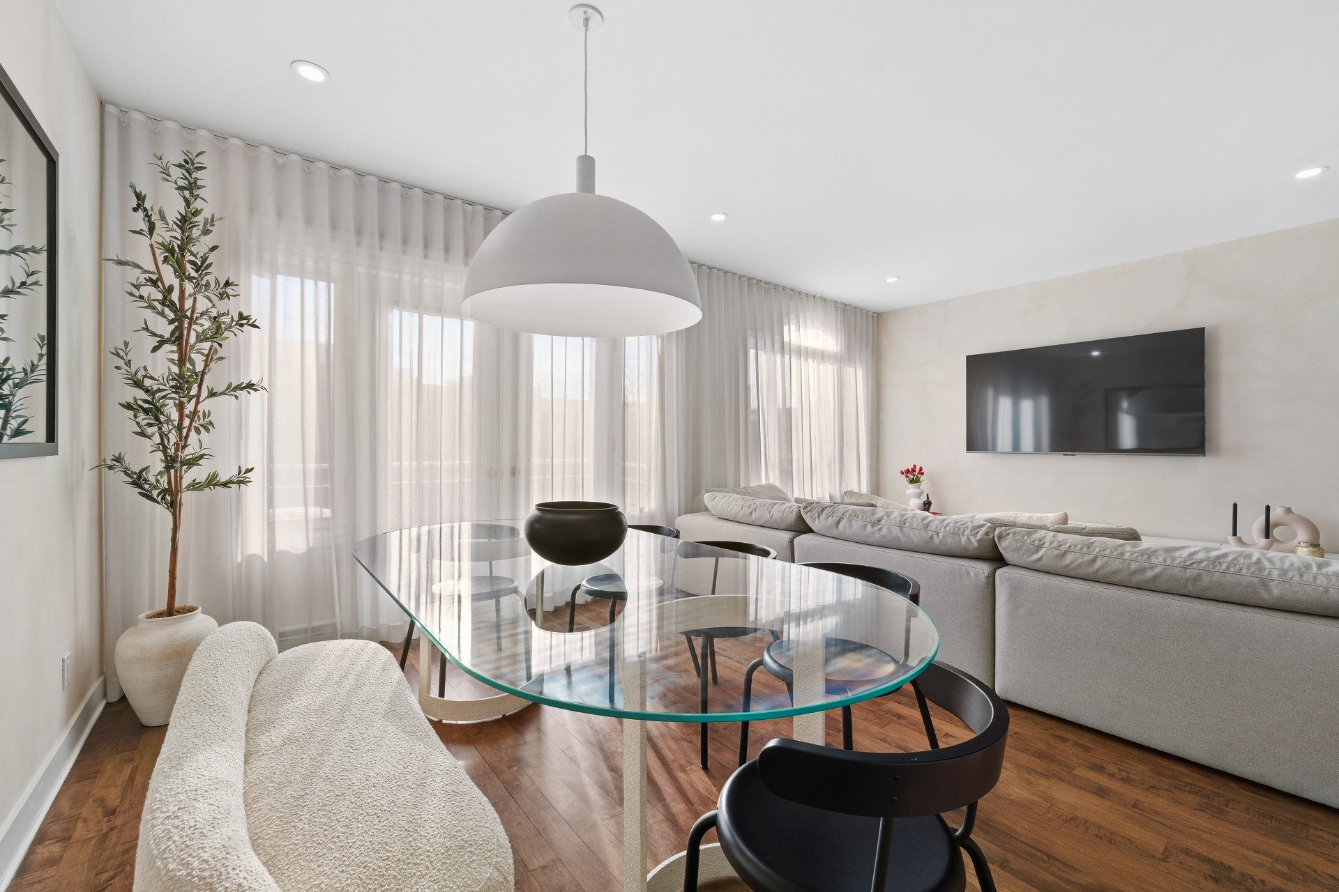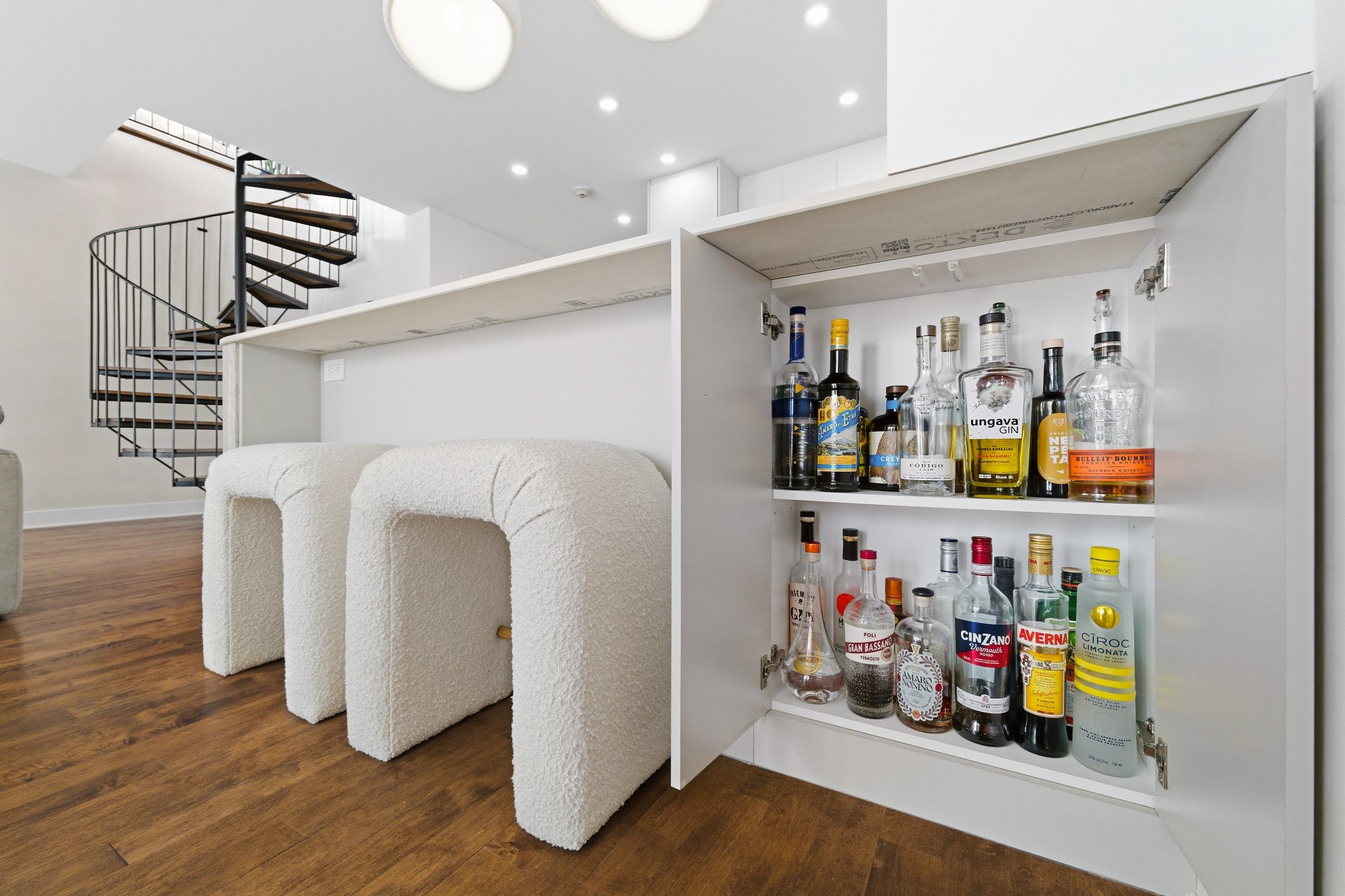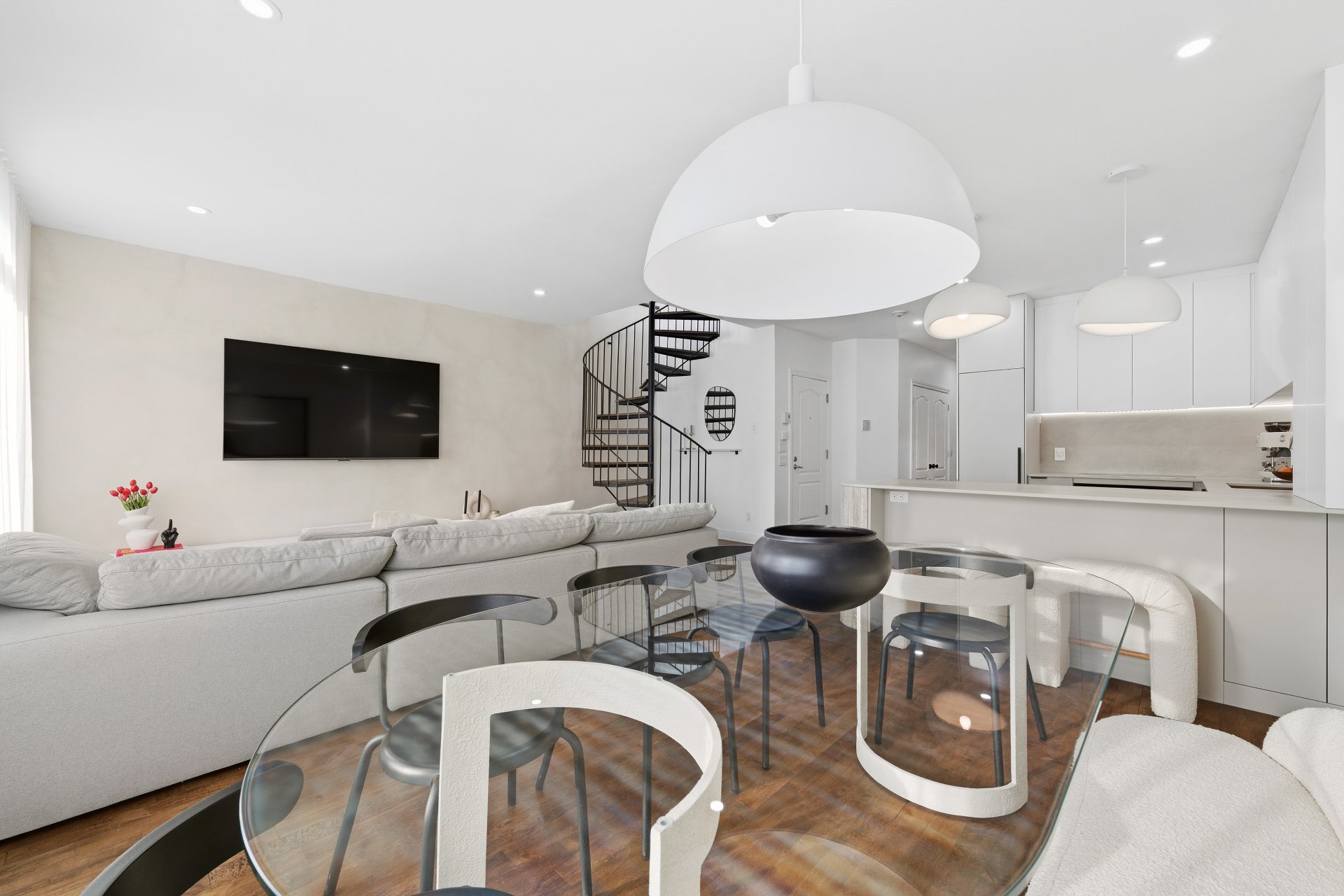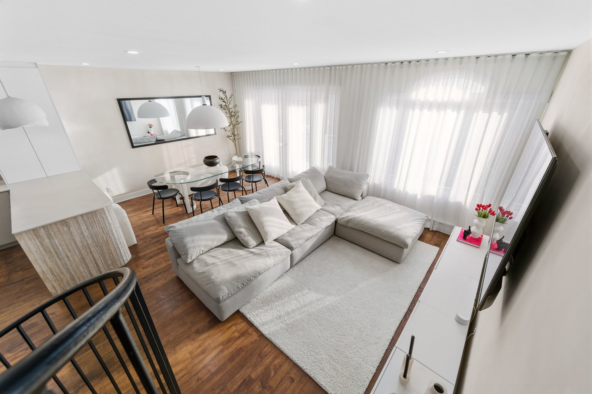 CUISINE : Réfrigérateur LG entièrement intégré, lave-vaisselle Fisher & Paykel à deux tiroirs intégrés, four GE, plaque à induction Frigidaire et micro-ondes Danby dissimulé. SALON / SALLE À MANGER : Stores filtrant la lumière, rideaux voilages sur mesure pleine hauteur, domotique Kasa compatible Alexa et Wi-Fi. CHAMBRE RDC : Rideaux et stores occultants pleine hauteur. MEZZANINE : Canapé-lit inclus.