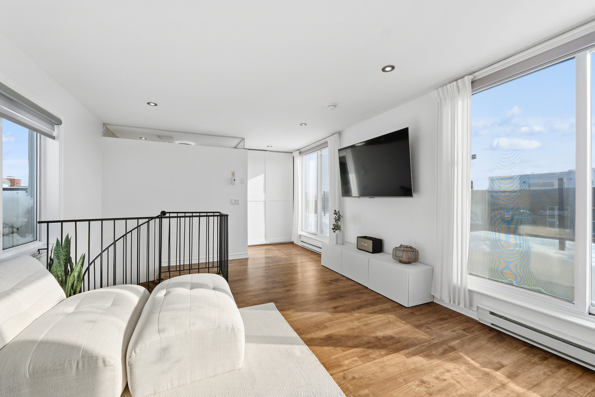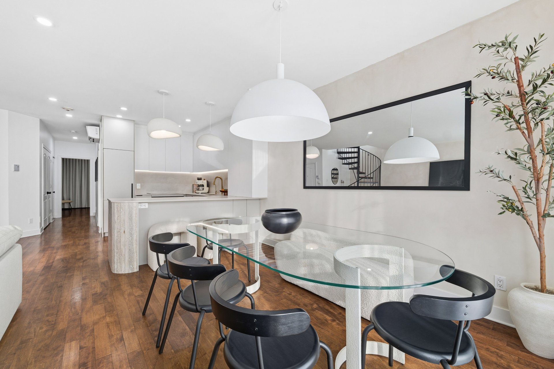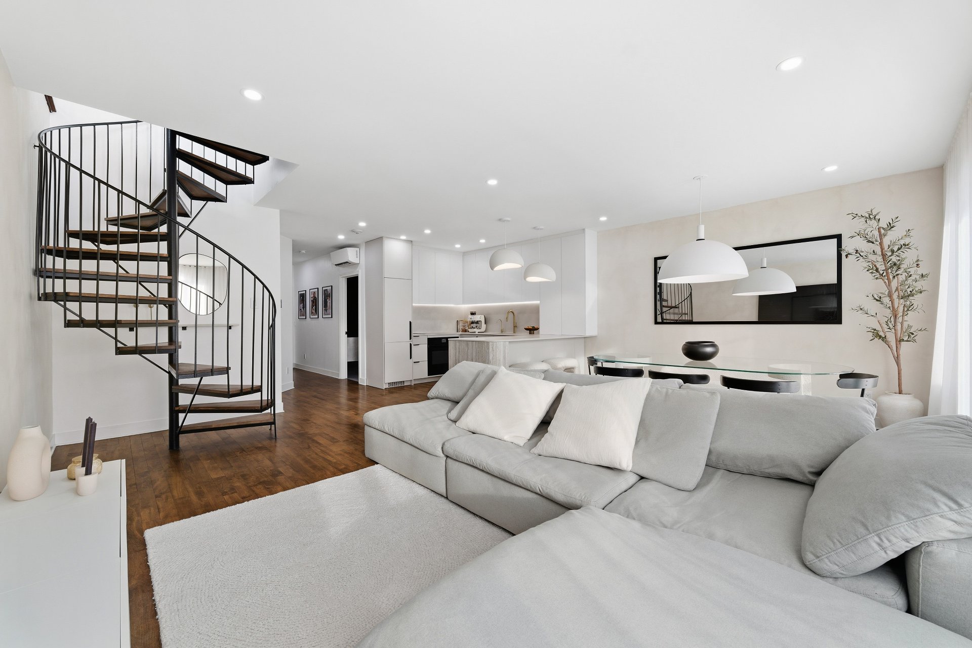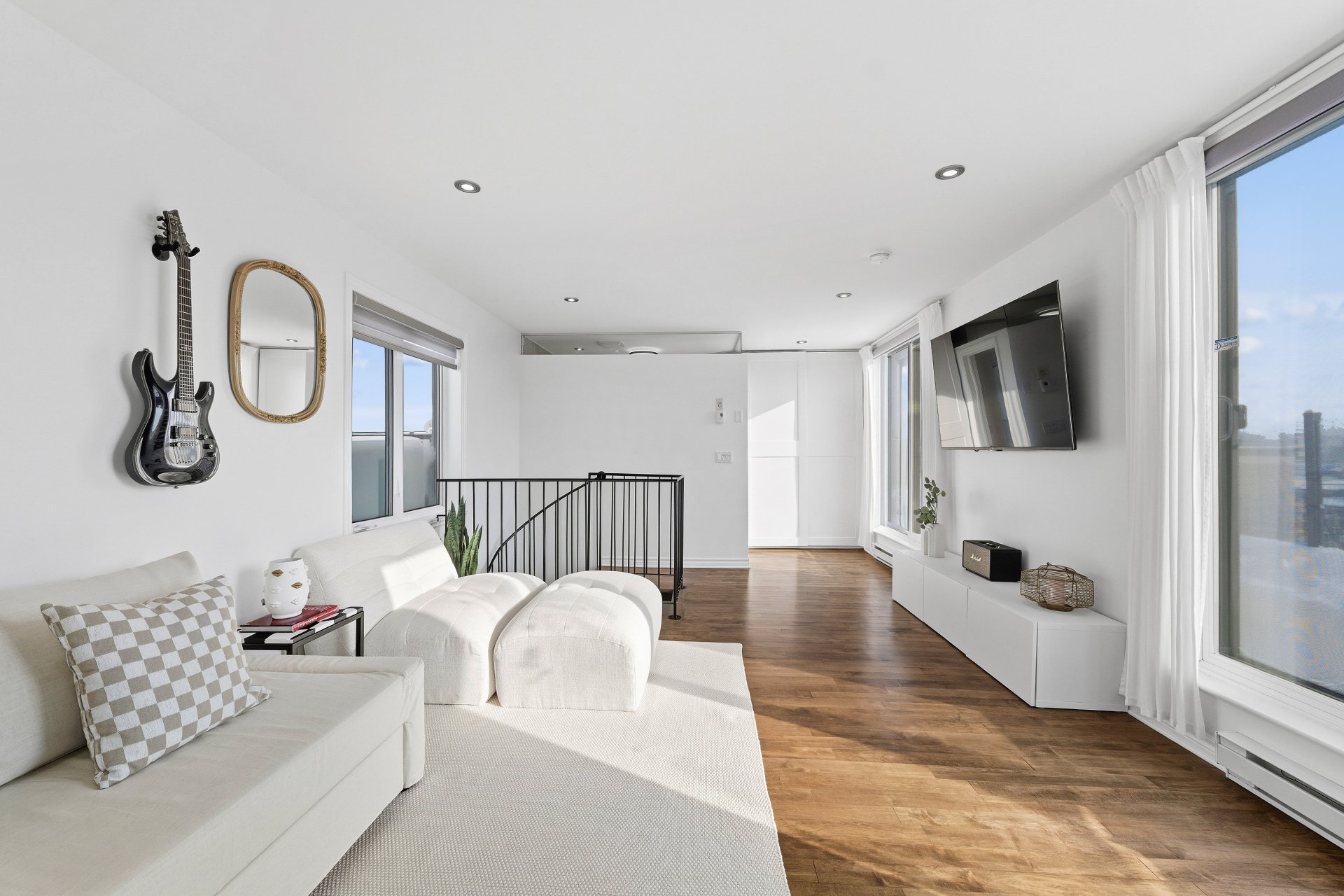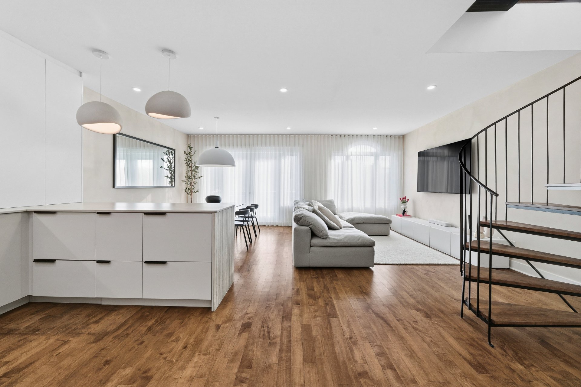 CUISINE : Réfrigérateur LG entièrement intégré, lave-vaisselle Fisher & Paykel à deux tiroirs intégrés, four GE, plaque à induction Frigidaire et micro-ondes Danby dissimulé. SALON / SALLE À MANGER : Stores filtrant la lumière, rideaux voilages sur mesure pleine hauteur, domotique Kasa compatible Alexa et Wi-Fi. CHAMBRE RDC : Rideaux et stores occultants pleine hauteur. MEZZANINE : Canapé-lit inclus.