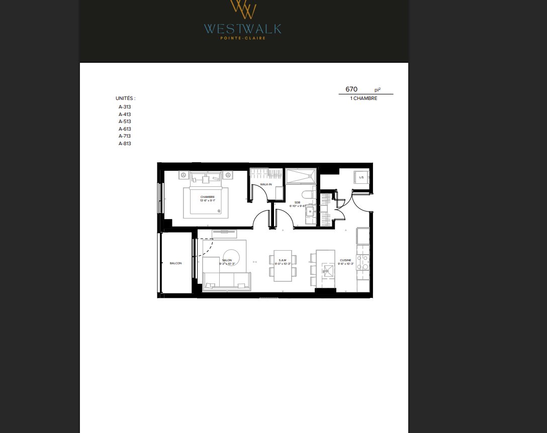 Westwalk Pointe-Claire est un projet d'appartements de luxe situé à Pointe-Claire, dans l'Ouest-de-l'Île de Montréal. Le projet propose des lofts, des appartements d'une, deux et trois chambres, en plus d'espaces communs tels qu'une salle d'entraînement, un terrain de pickleball sur le toit, une salle de golf virtuel et des espaces de coworking. Il offre également un accès pratique aux commerces et au transport en commun, dans un environnement propice à la marche. Lofts à partir de 1,500 $, 1 chambre à partir de 1,650 $, 2 chambres à partir de 2,400 $, 3 chambres à partir de 3,200 $. Plus d'information au westwalk.ca. Occpation 1 Avril 2027.
