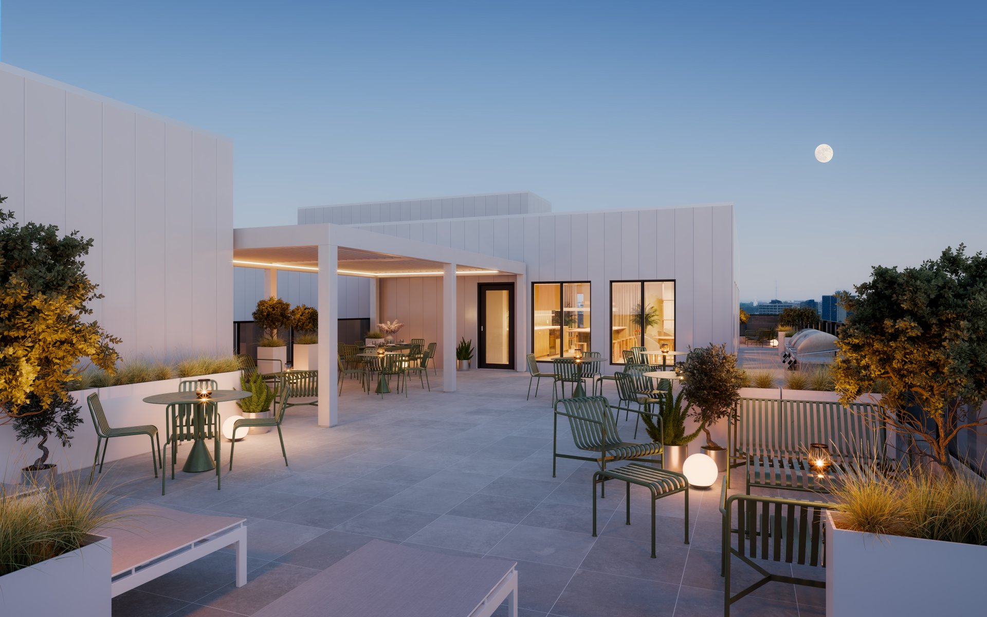 Réfrigérateur, cuisinière, micro-ondes, lave-vaisselle, laveuse, sécheuse, chauffage, eau chaude, électricité, internet, air climatisé central, tringles à rideaux, luminaires, gym, terrasse sur le toit.