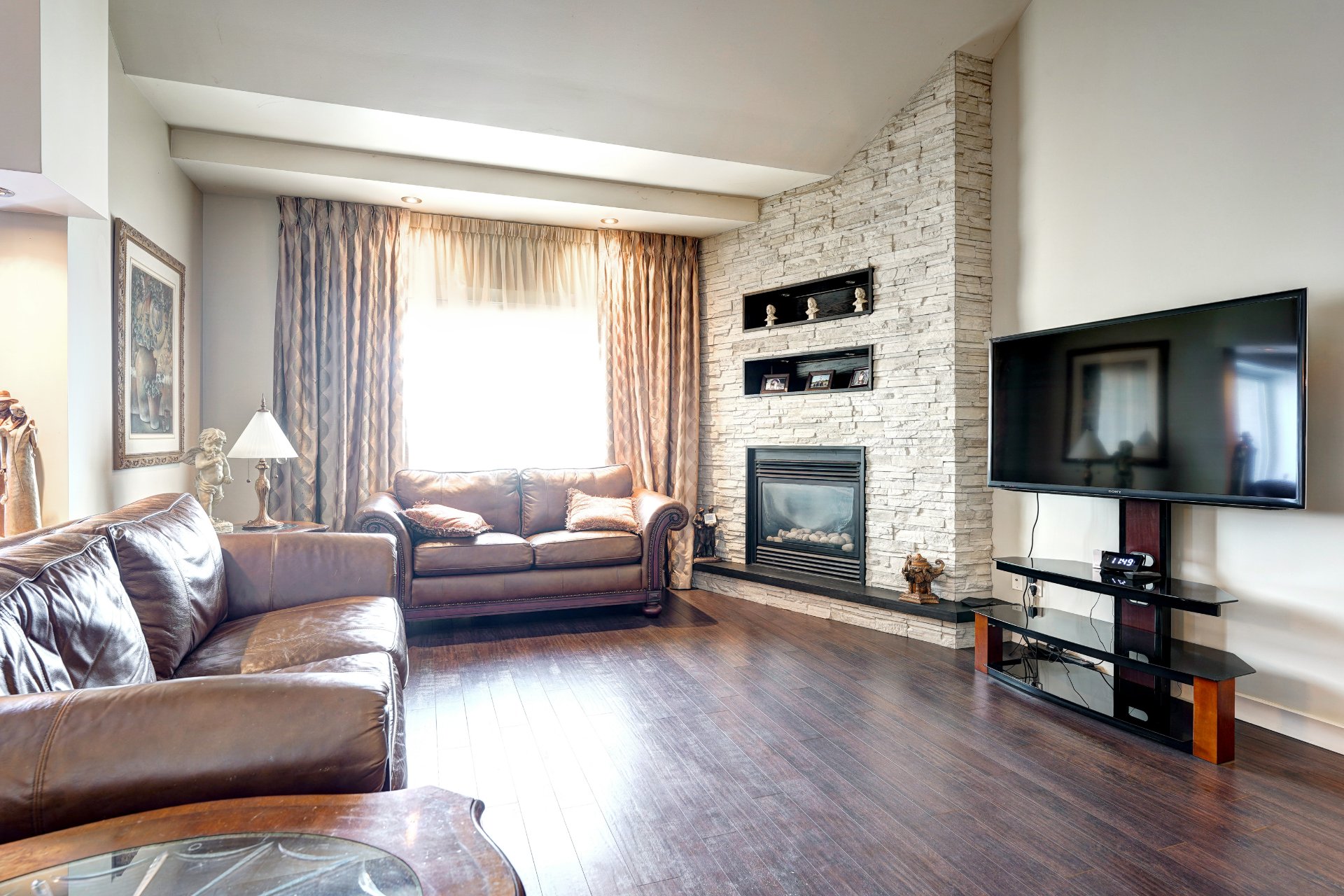 Tous les luminaires, pôles, rideaux (1 pas installé), stores, poêle, réfrigérateur (eau et glace non fonctionnel), lave-vaisselle non branché, meuble TV et téléviseur, 2 tabourets de comptoir, BBQ au gaz naturel, set de patio