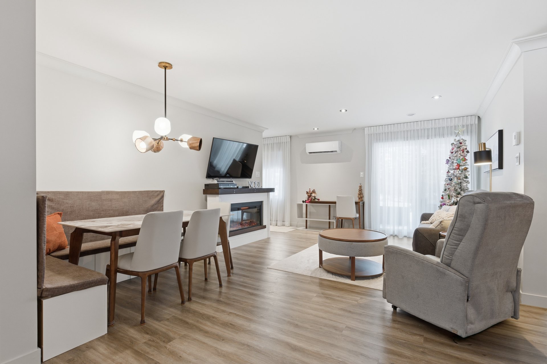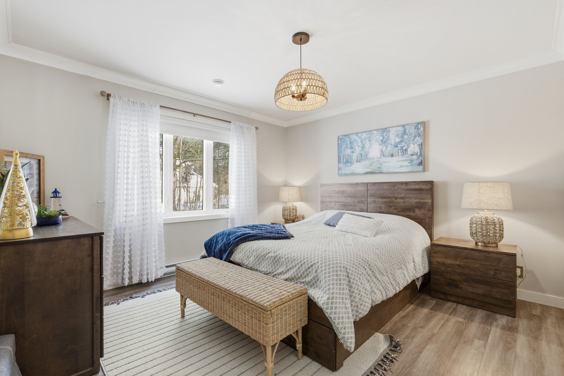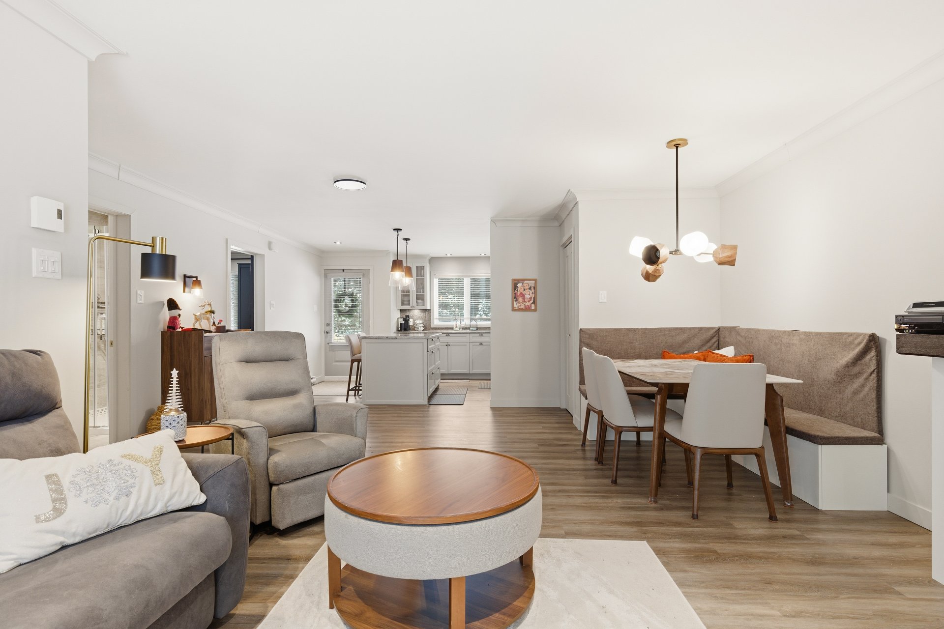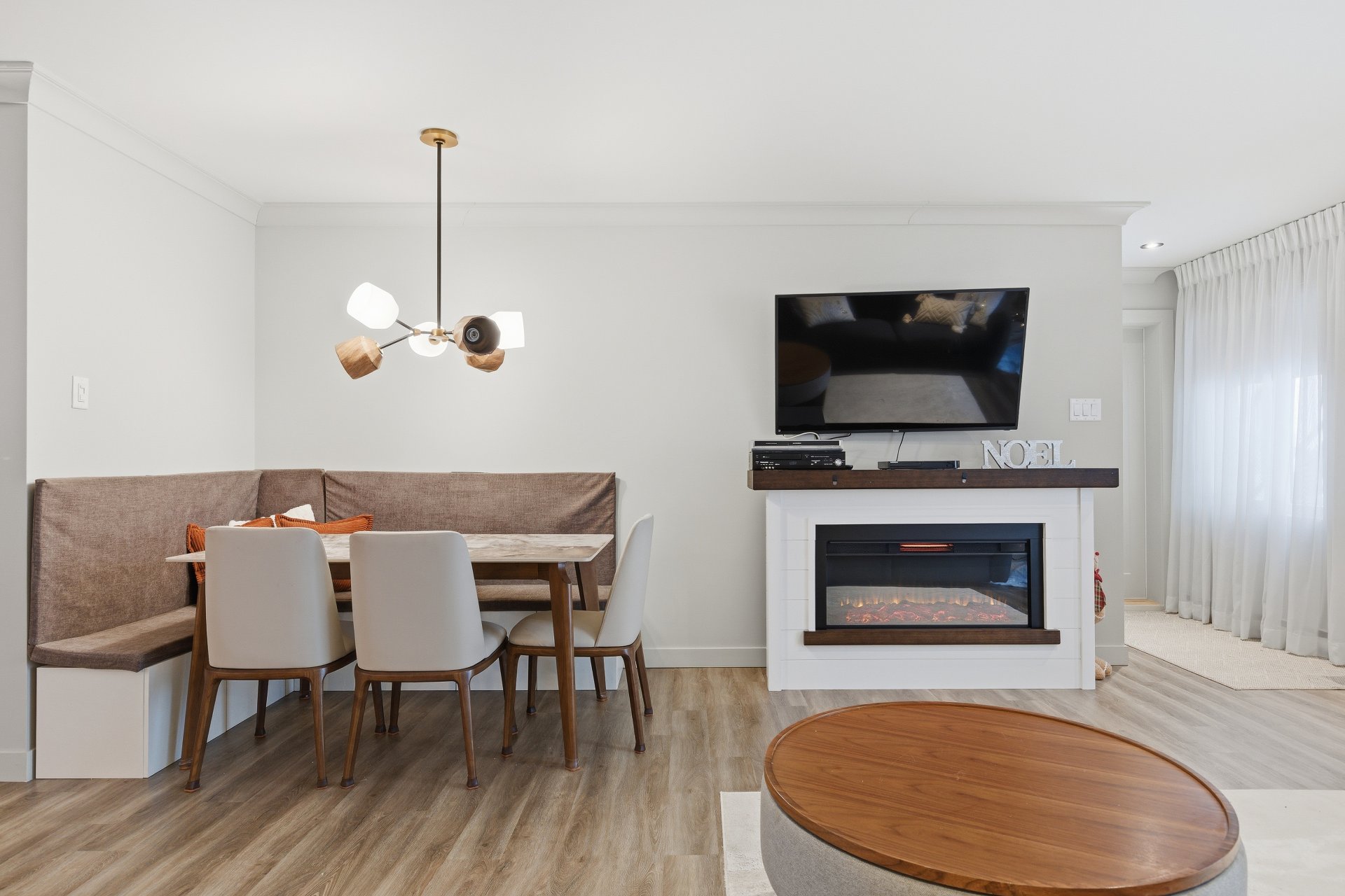 Luminaires de la salle à manger, rideaux de la chambre principale.