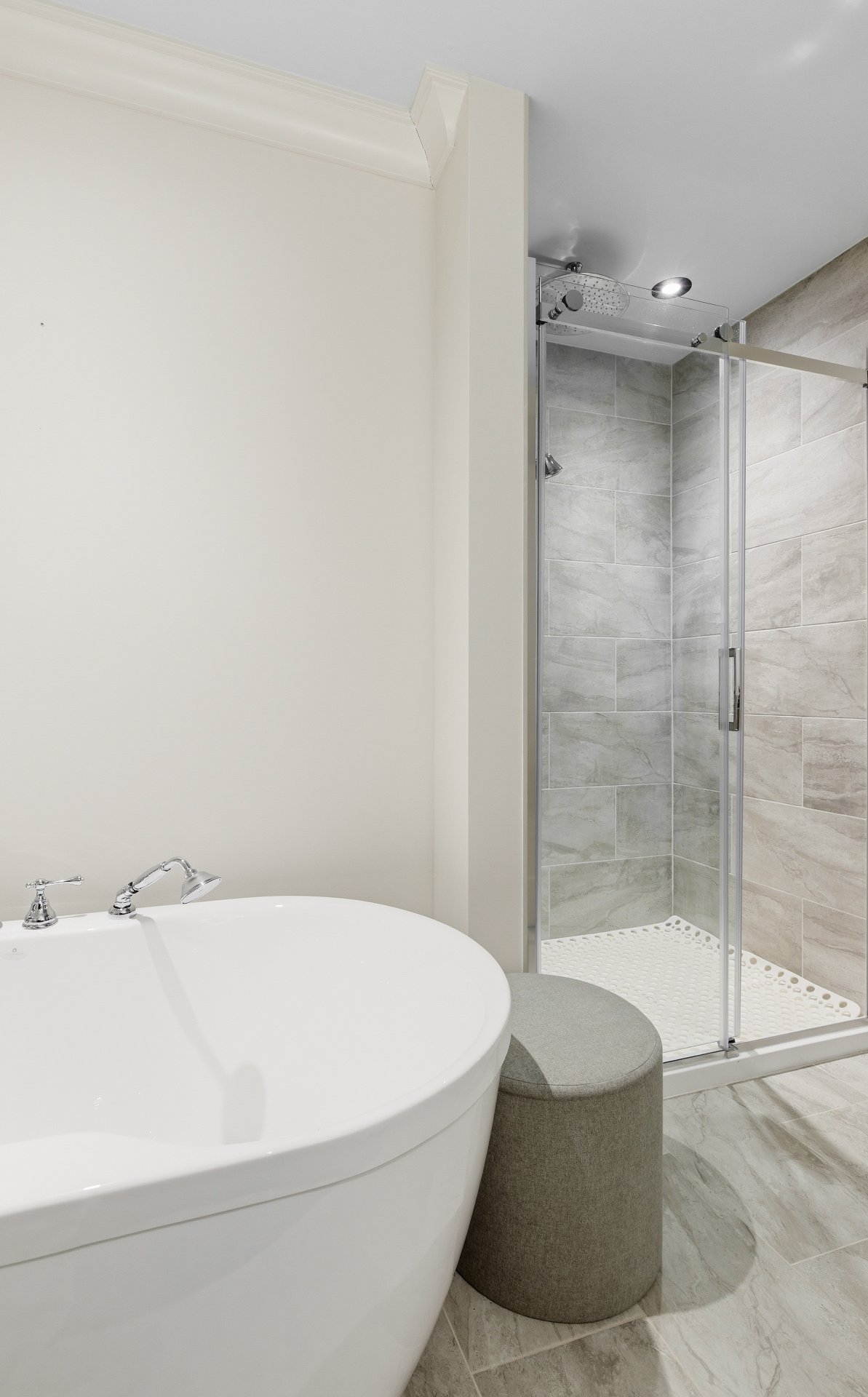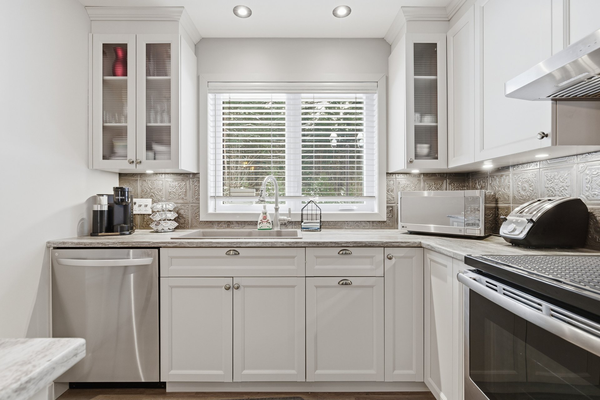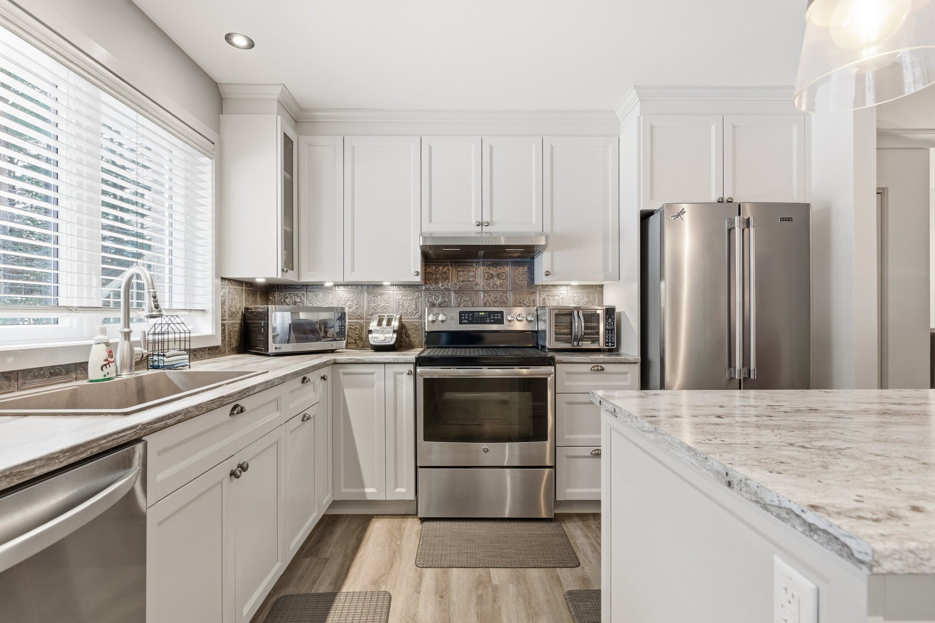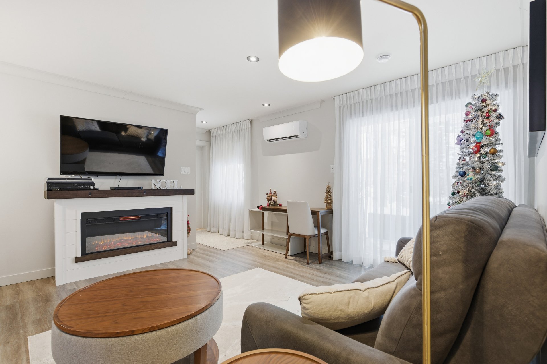 Luminaires de la salle à manger, rideaux de la chambre principale.