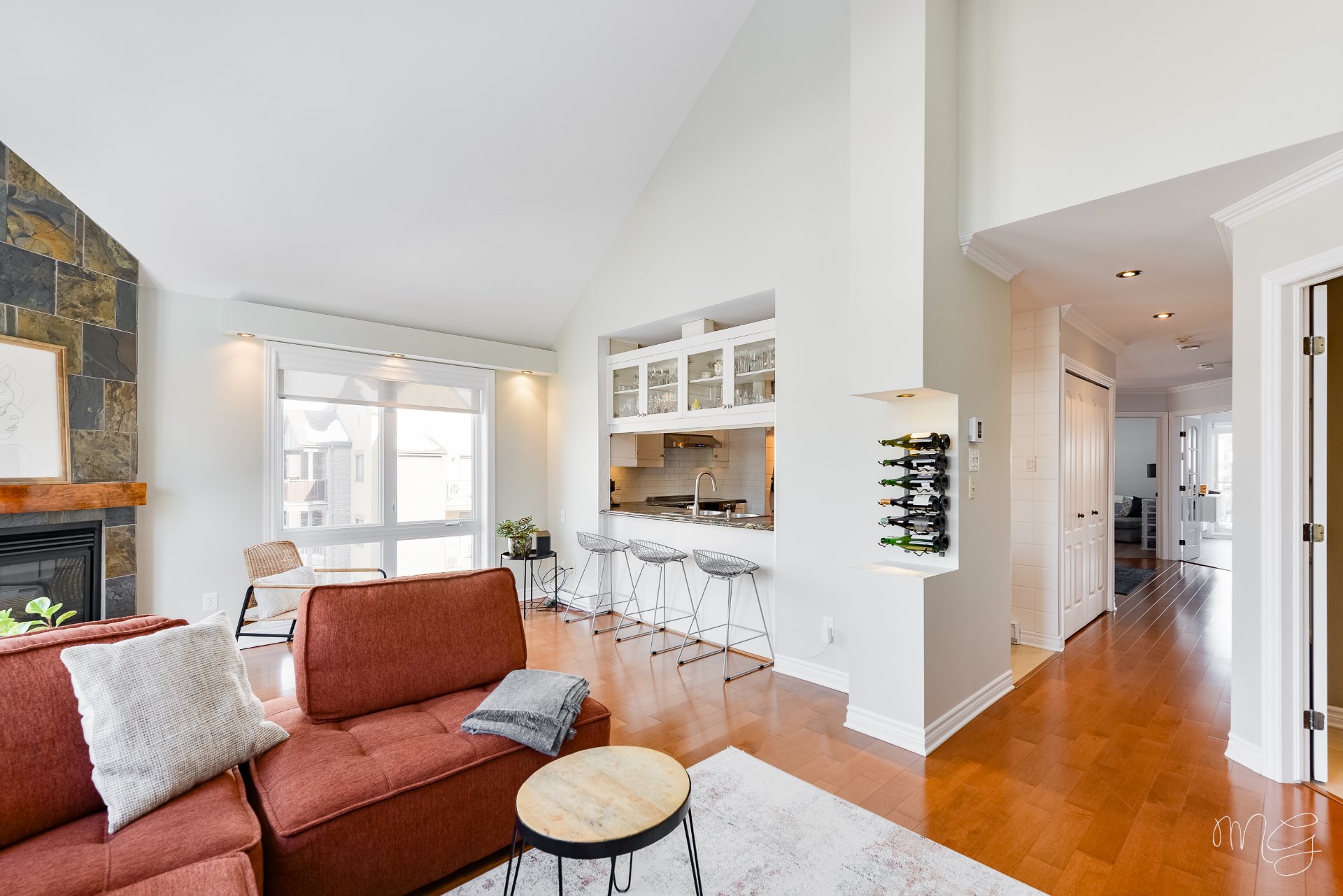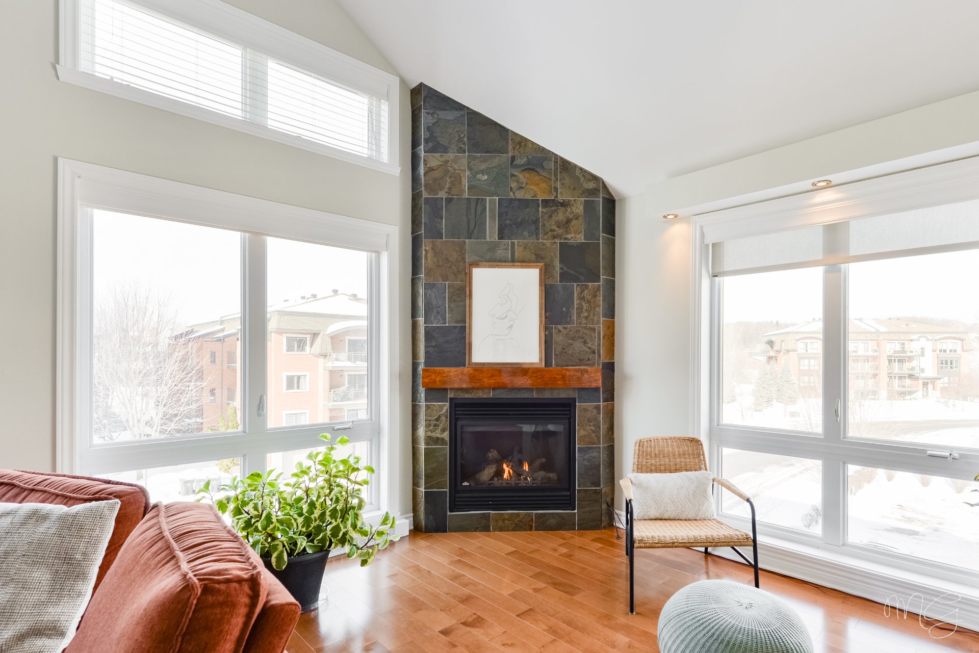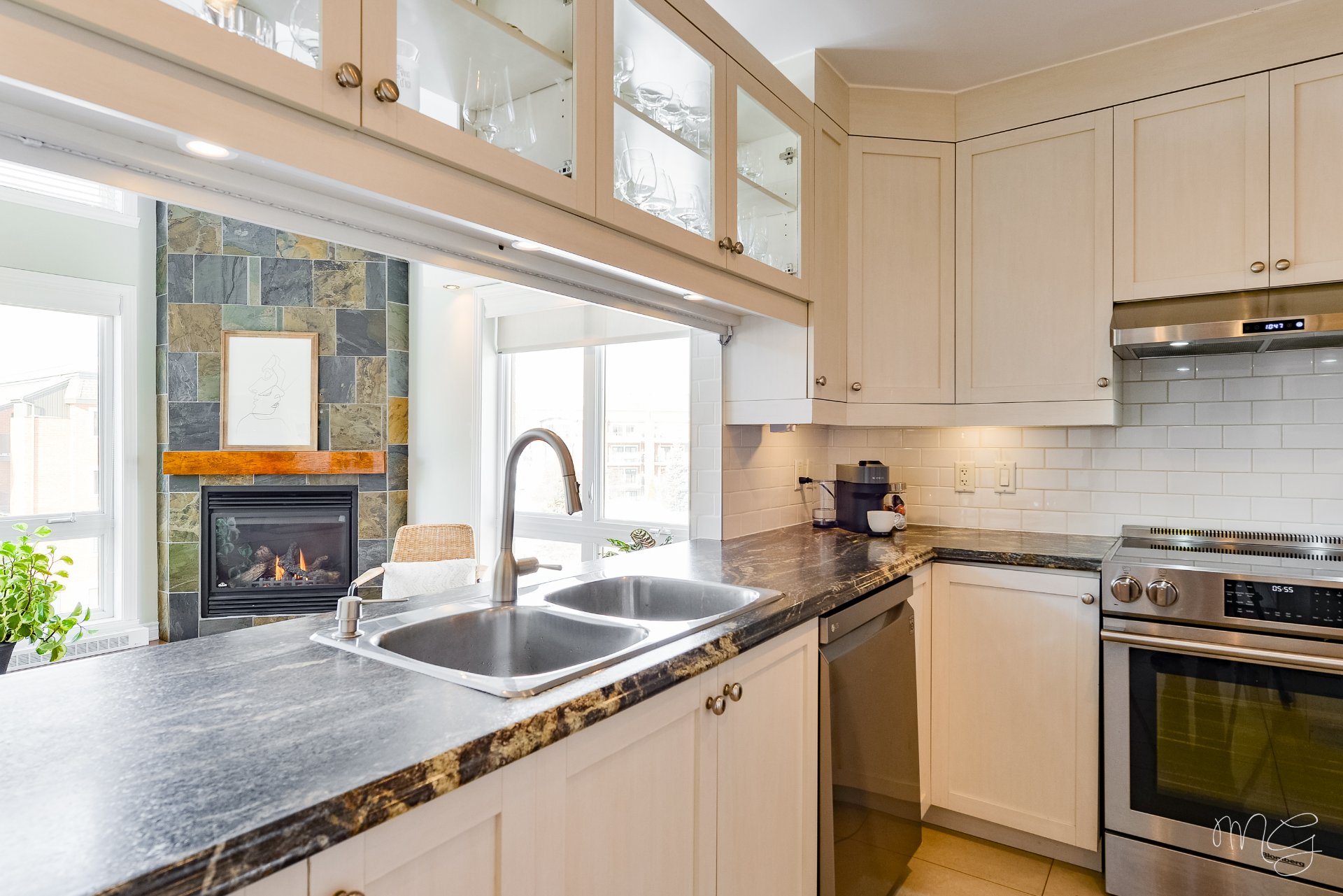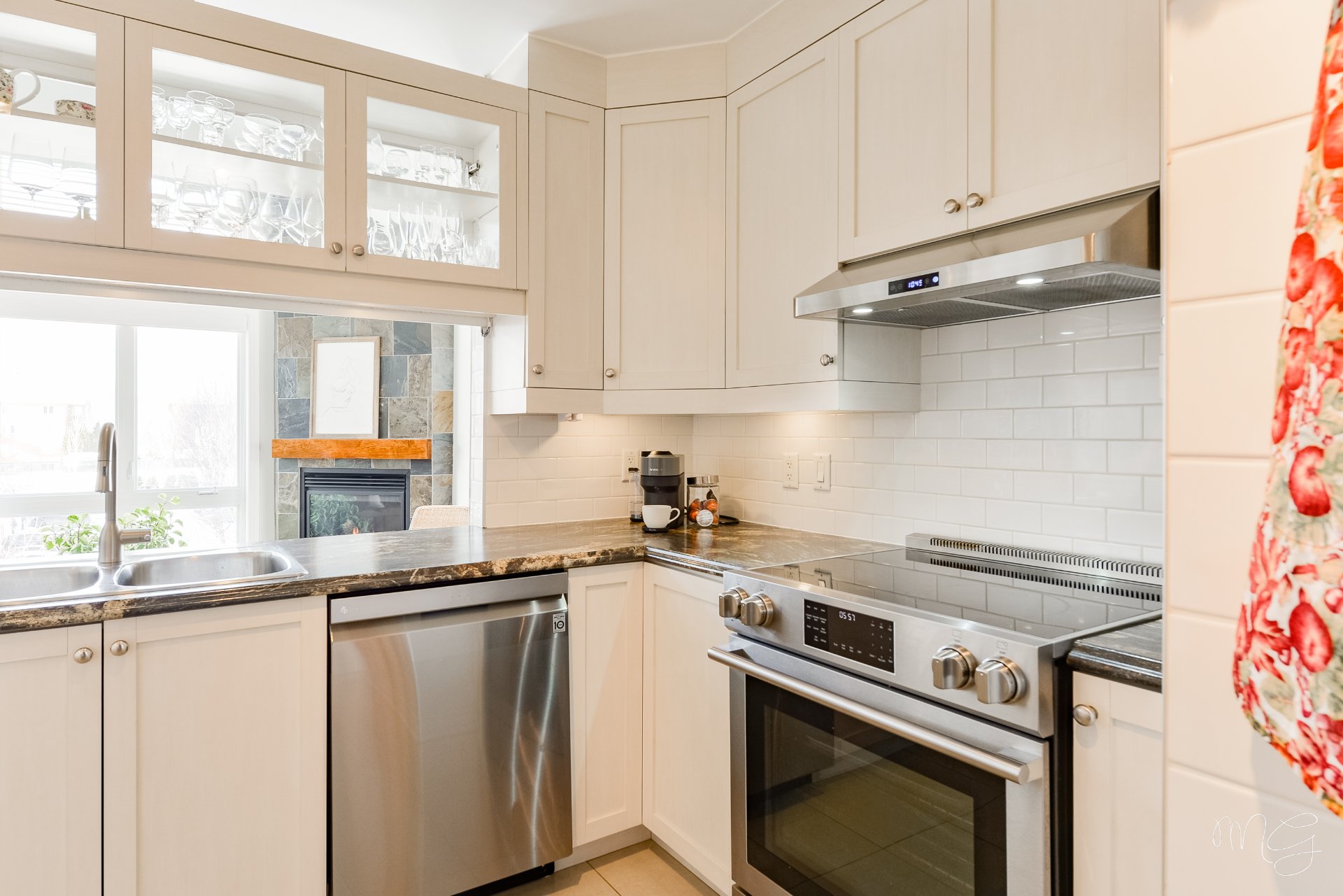 Superbe unité de 2 chambres à coucher très bien entretenue au fil des années. Ayant bénéficié de plusieurs améliorations dans les dernières années, le condo offre un foyer au gaz naturel, des planchers de lattes d'ingénierie ainsi qu'une cuisine fonctionnelle avec dosseret en céramique & armoires pleine hauteur. Aire de vie agréable au quotidien avec plafond cathédral donnant beaucoup de volume. Grand balcon avec rangement extérieur plus un 2e balcon! Accès rapide aux axes routiers, à distance de marche des écoles et près d'absolument tous les services et commerces. 1 garage + 1 stationnement extérieur. Faut voir!