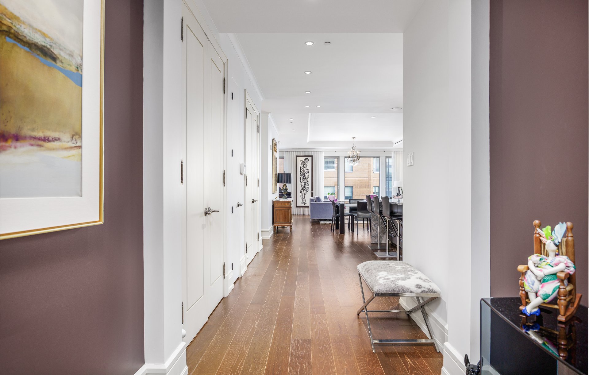 Meubles, art, effets personnels, lustres dans le salon, la chambre principale, le couloir.