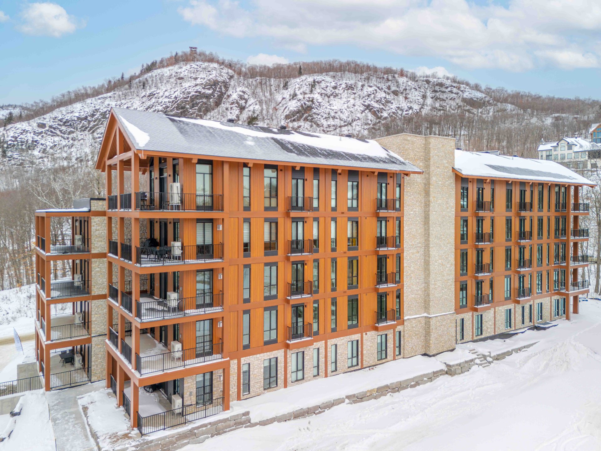 DELIVERY IN APRIL 2026! Located in the heart of the prestigious Versant Soleil sector, this luxury unit in the Ostrya Tremblant project will offer an unparalleled experience thanks to its ski-in/ski-out location. This new condo will combine high-end finishes, modern design, and exceptional brightness. Large windows, a private balcony, a gas fireplace, and refined materials will create an elegant space ideal for the ski season. You will experience the perfect balance between luxury and nature in Tremblant. Short-term rentals permitted, limited units available!