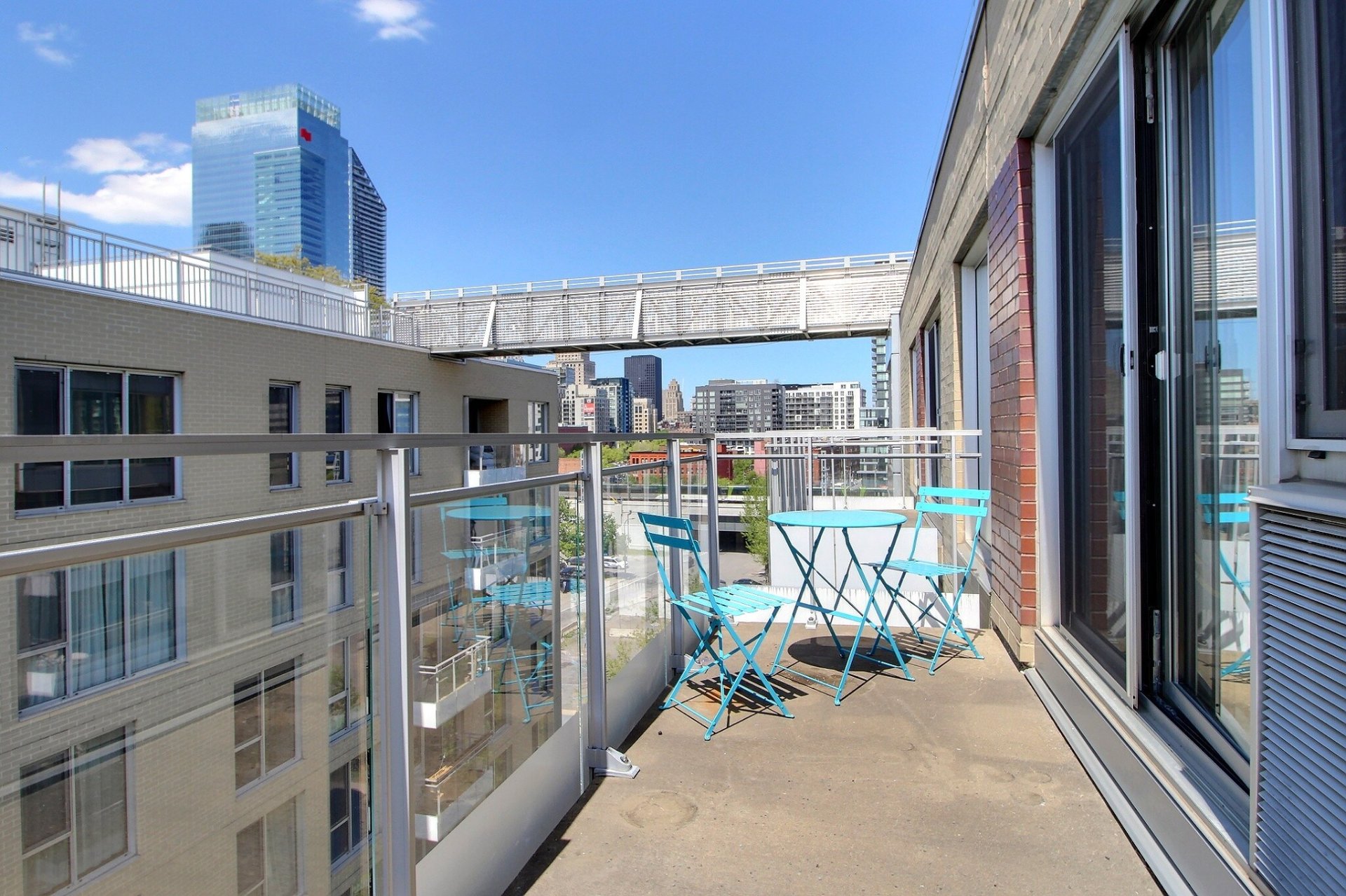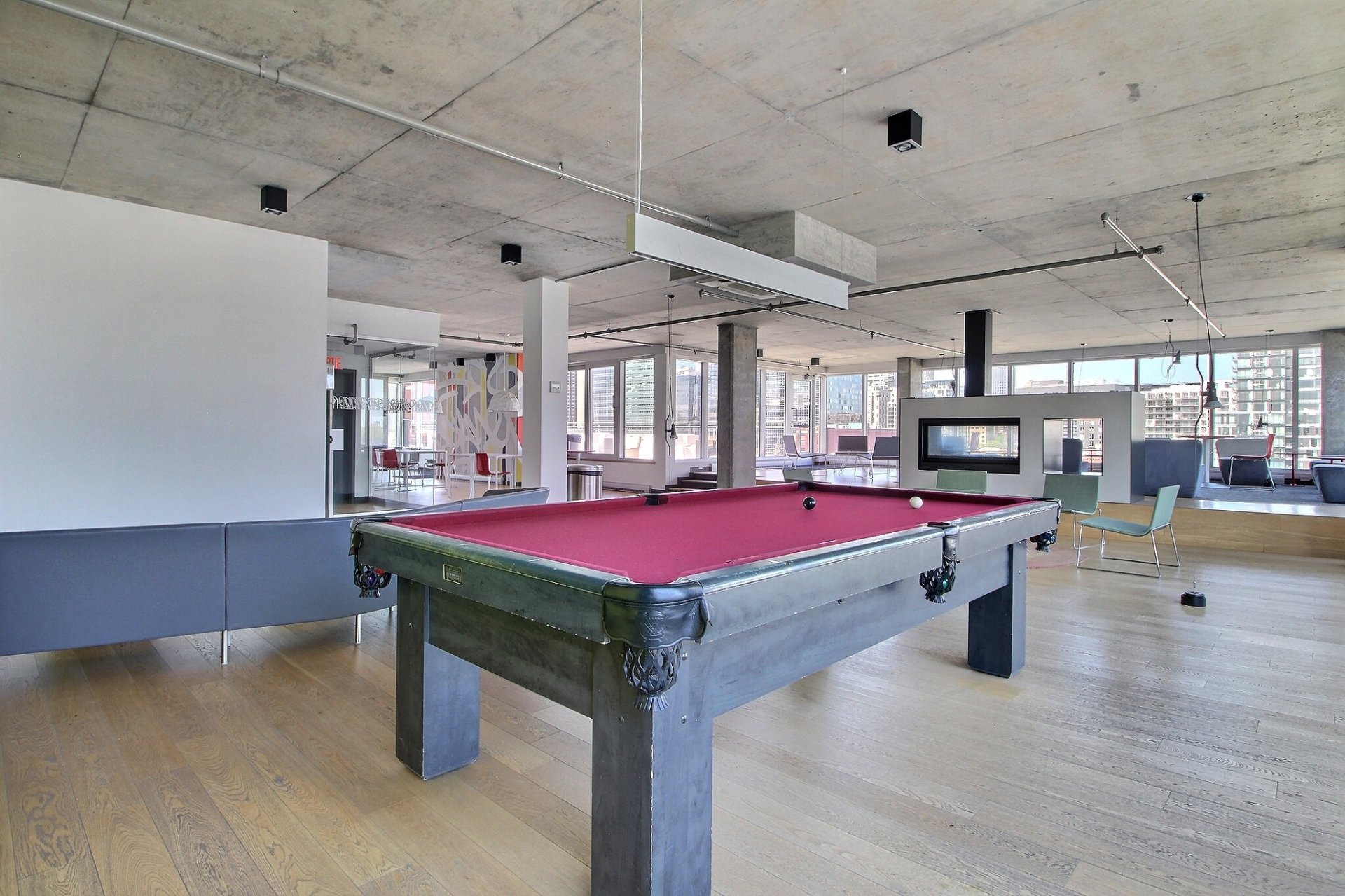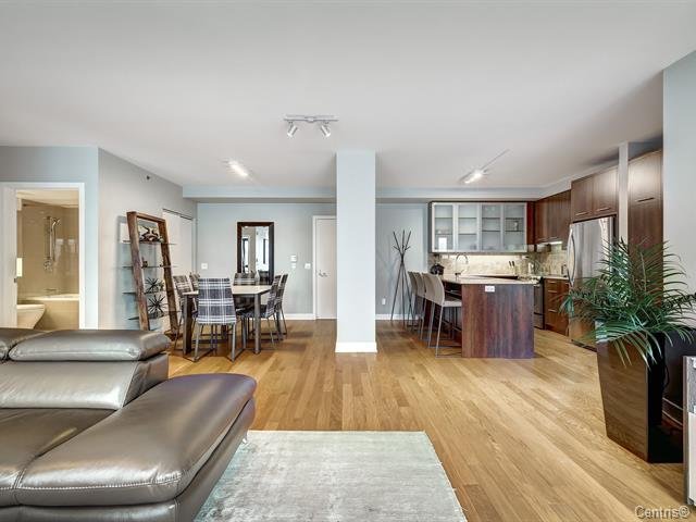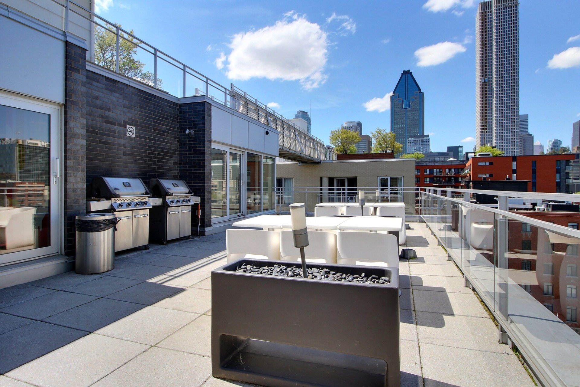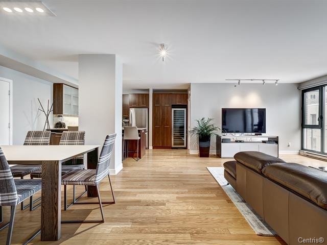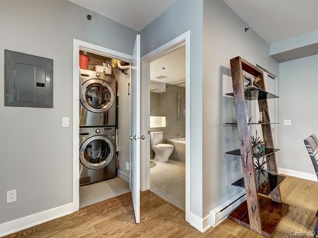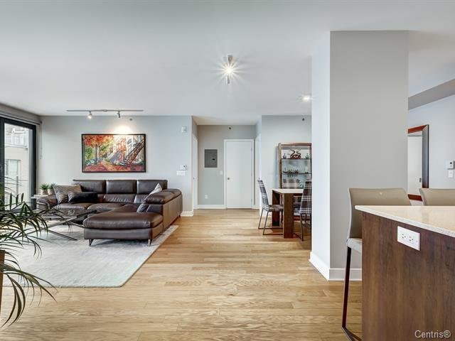 Steps from the Lachine Canal, bike paths, public transit, cafés, and downtown. An opportunity to live in one of Montreal's most sought-after waterfront communities. Key Features: South-facing unit with open-concept layout, private balcony with clear views of the Lachine Canal, contemporary kitchen with induction cooktop, built-in microwave, refrigerator, and modern hood. Two spacious bedrooms, ideal for rest or home office. Elegant bathroom and discreet laundry area with stacked washer/dryer. Indoor parking + storage locker included Very nice building amenities such as a 6,000 sq. ft. fitness center, 22nd-floor rooftop terrace and pool.