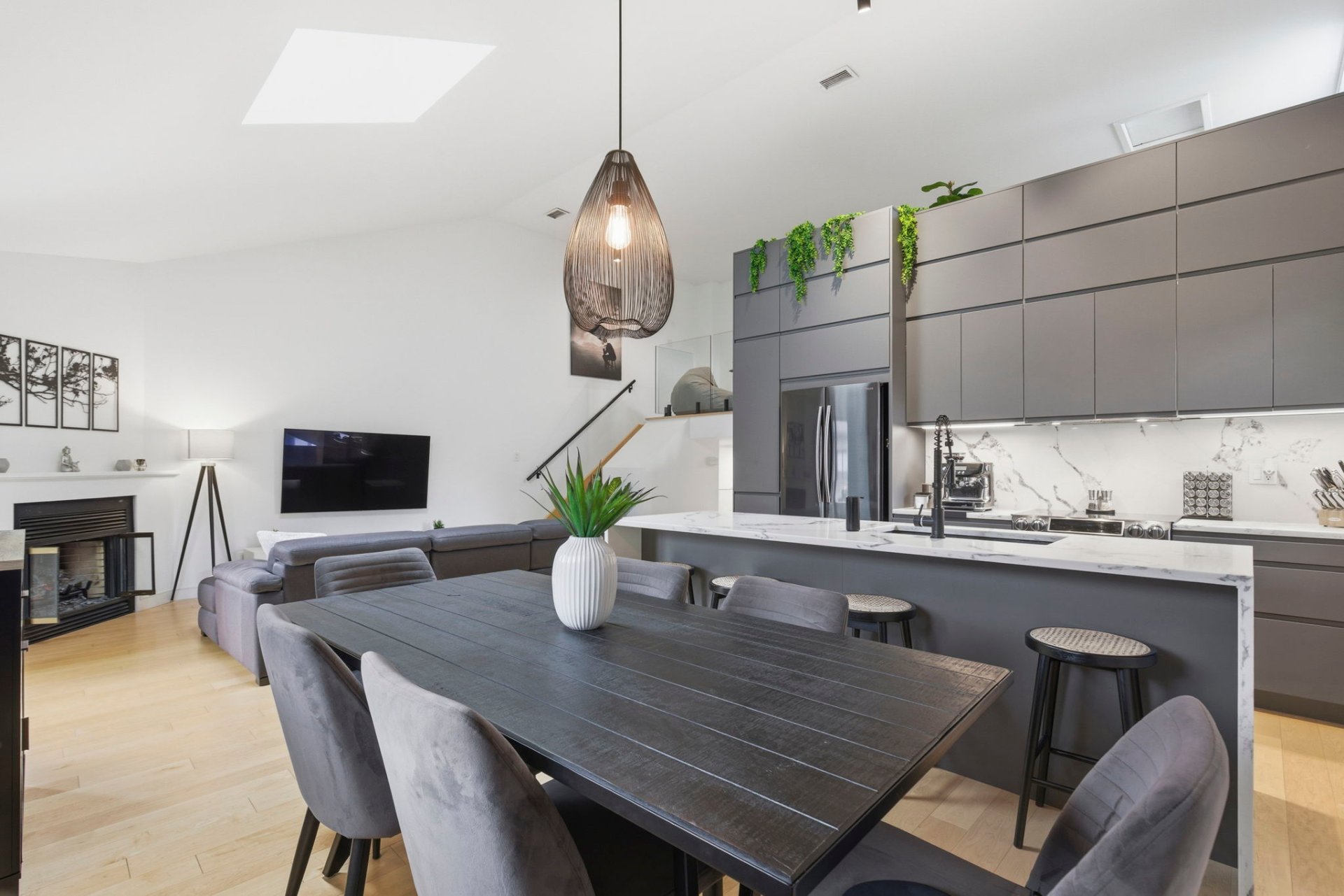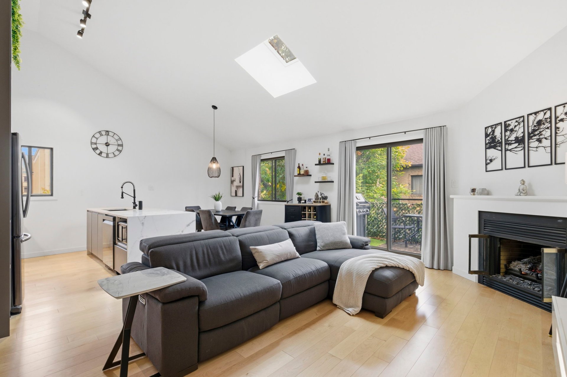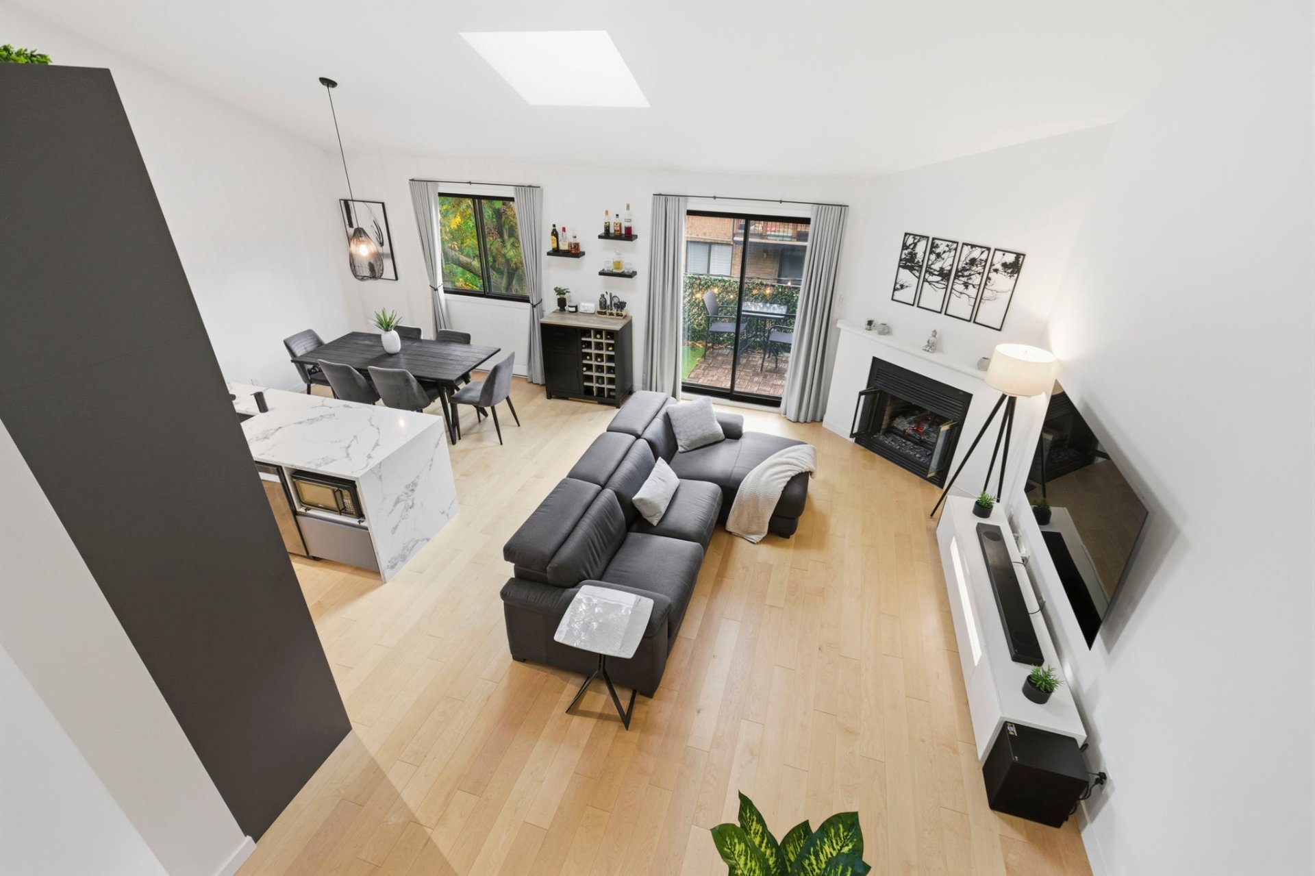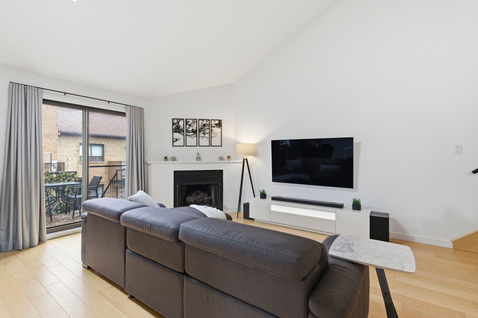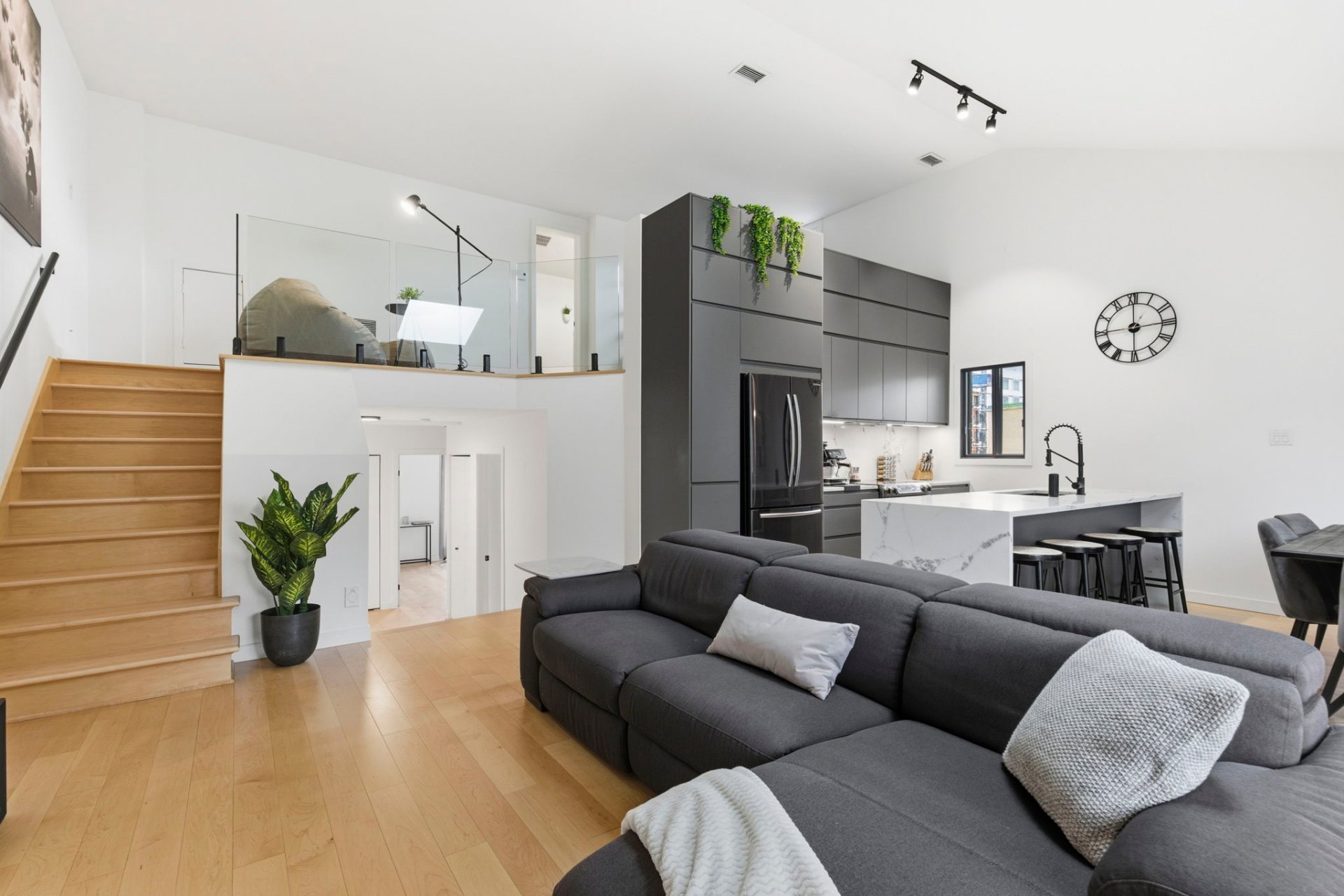 Contemporary-style 1,350 sq. ft. condo with garage in the Cité-Jardin area of Rosemont, near the Assomption metro station. The living room, the centerpiece of the house, captivates with its warm ambiance and impressive volume thanks to the cathedral ceiling. The fully renovated kitchen blends harmoniously into the living area. The view of the living room from the mezzanine adds an exceptional touch to the apartment. Two bathrooms, one of which was renovated in 2020, maintain the same modern style of the property. Two closed bedrooms. One terrace and one balcony. Central heat pump installed in 2023.