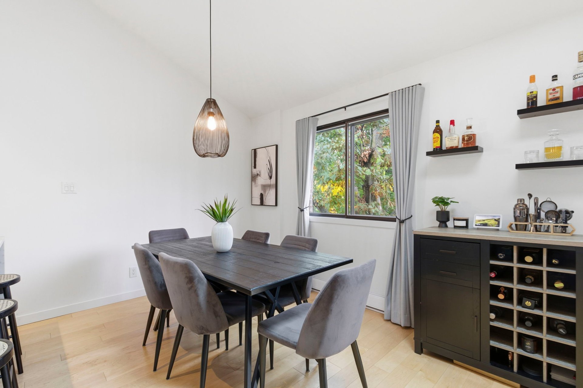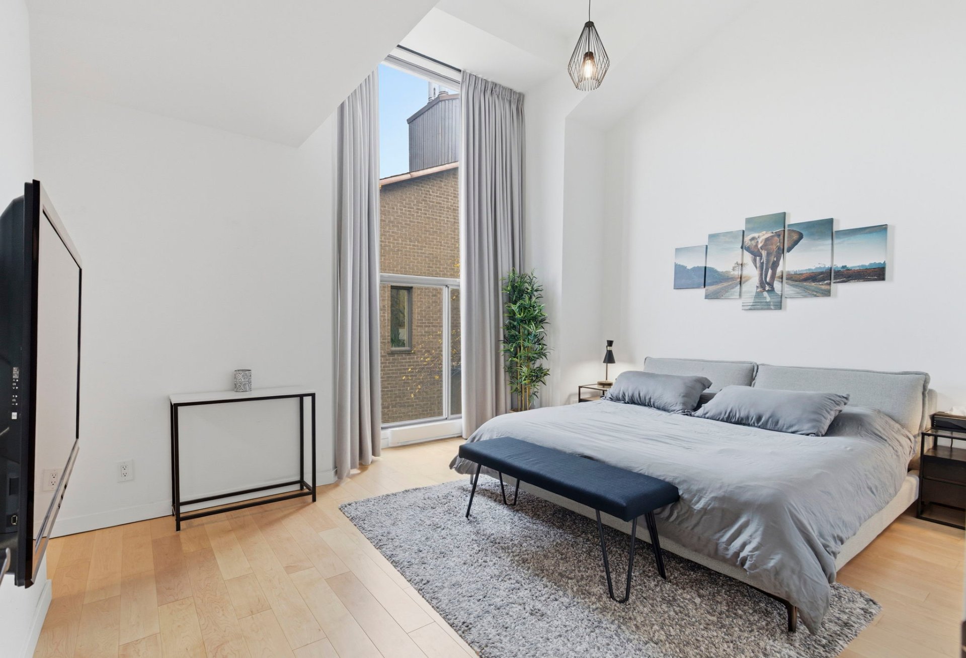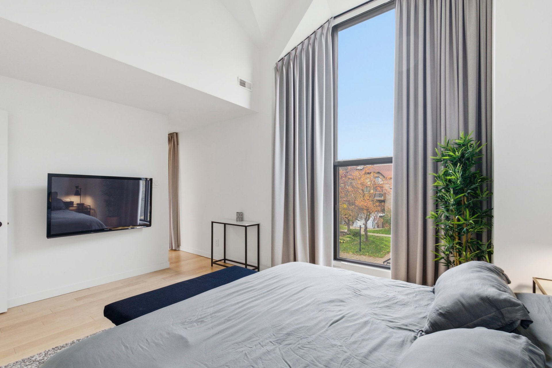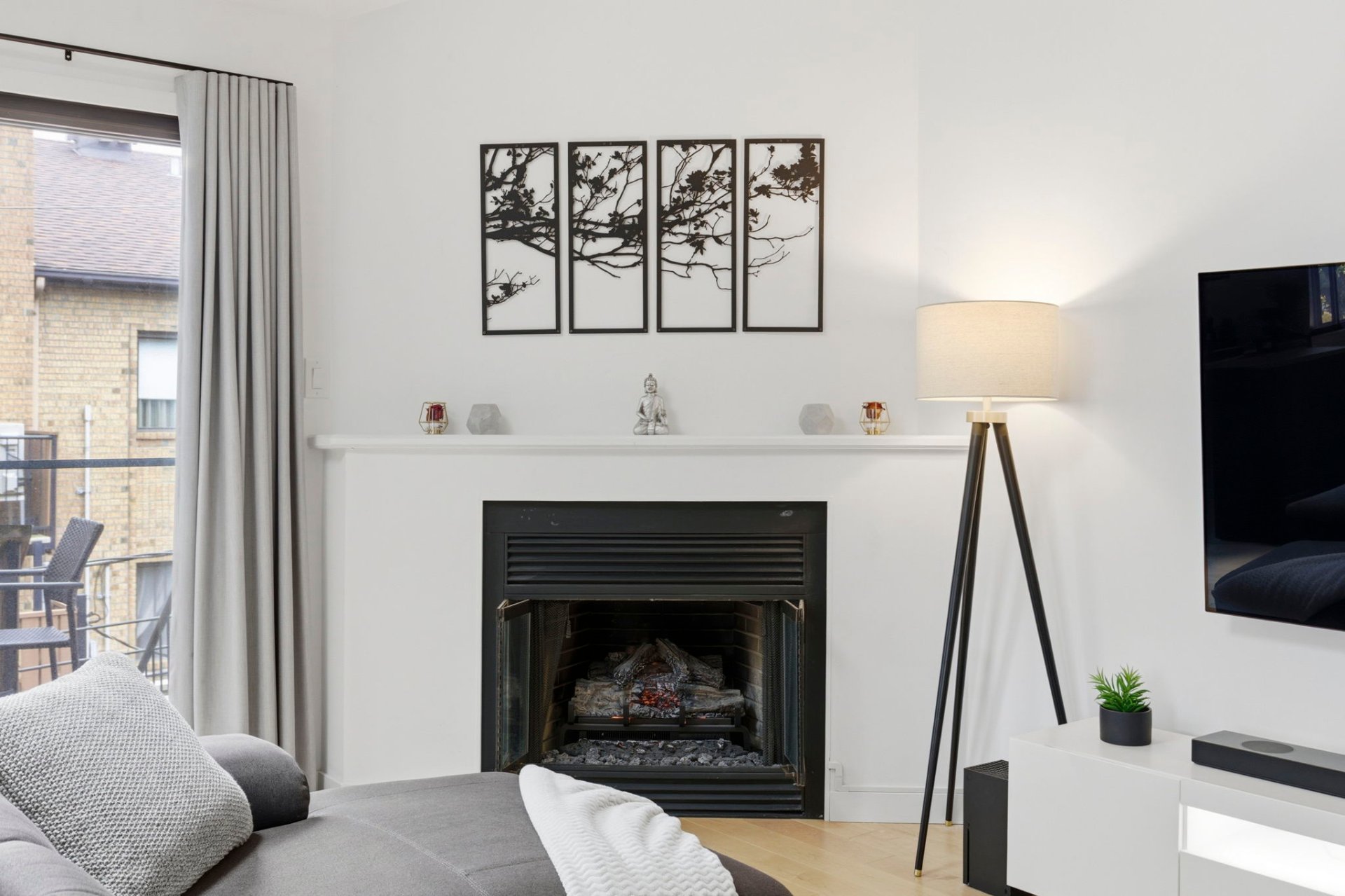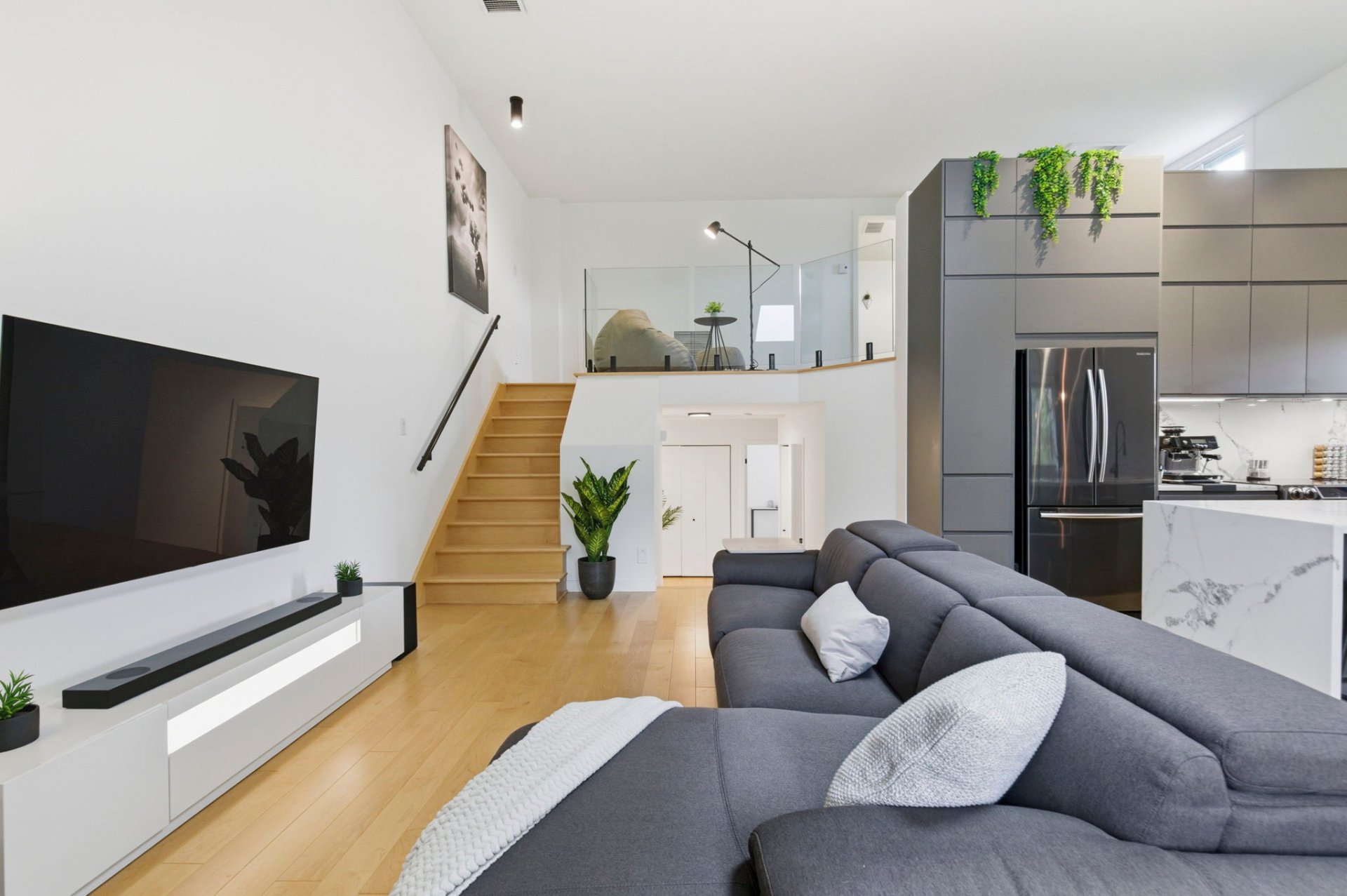 Contemporary-style 1,350 sq. ft. condo with garage in the Cité-Jardin area of Rosemont, near the Assomption metro station. The living room, the centerpiece of the house, captivates with its warm ambiance and impressive volume thanks to the cathedral ceiling. The fully renovated kitchen blends harmoniously into the living area. The view of the living room from the mezzanine adds an exceptional touch to the apartment. Two bathrooms, one of which was renovated in 2020, maintain the same modern style of the property. Two closed bedrooms. One terrace and one balcony. Central heat pump installed in 2023.