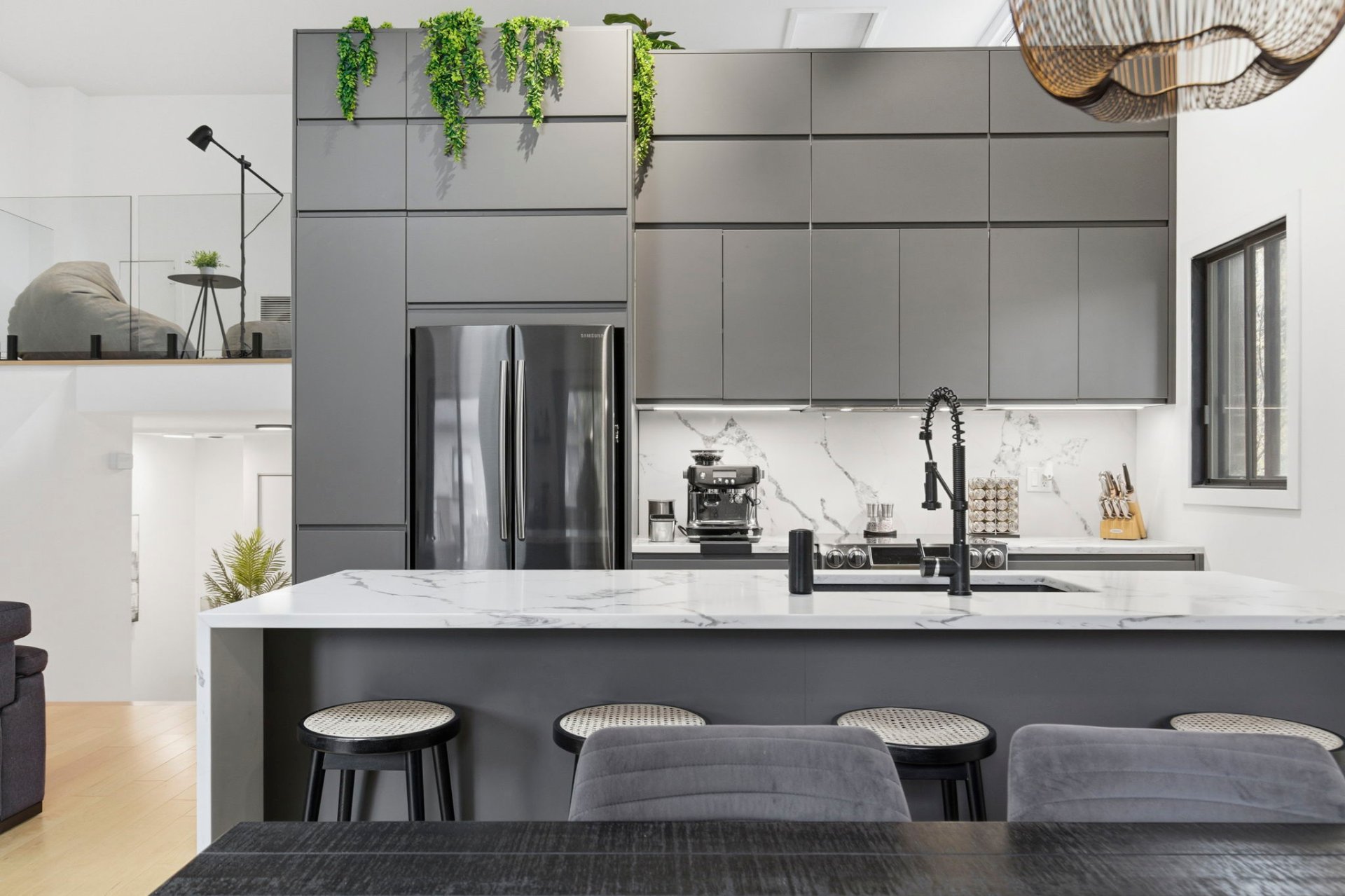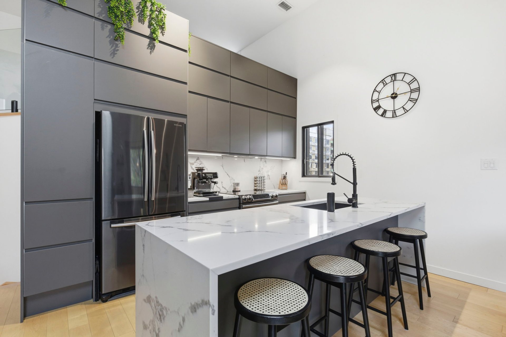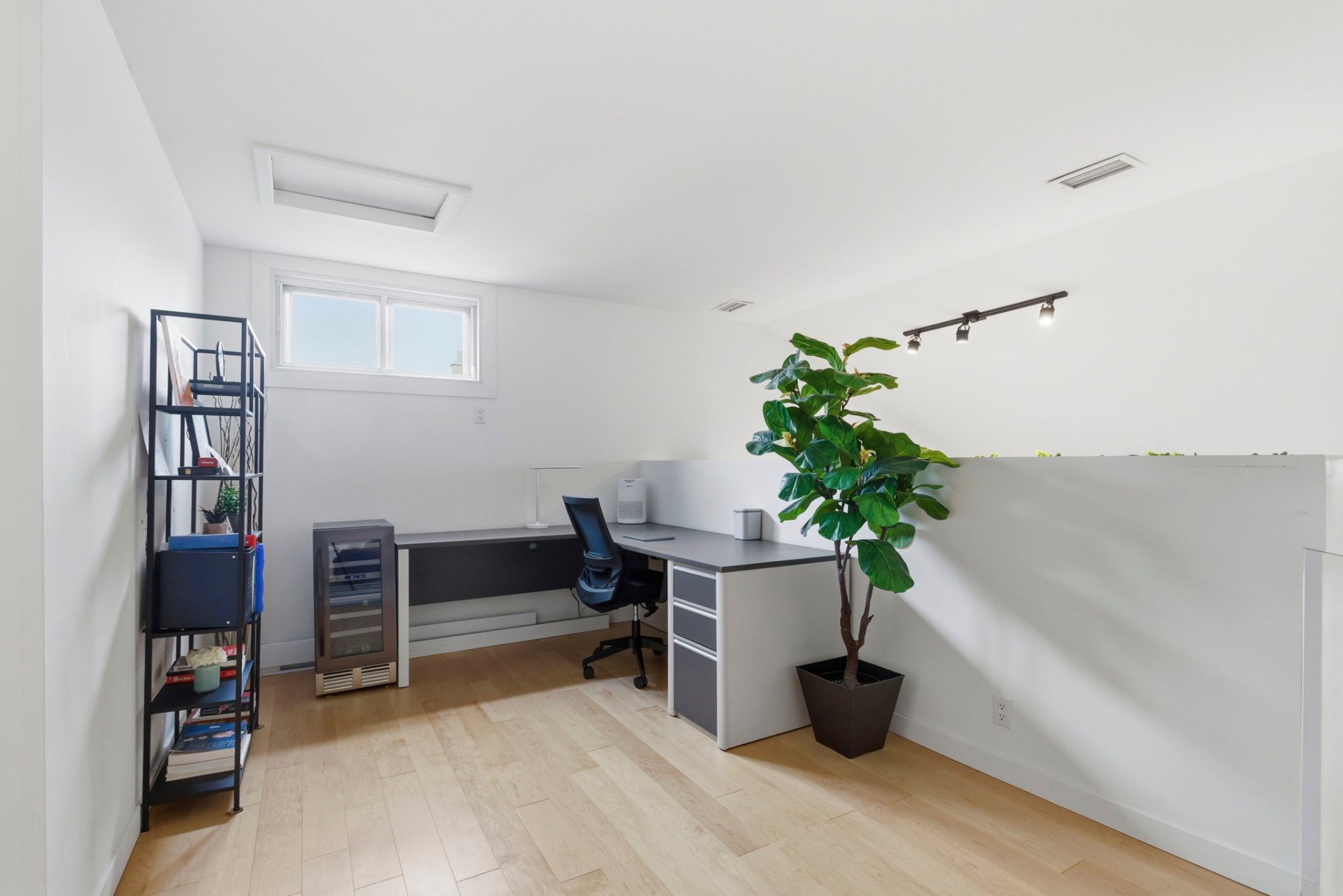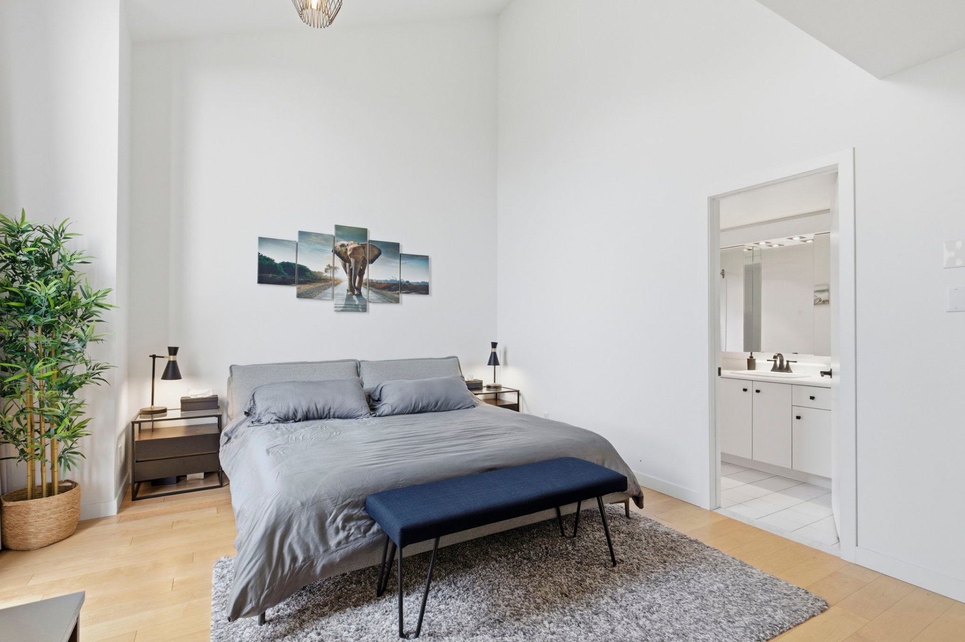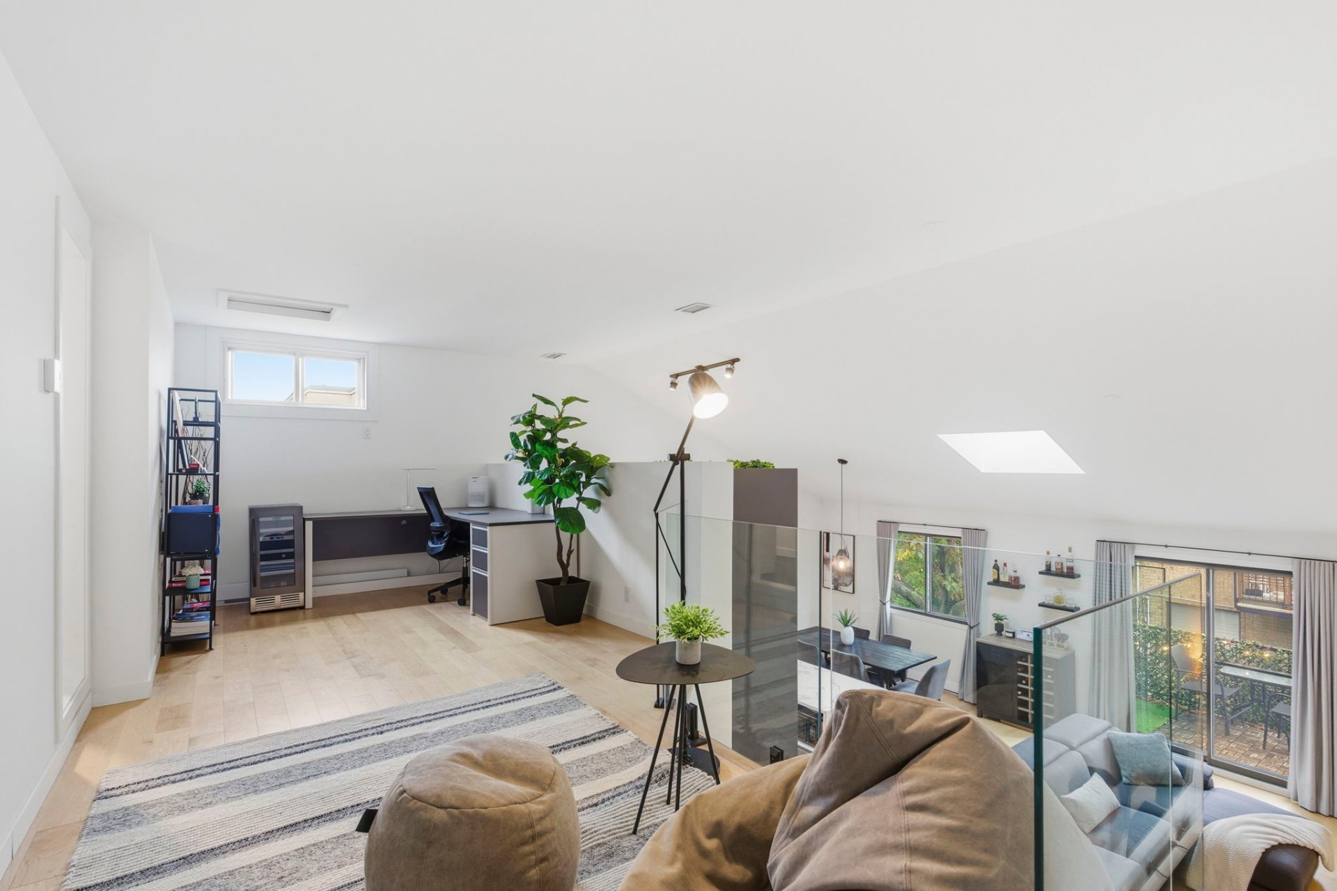 Contemporary-style 1,350 sq. ft. condo with garage in the Cité-Jardin area of Rosemont, near the Assomption metro station. The living room, the centerpiece of the house, captivates with its warm ambiance and impressive volume thanks to the cathedral ceiling. The fully renovated kitchen blends harmoniously into the living area. The view of the living room from the mezzanine adds an exceptional touch to the apartment. Two bathrooms, one of which was renovated in 2020, maintain the same modern style of the property. Two closed bedrooms. One terrace and one balcony. Central heat pump installed in 2023.
