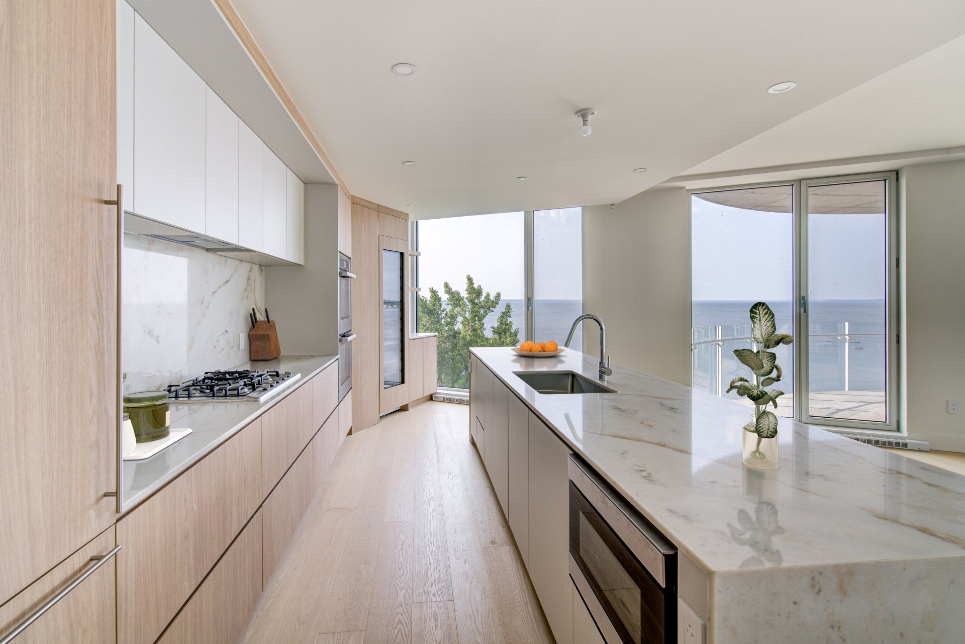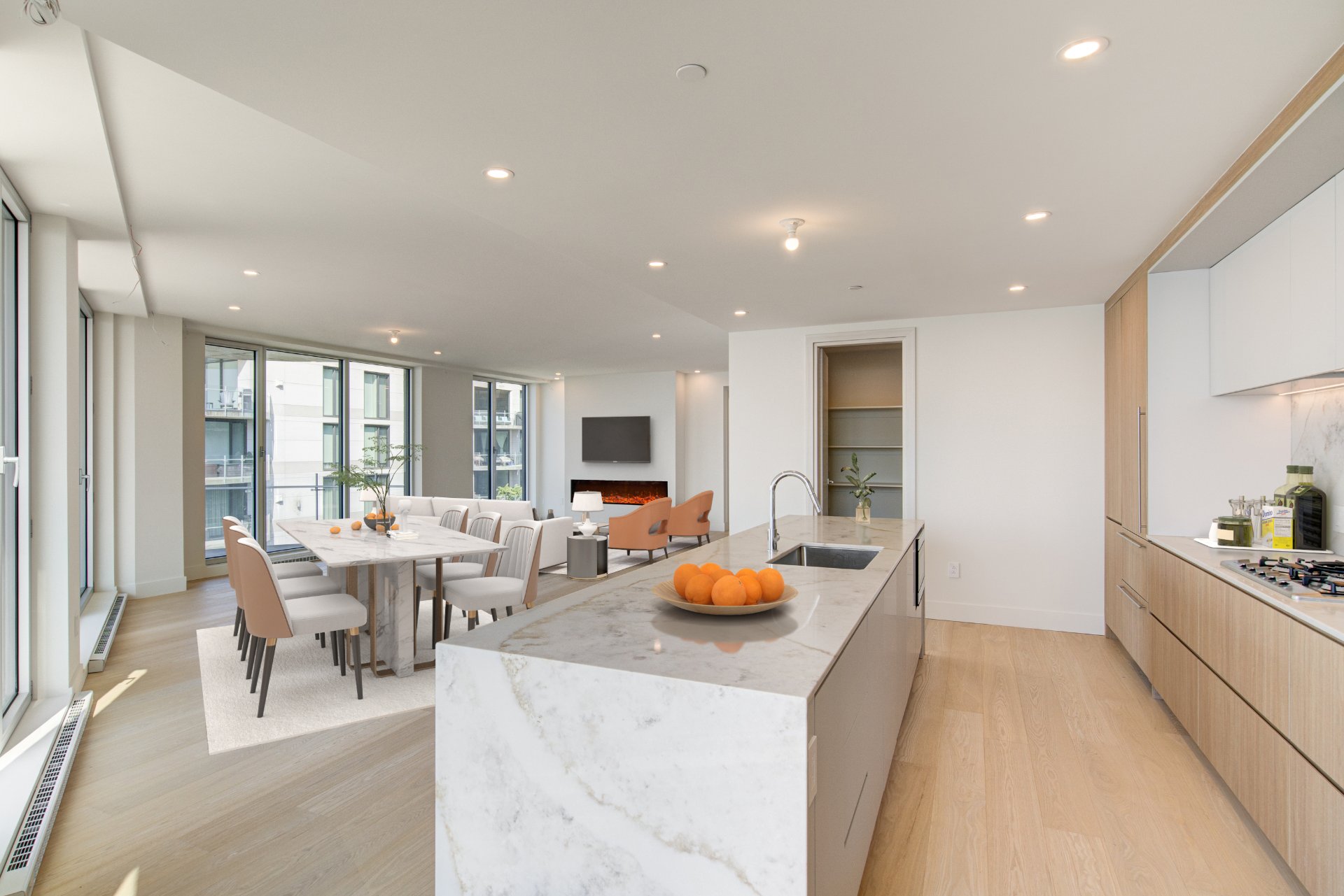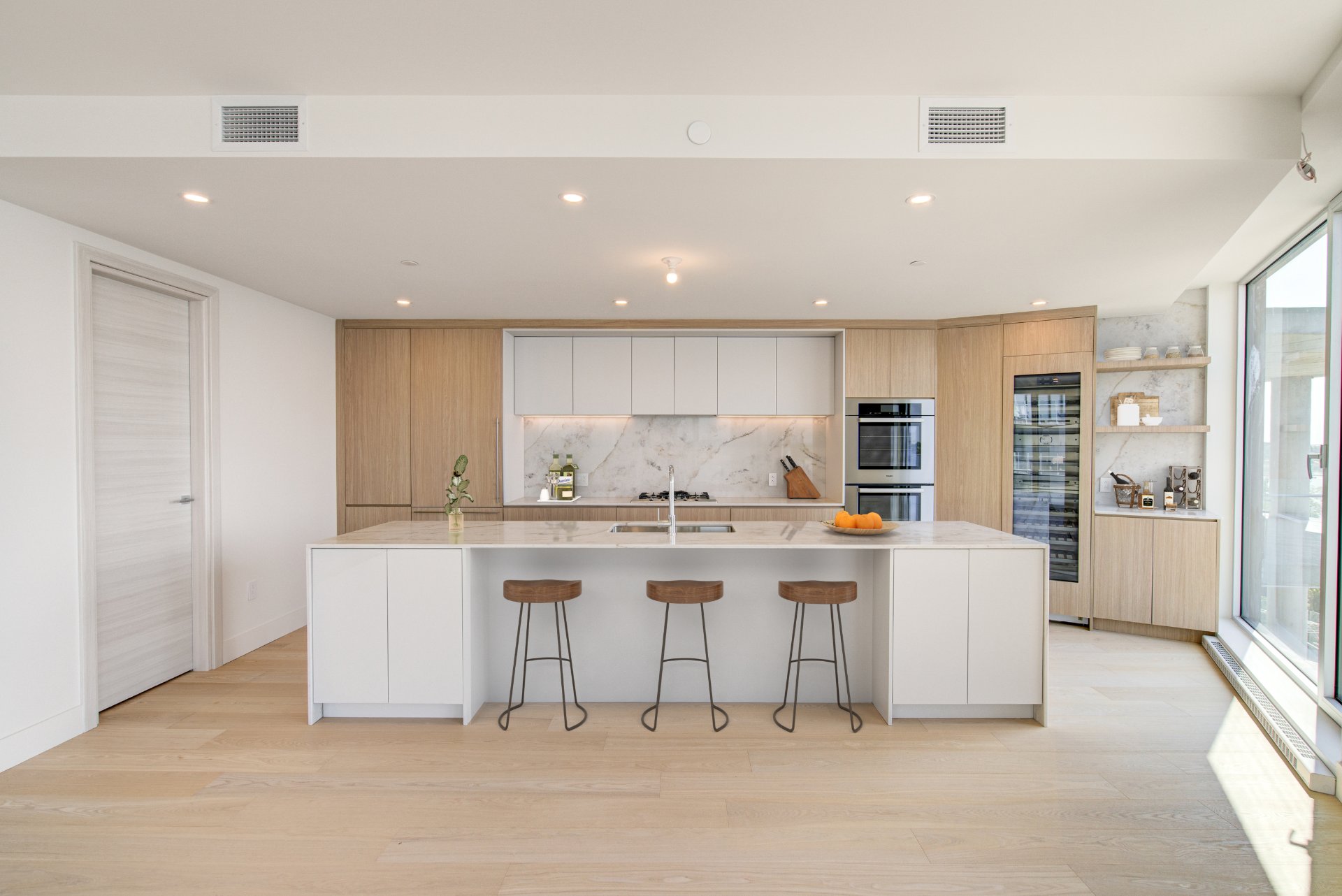 Miele double ovens, Miele gas cooktop with five burners (including a wok burner), Miele refrigerator, Miele dishwasher, 70-bottle wine cellar, electric fireplace, Sharp microwave drawer, two indoor parking spaces, a...