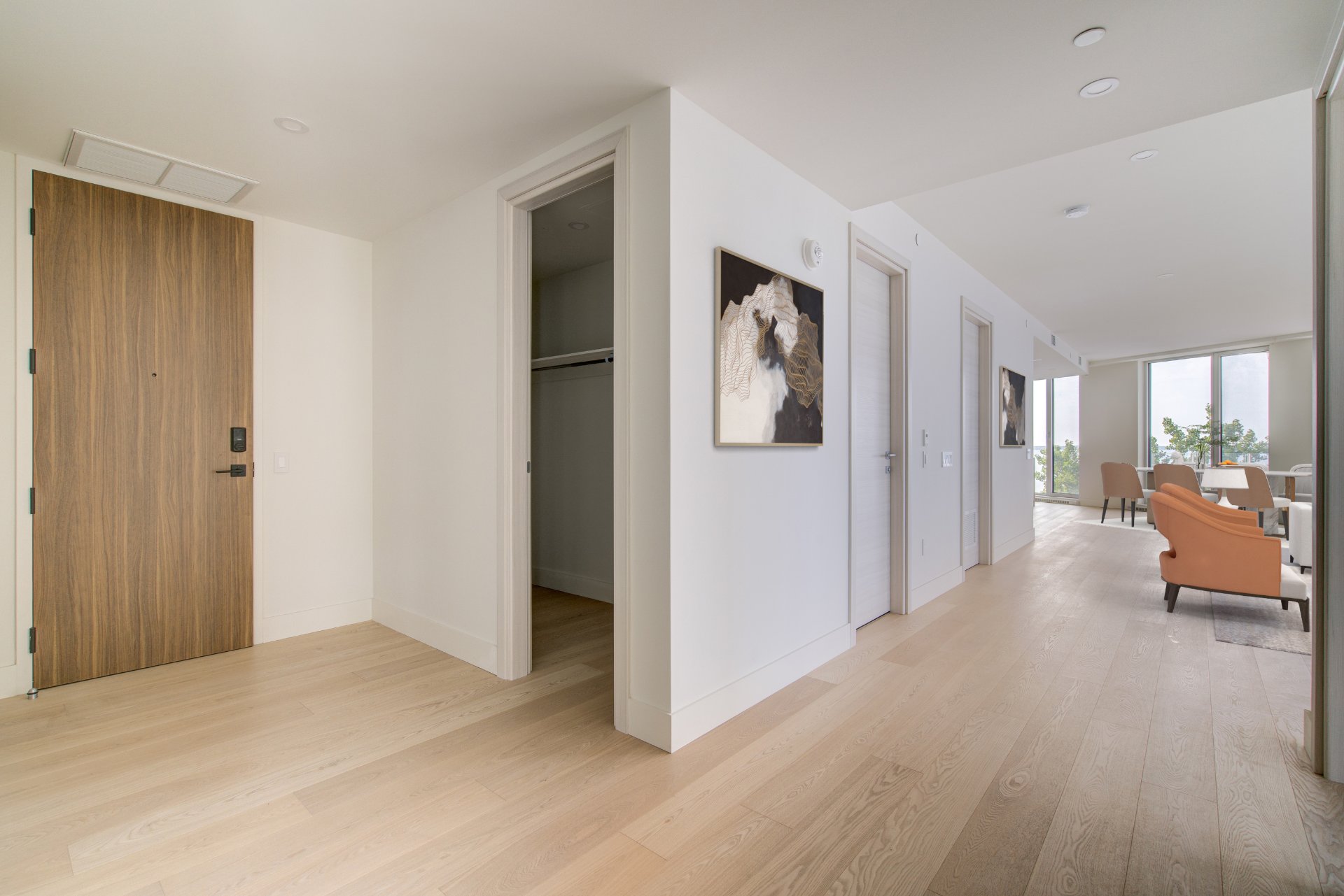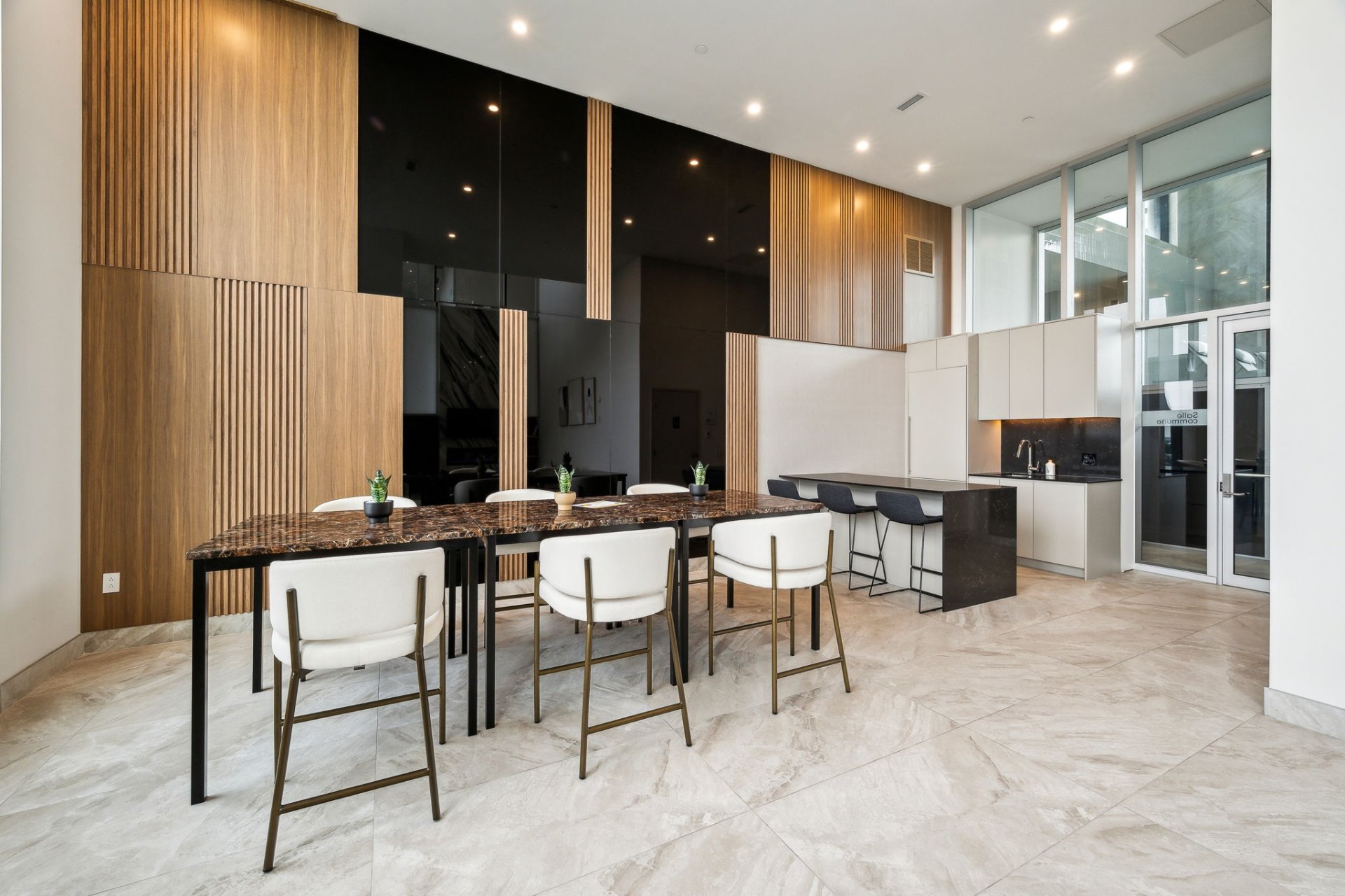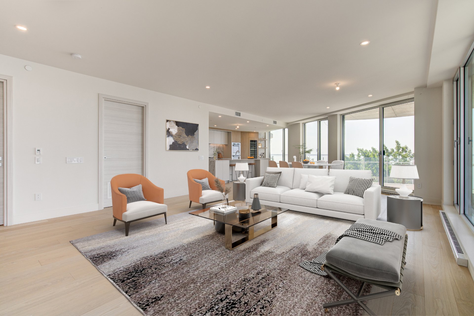 Miele double ovens, Miele gas cooktop with five burners (including a wok burner), Miele refrigerator, Miele dishwasher, 70-bottle wine cellar, electric fireplace, Sharp microwave drawer, two indoor parking spaces, a...