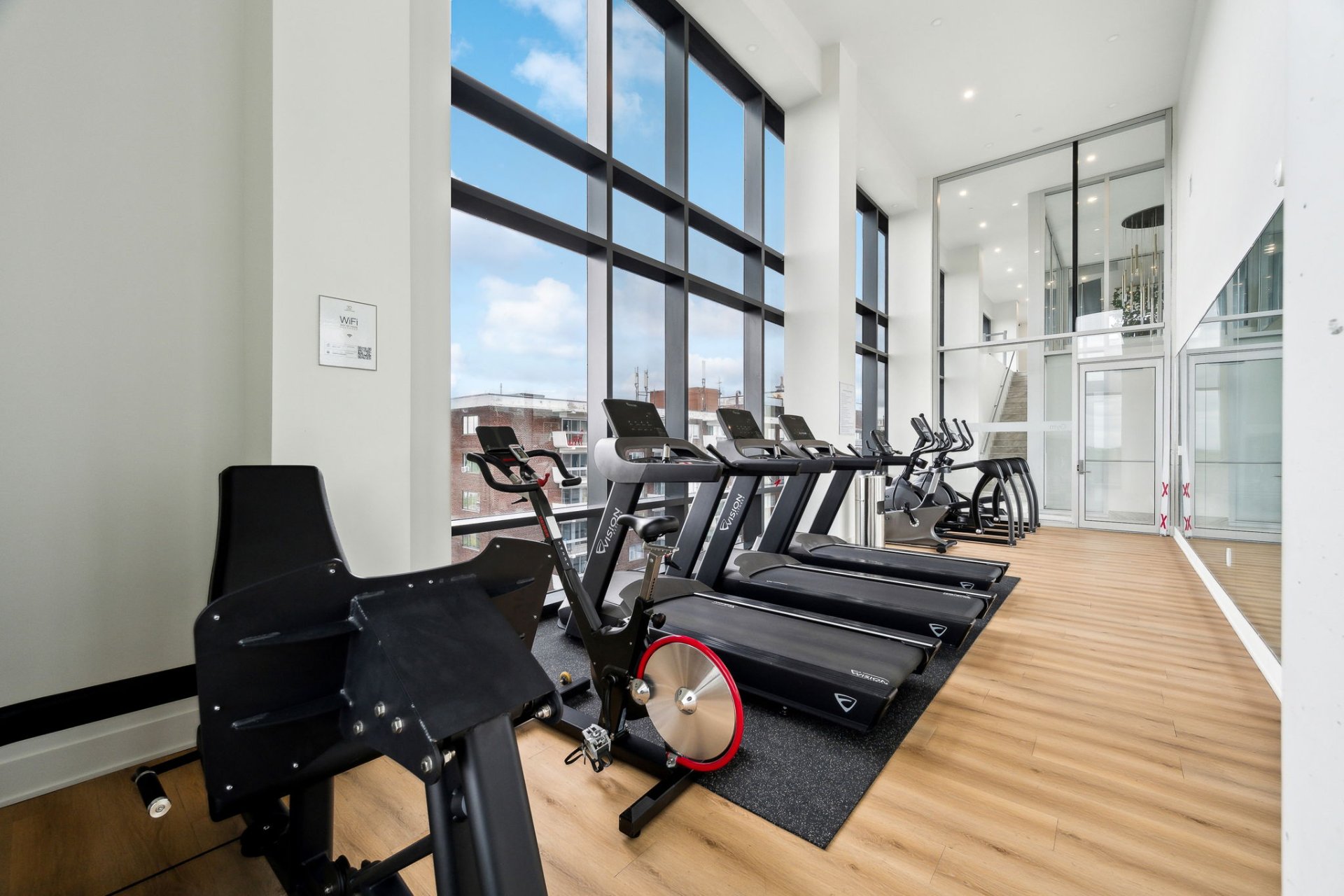 Miele double ovens, Miele gas cooktop with five burners (including a wok burner), Miele refrigerator, Miele dishwasher, 70-bottle wine cellar, electric fireplace, Sharp microwave drawer, two indoor parking spaces, and a storage locker.