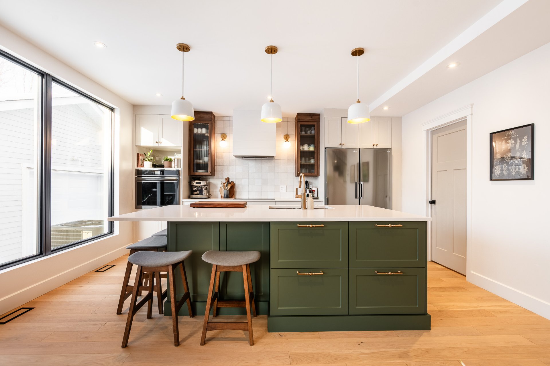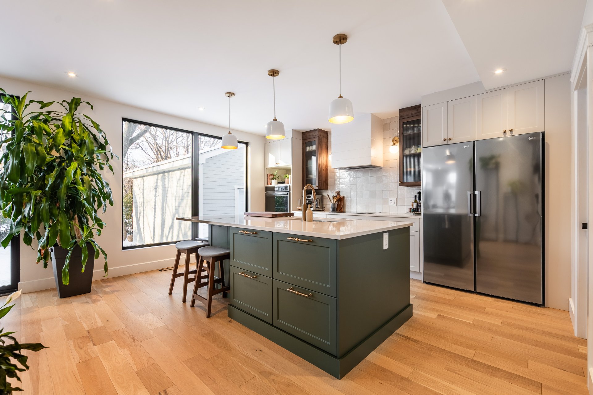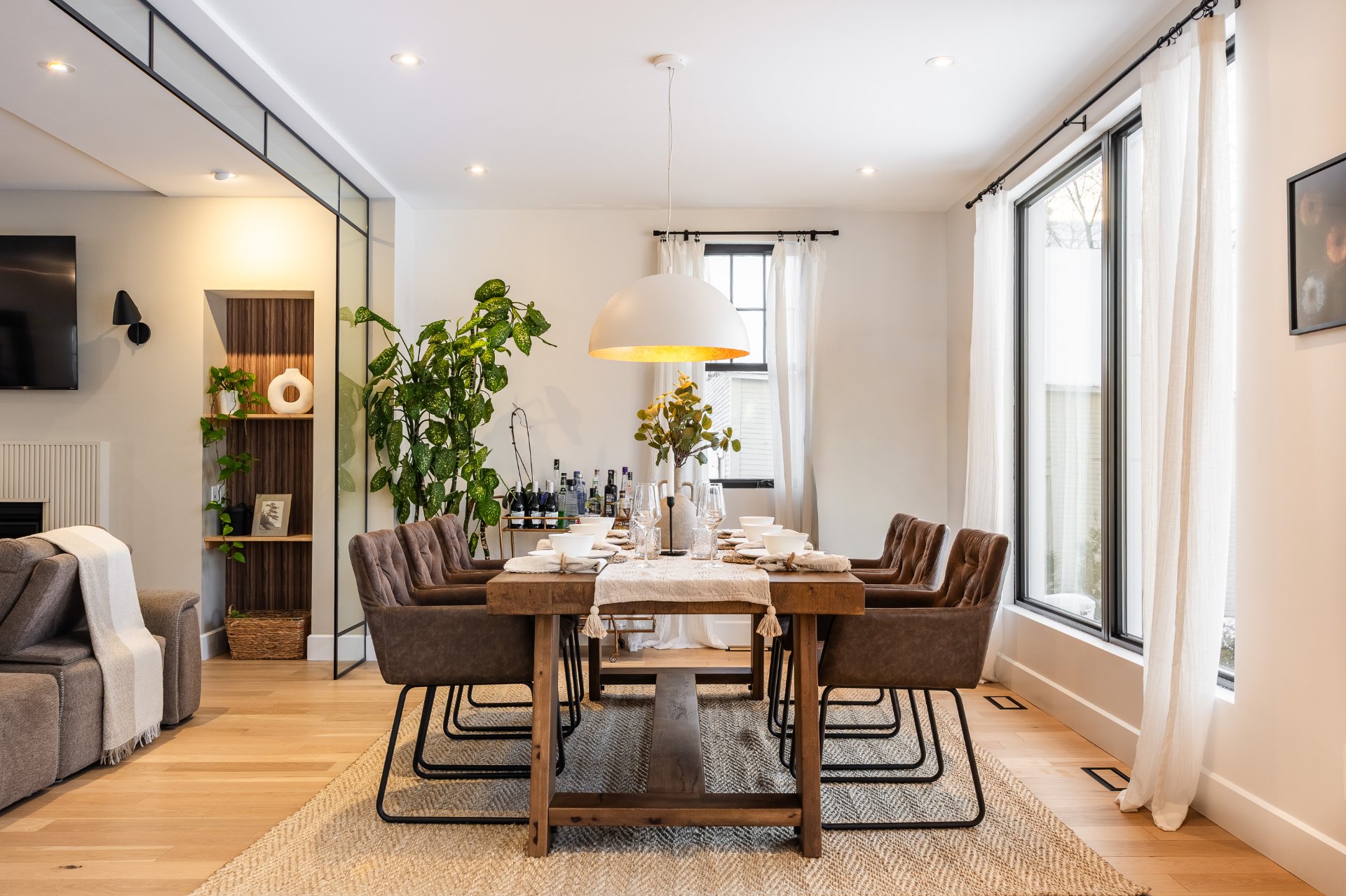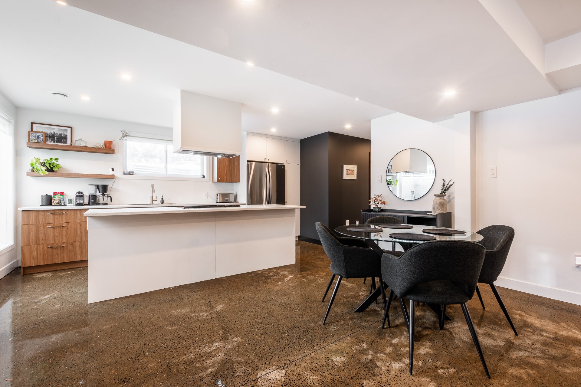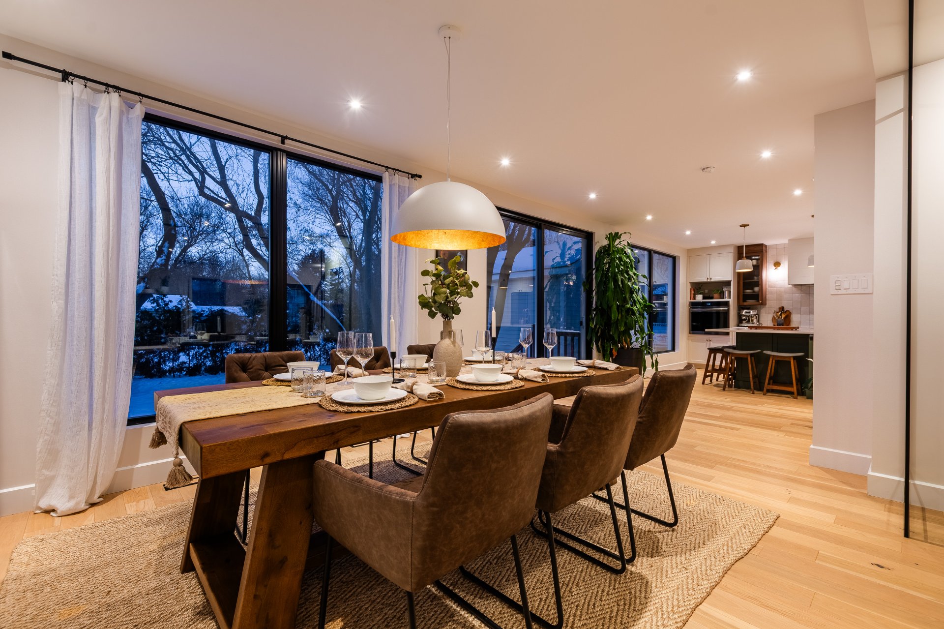 une salle à manger lumineuse ainsi qu'une superbe cuisine