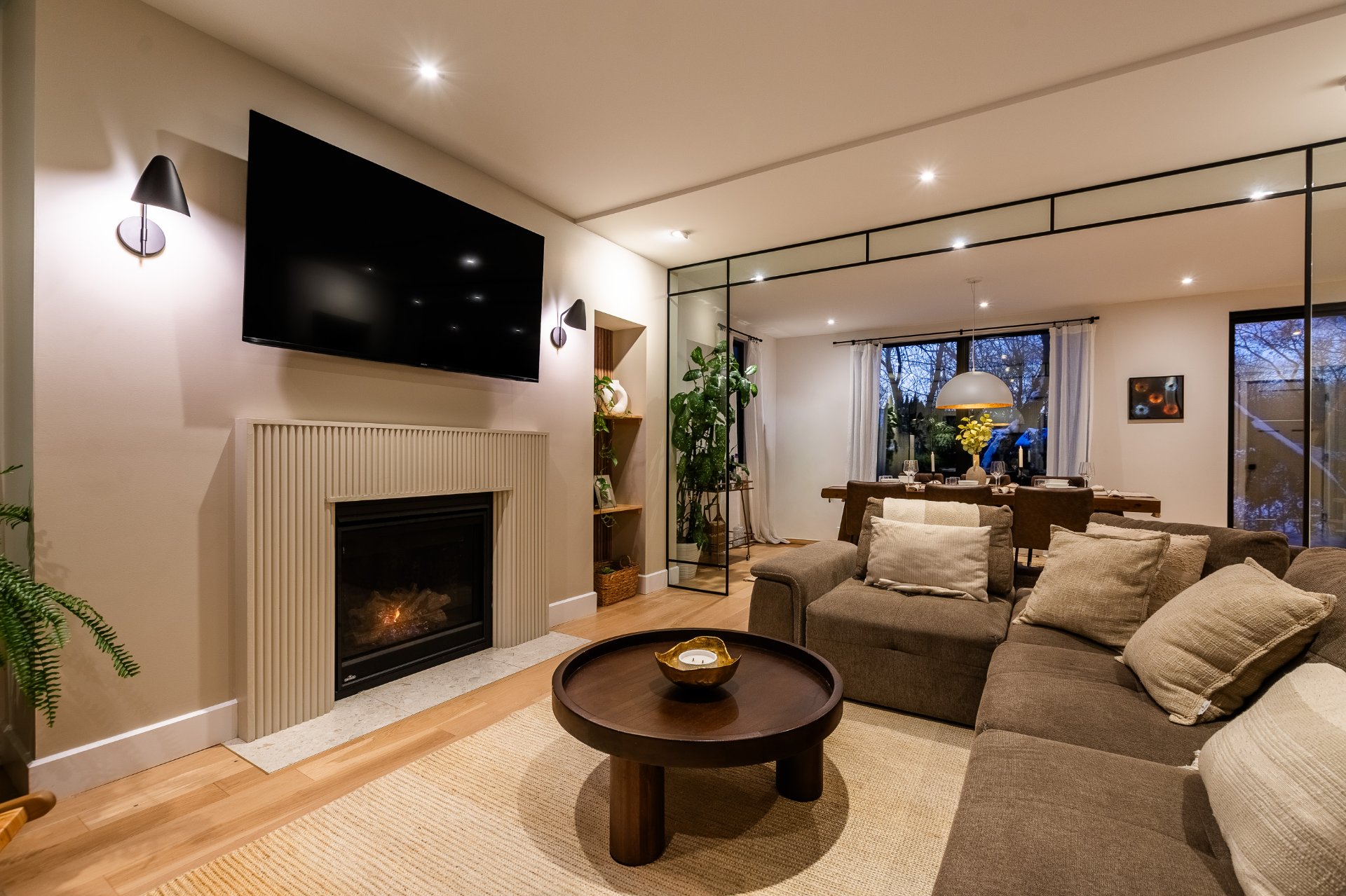 ouverte comprenant un salon chaleureux avec foyer au gaz,